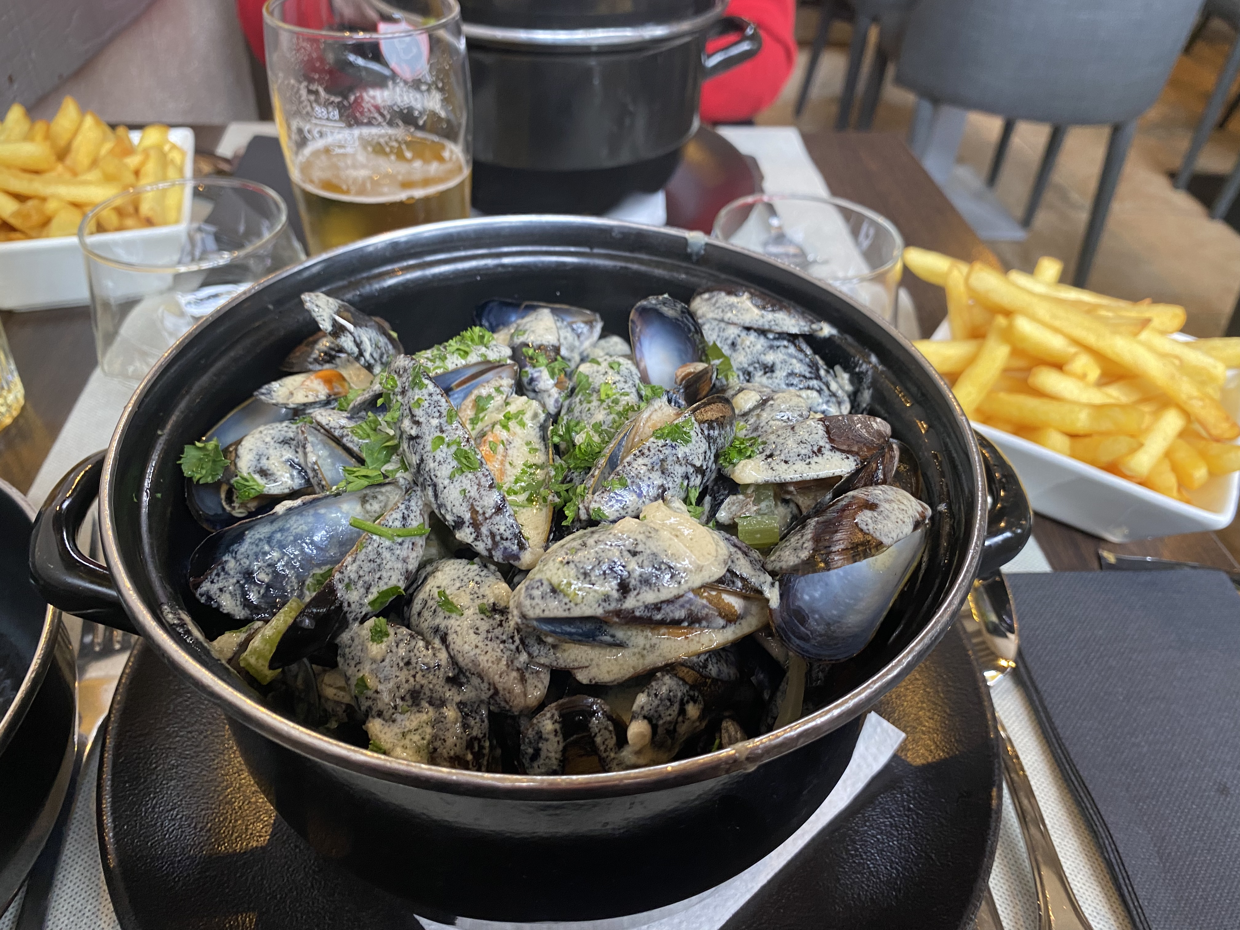Parfait, très bon repas de moules frites marinières, au chorizo et normandes 😉