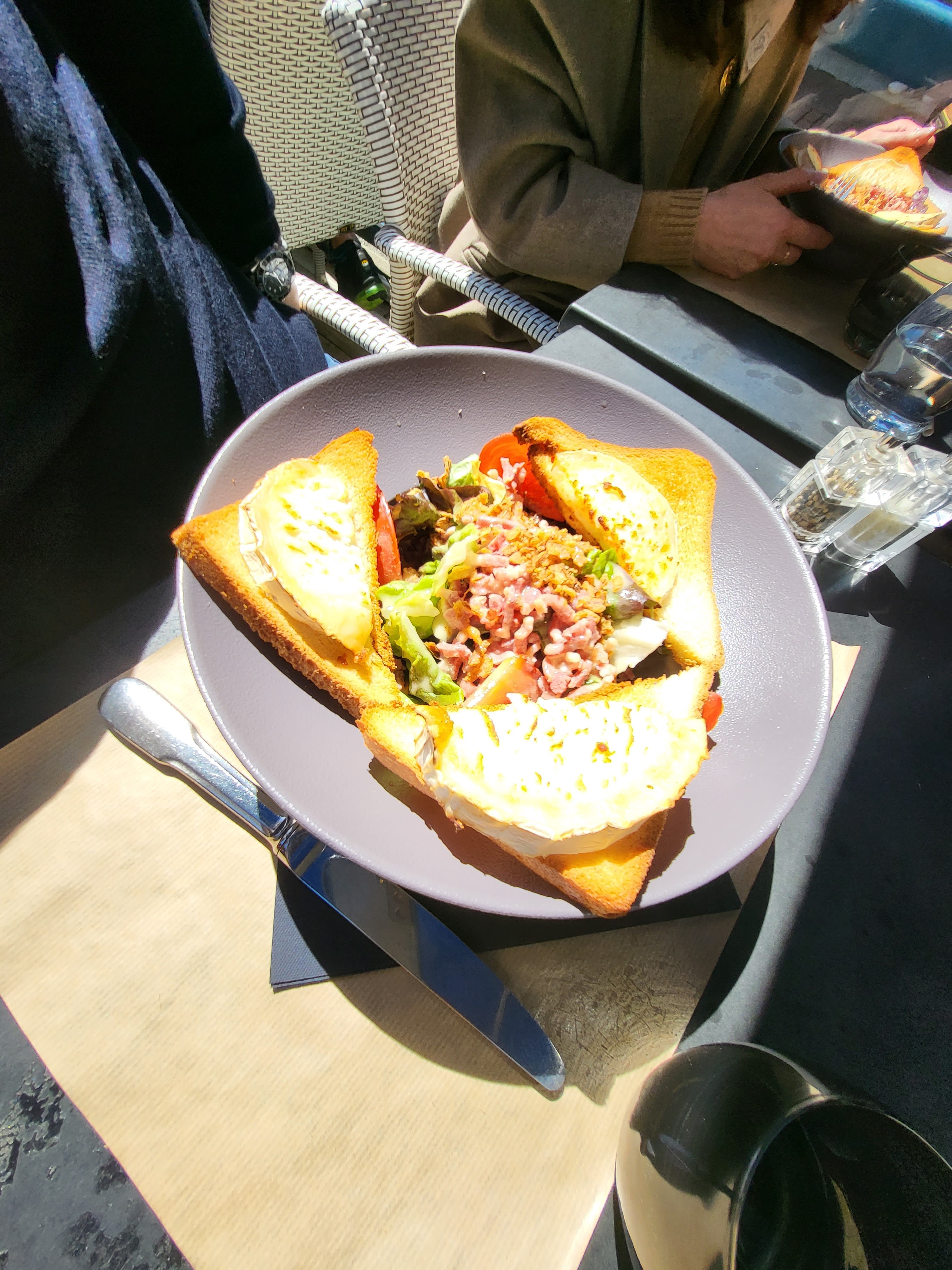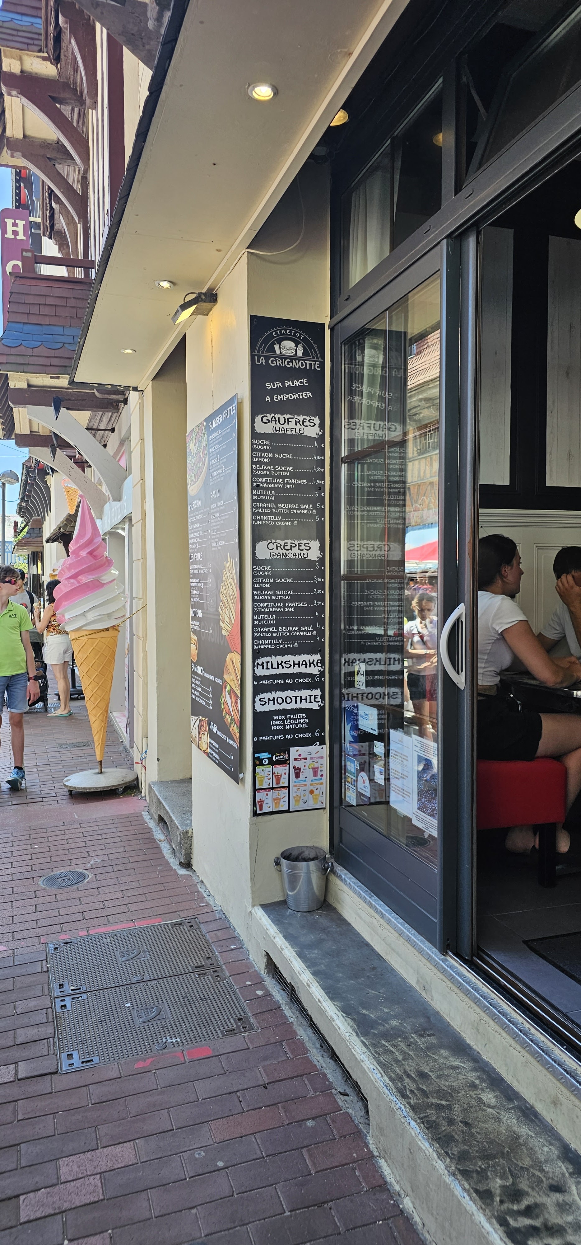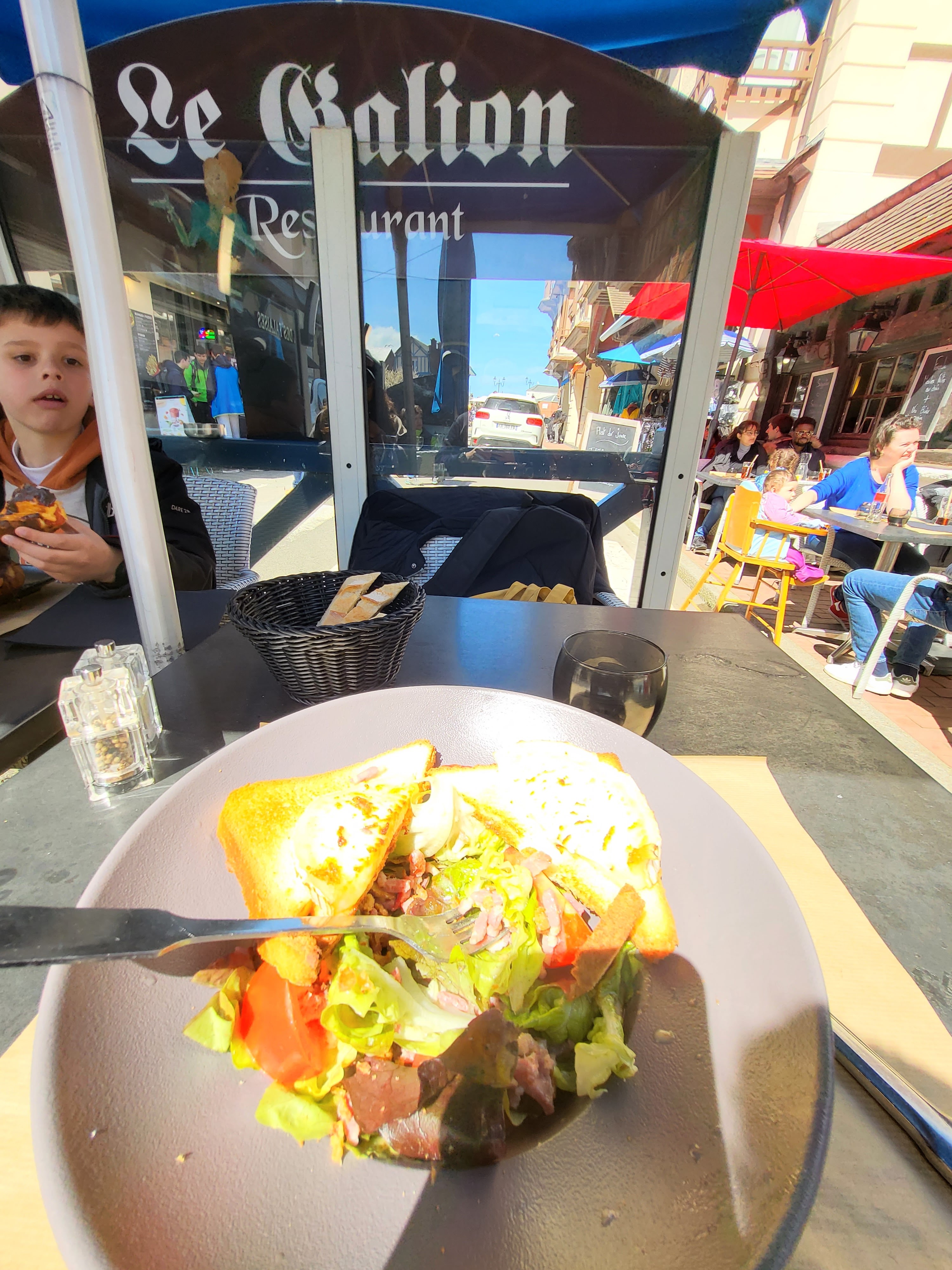 Un des seuls restaurants d’Etretat sans devanture criarde. Cette ville jalonnée de statuettes de gauffres et de cônes de glace en carton-pate. Nous demandons deux cappuccinos et une crêpe, au “caramel beurre salé maison” qui est vraiment resté à la maison. Une crêpe en carton-pate a l’instar du symbole architectural local. J’en profite pour dire quelques mots sur la population, en cette période de fashion week ce fut très enrichissant d’observer les nouvelles tendances, chaussures aux couleurs primaires assorties aux cheveux.