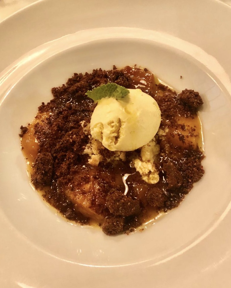 Le Paris Brest a du prendre le train la veille Je l'ai connu superbe de légèreté et de goût Par contre la pêche rissolée avec le crumble était délicieuse Entrée à oubler oeuf mollet trop cuit et goût de l accompagnement indéfinissable et sans charme Portions de loup et d'onglet congrues,purée et frites médiocres. Service en accéléré, bien que charmant.. Moralité: Qui trop embrasse mal étreint Préférez la basse saison avec 1 seul service !! et vous devriez être ravi e.s !!