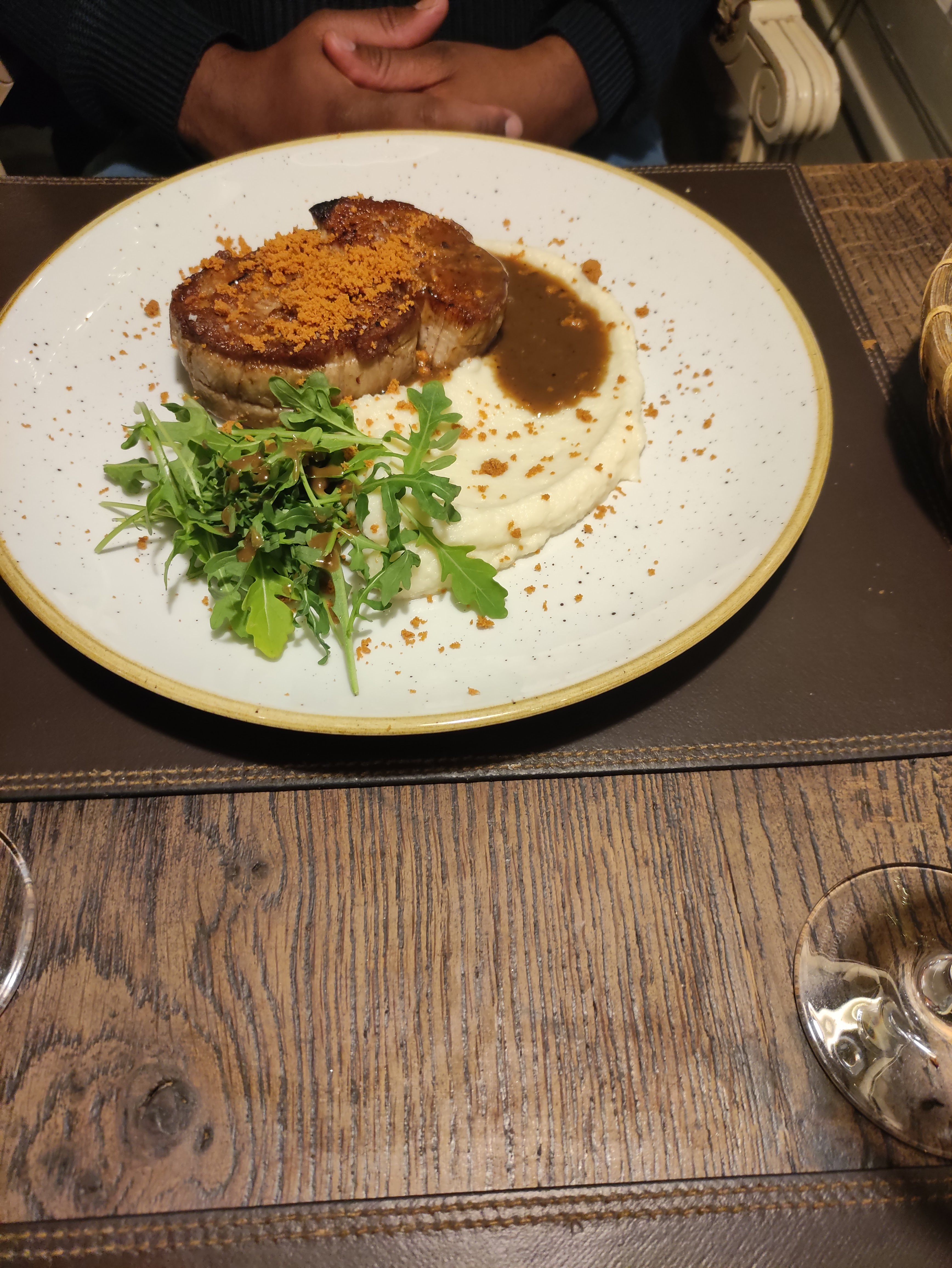 La France comme paradis de la bonne chère, pas partout. Lorsque le Côte de Boeuf merveilleusement frit repose sur une assiette froide, il ne tient pas la promesse de la première impression. Un personnel amical est également quelque chose auquel on pourrait s'attendre dans cette gamme de prix. Malheureusement, tout semble un peu torturé. L'ambiance est agréable et confortable. Malheureusement, c'est dommage qu'il n'y ait pas de retrouvailles.