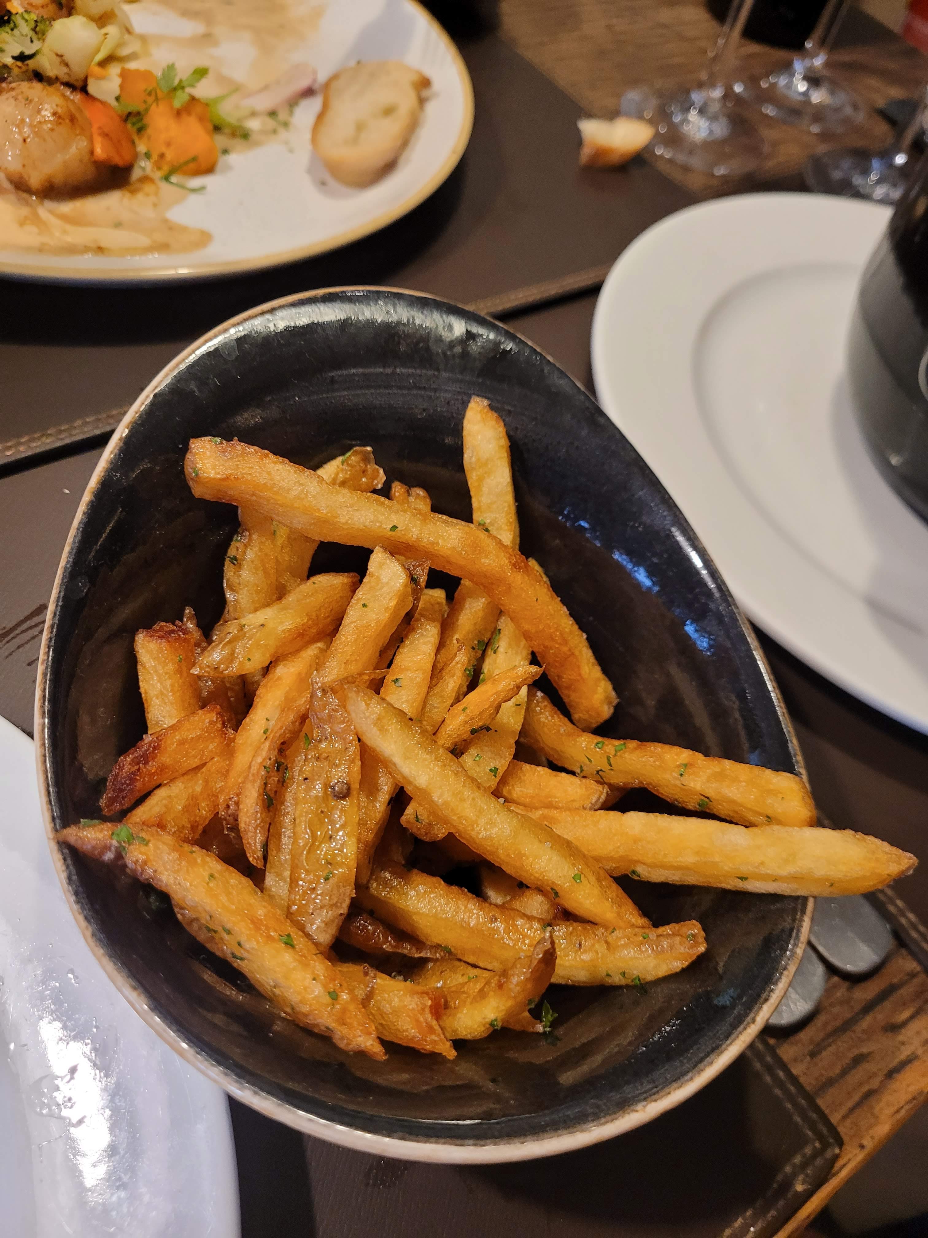 La cuisine est délicieuse, les frites maison sont excellentes ! Vous êtes assis à une table recouverte de blanc et les gens passent. Tout pourrait être très sympa, mais le personnel semble débordé ou peu intéressé. C'est agréable quand quelqu'un vient à table... Nous aurions certainement commandé plus, mais le serveur et la serveuse sont très inattentifs. Les commandes sont oubliées, les tables sont débarrassées tardivement, pas de nouveaux couverts après le premier plat. Dommage ! Un peu plus de convivialité aurait été très apprécié.