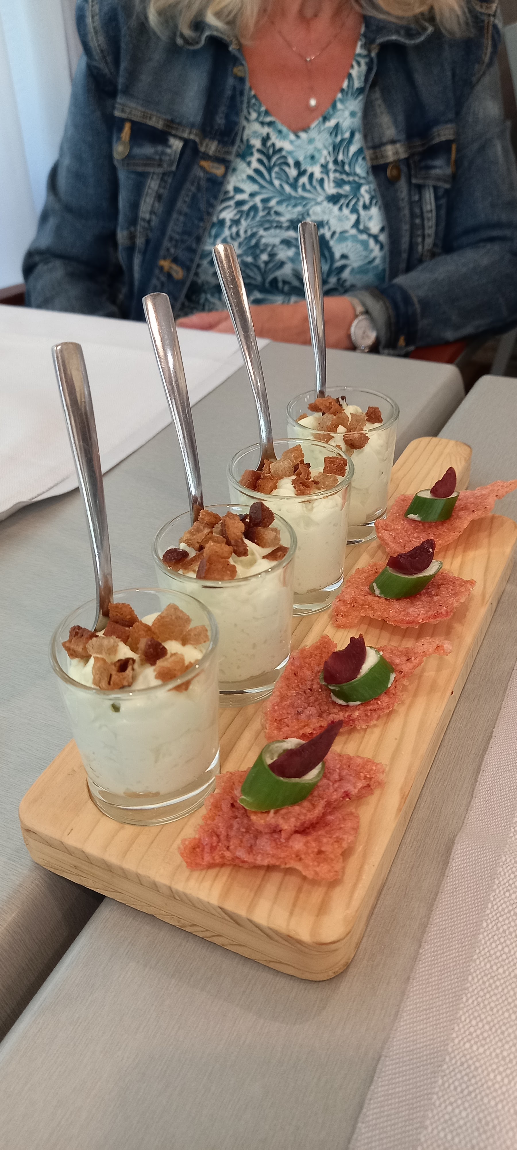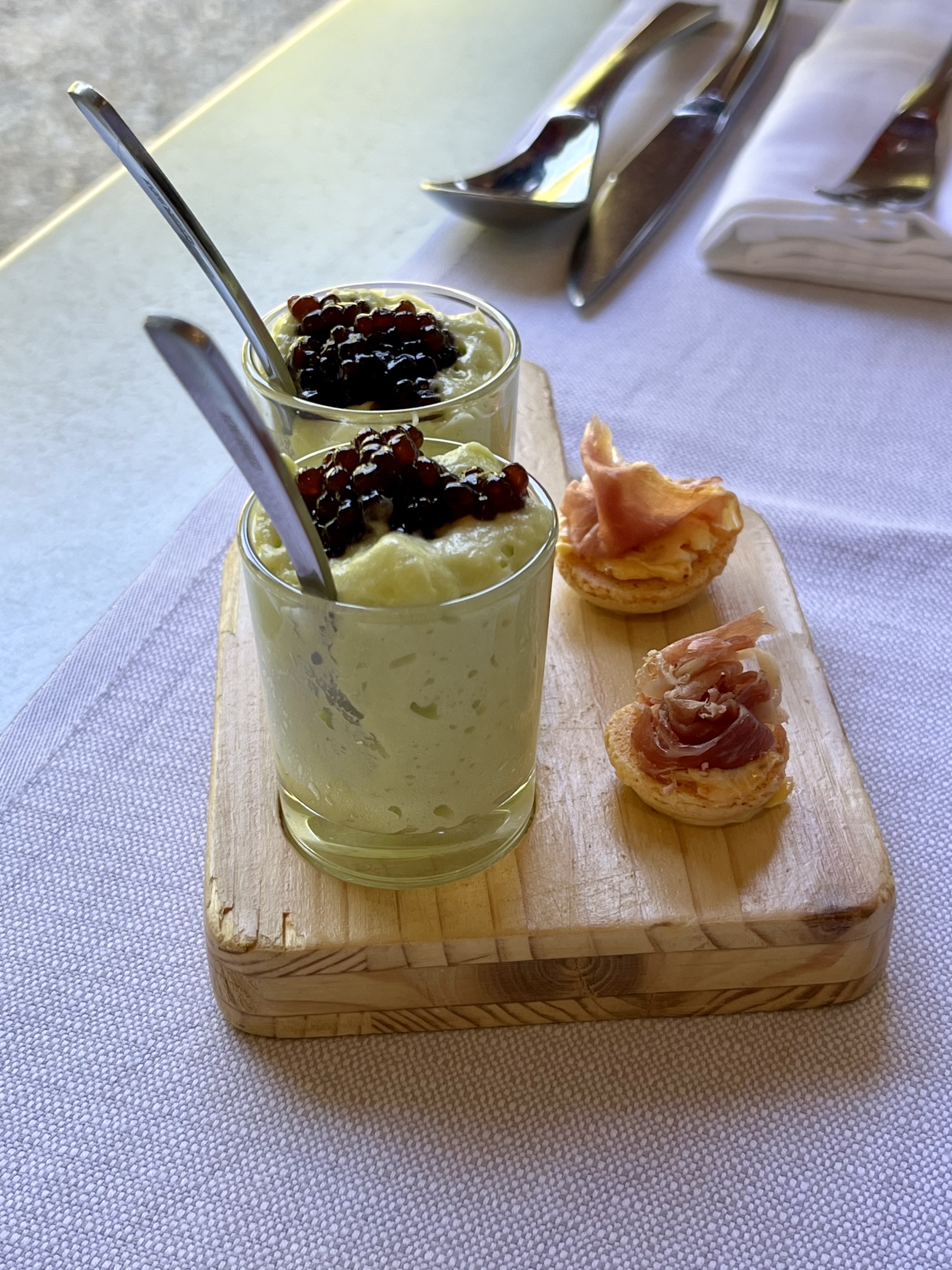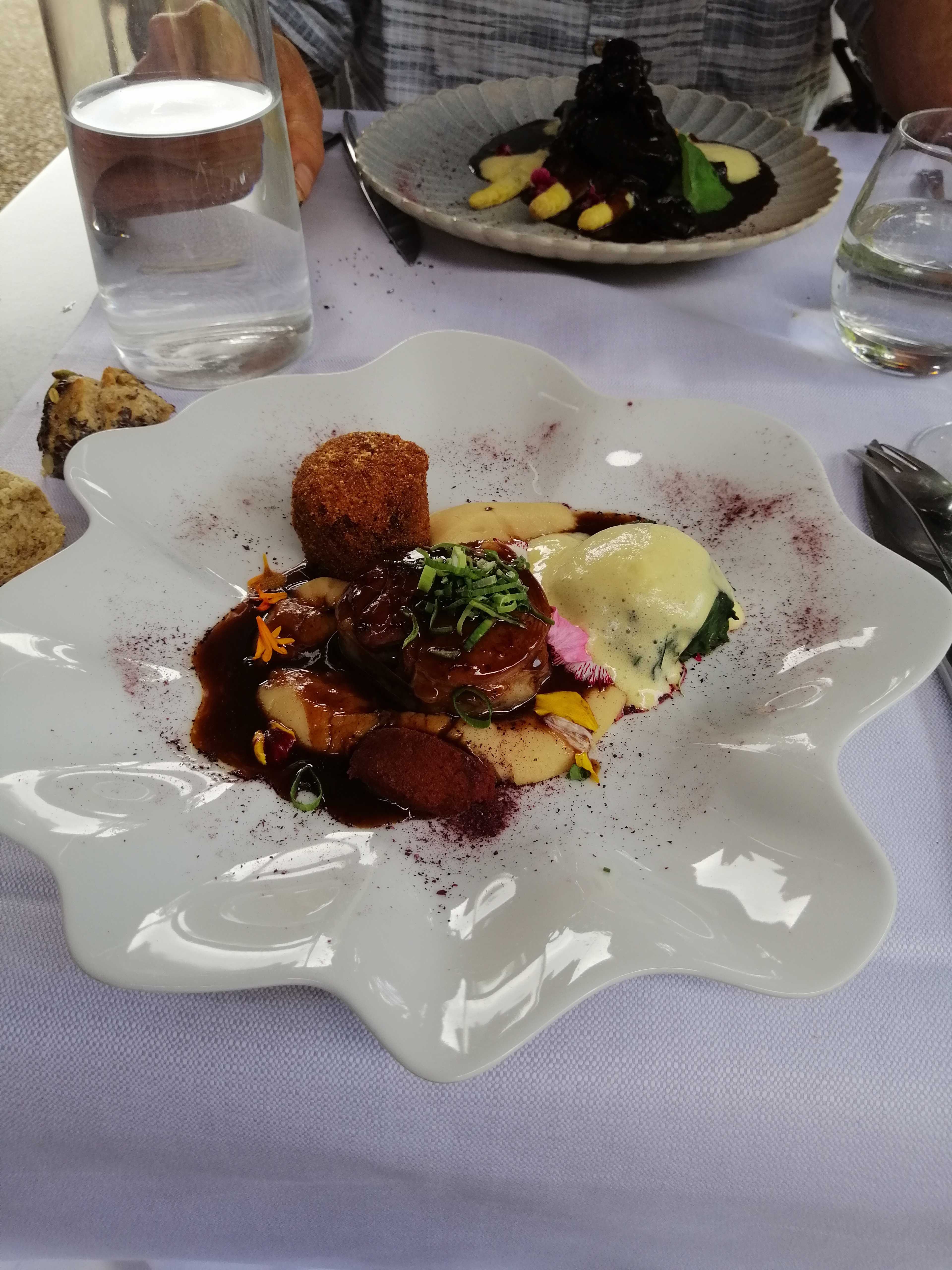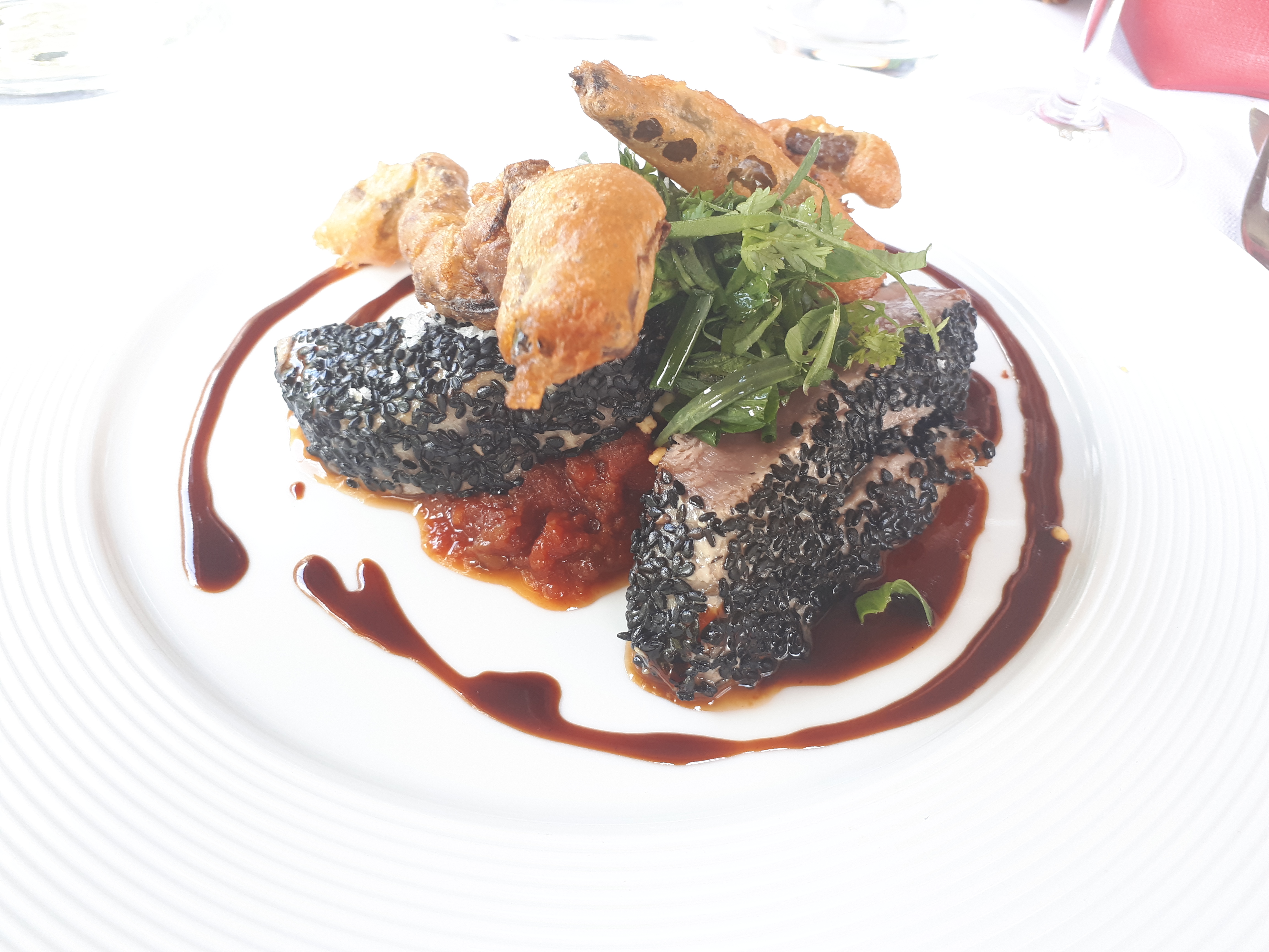 Après des petites verrines très goûteuses une tête de veau revisitée un œuf mollet suivie de maquereau pané sur des cannelloni. Délicieux !
