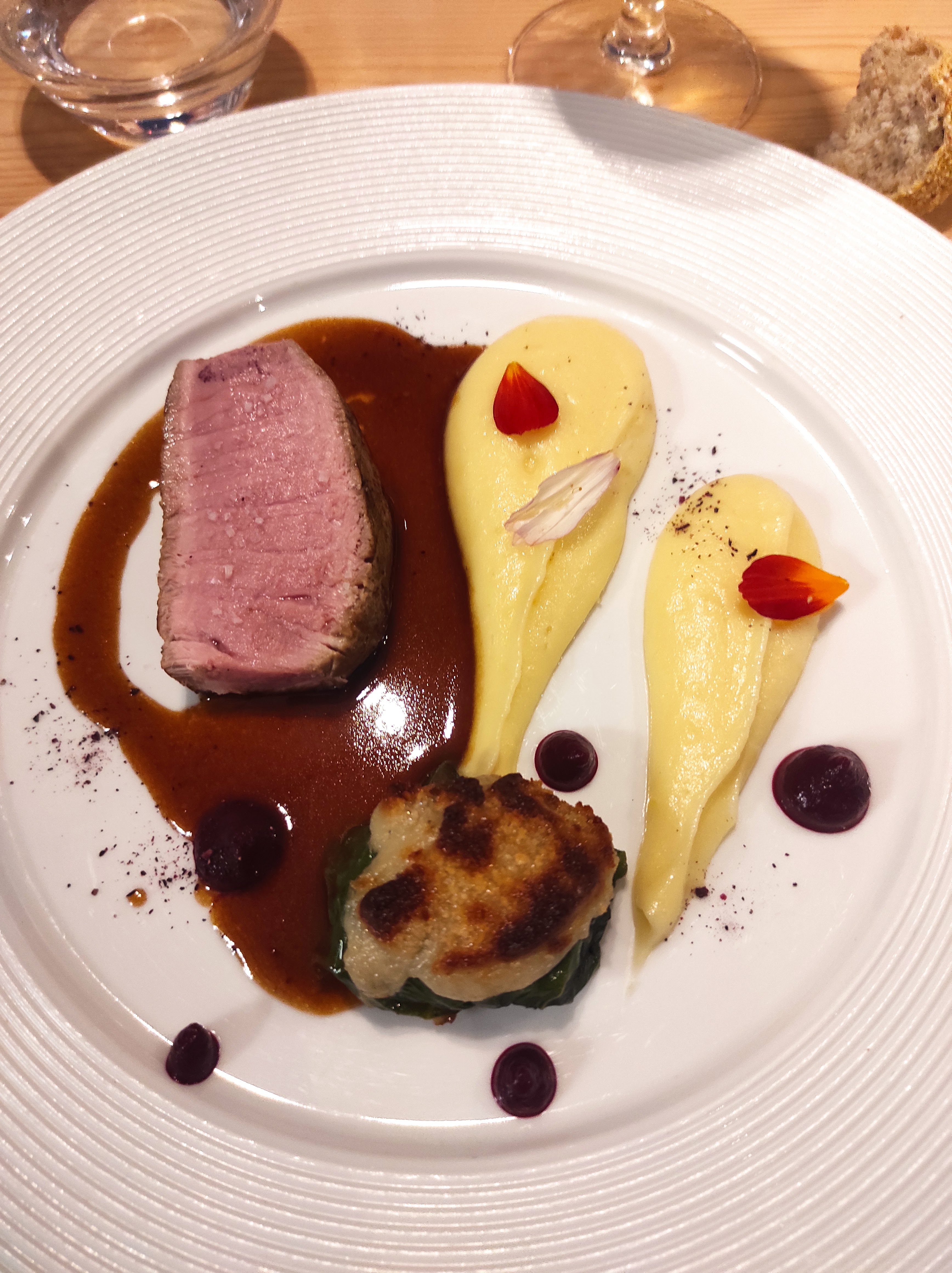 J'ai demandé un menu végétarien (sans viande ni poisson donc) et le chef m'a vraiment bluffé : belle assiette avec lasagne de légumes, épinard farci et croquettes de polenta locale, c'était vraiment délicieux! De l'entrée au dessert, tout était excellent. Le service est impeccable et chaleureux. Un sans faute! Bravo !