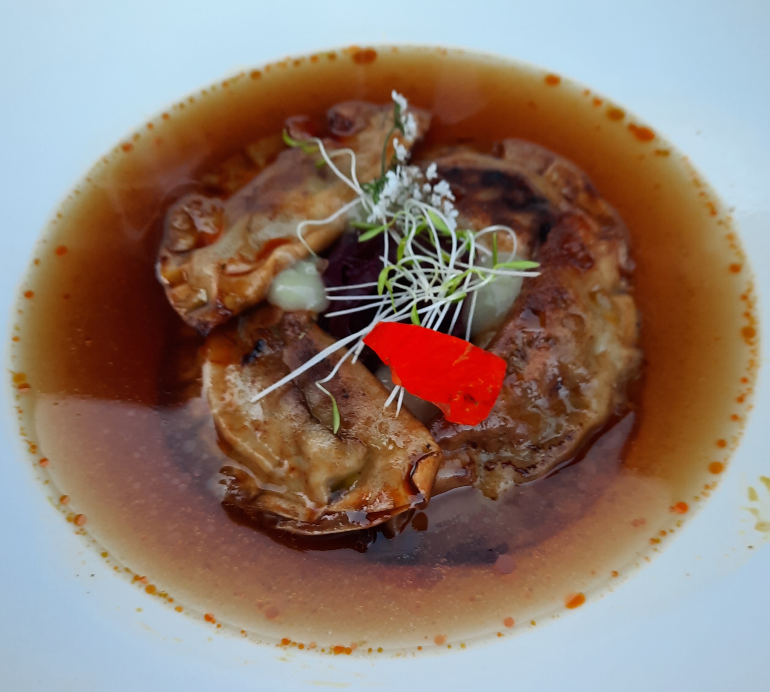 Plats savoureux, parfois surprenant et toujours de bon goût. Cuisine moderne qui n'oublie pas la tradition. Par exemple des ravioles tendres et croquantes à la fois, qui baignent dans un bouillon, couleur bordeaux avec des petites bulles oranges. C'était beau et succulent. Je recommande, comme le fait d'ailleurs le guide Michelin.