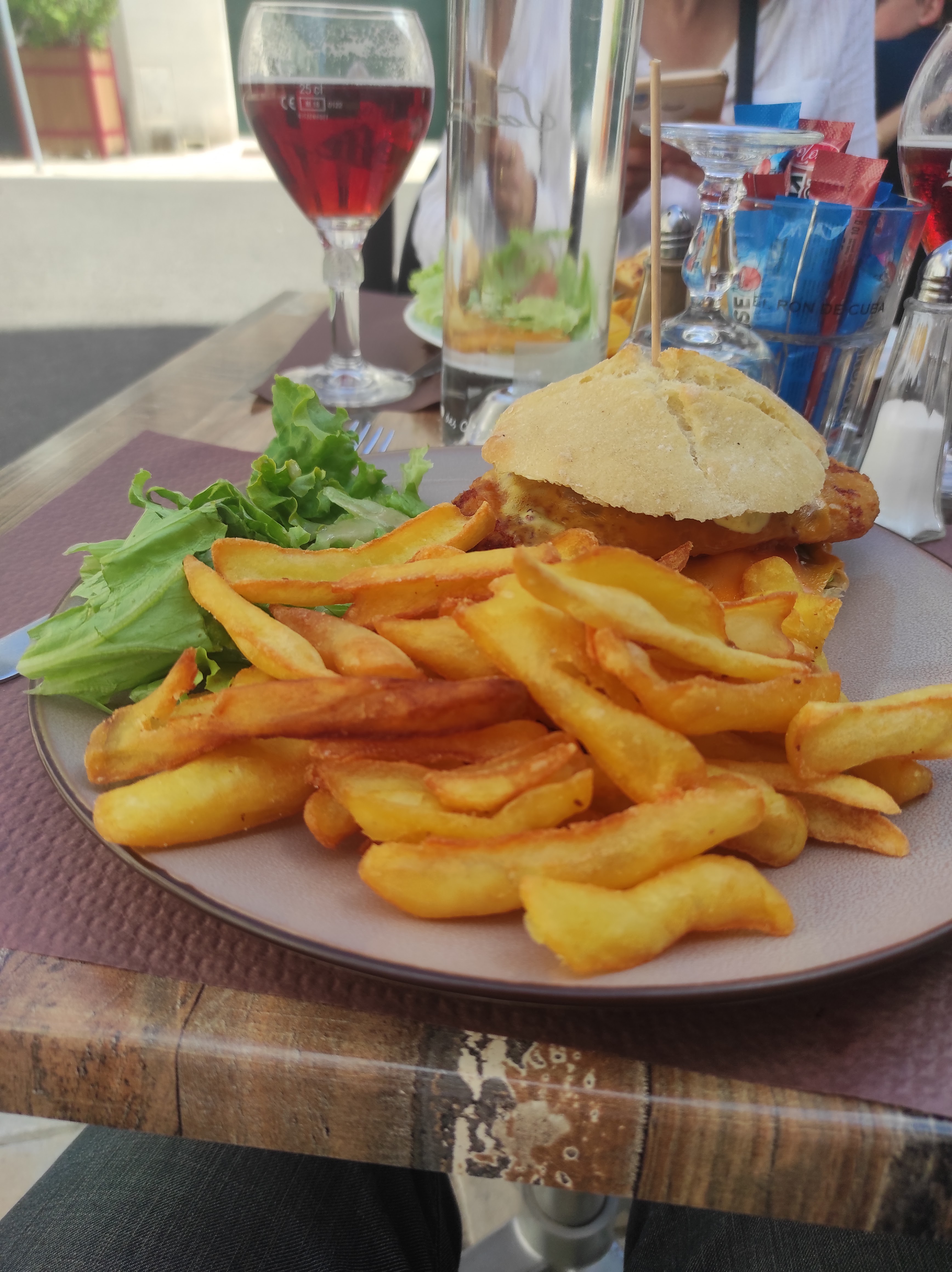 Endroit très sympa avec belle vue sur l'église, différents choix de burger et le ptit bonus, un mignon chien qui se promène entre les tables
