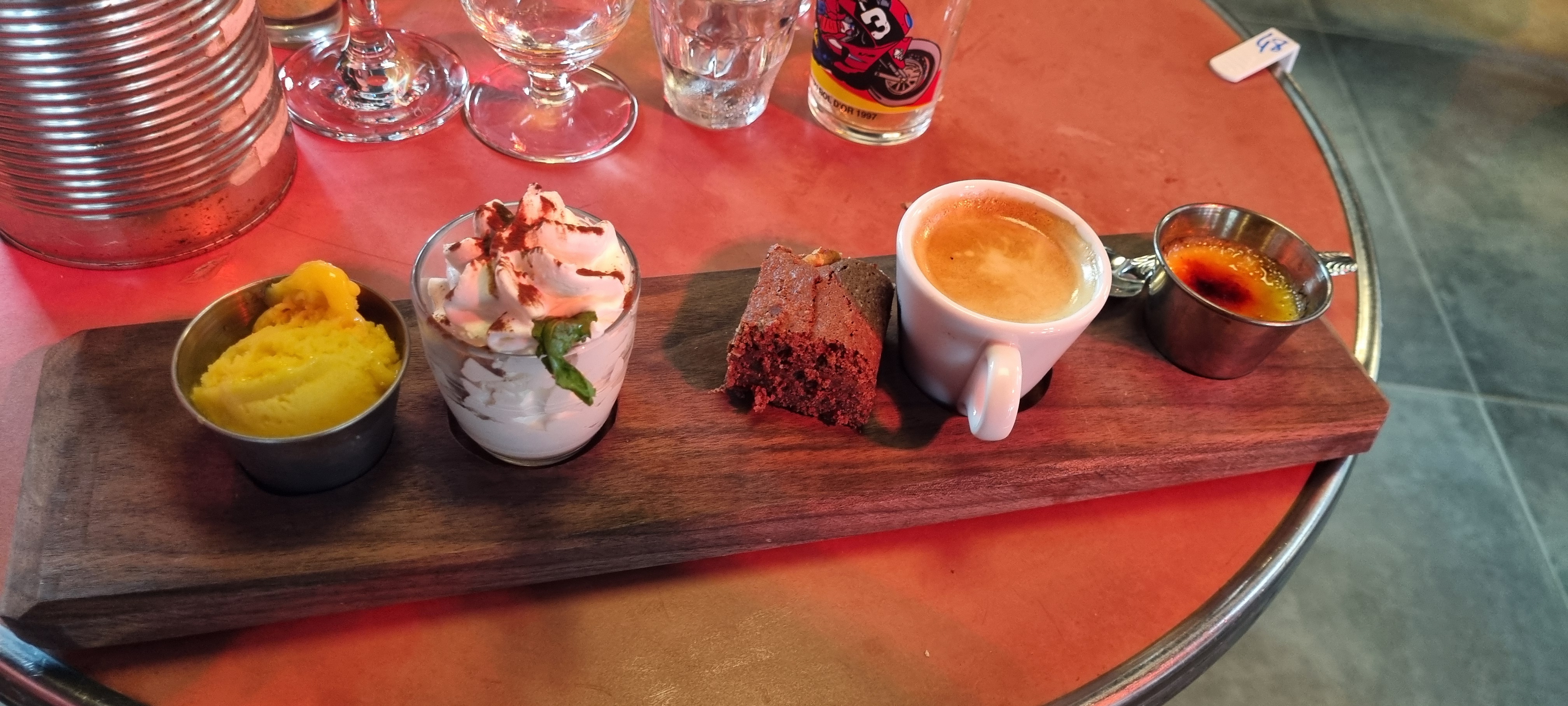 Irisch-café nul. Vu faire au bar. Whisky pas chauffé mélangé au sucre de cane directement . Pas de chantilly au bar , servi dans des verres à pastis 51 . Plus jamais cet établissement !