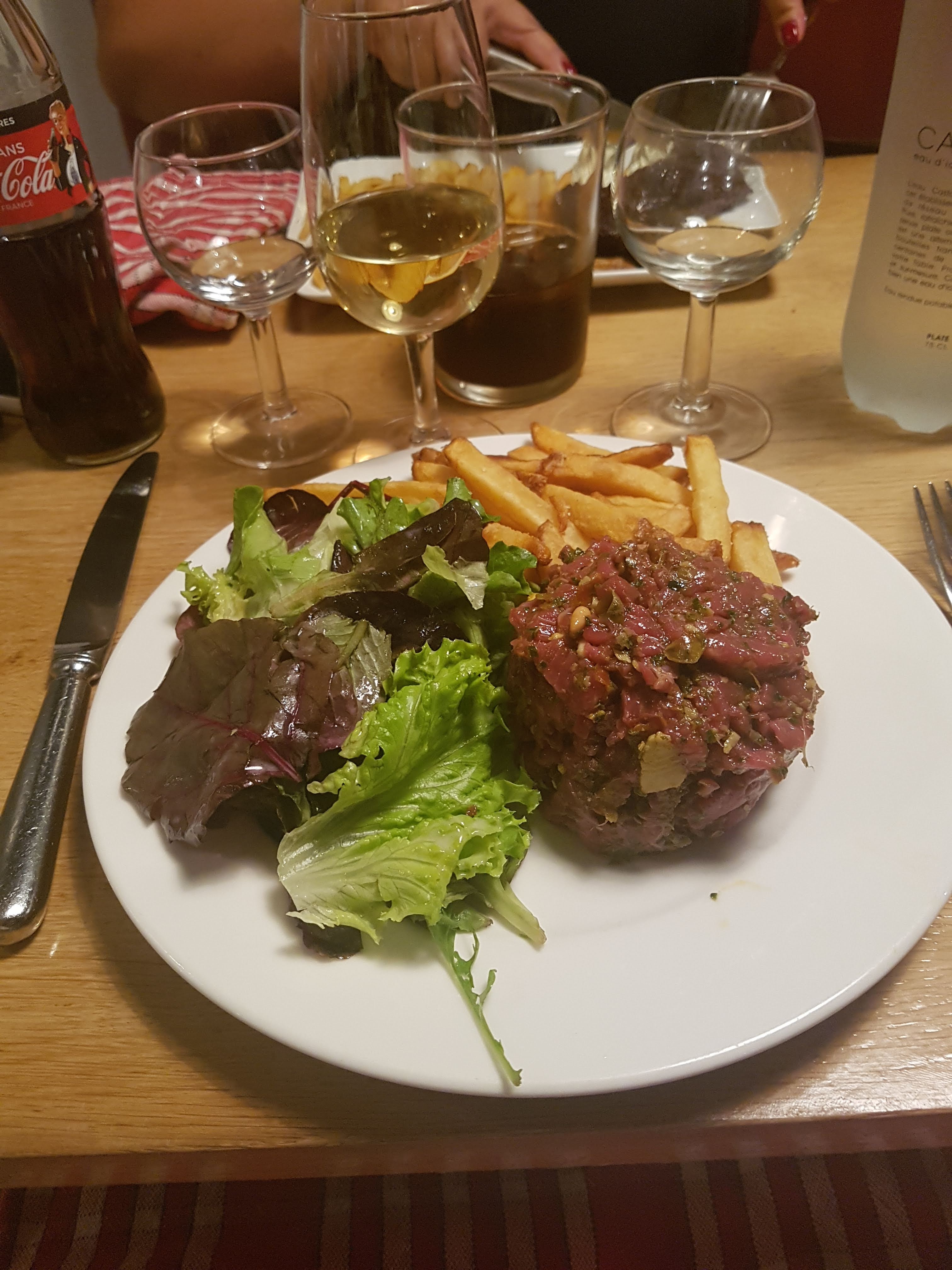 Le tartare est plein de nerfs, caoutchouteux, ce qui est quand même un exploit en soi. Aucun sourire, mais à Paris, est-ce étonnant? Non, mais ça aurait au moins justifié une seconde étoile, pour l'effort. Pas de place, constamment bouscoulé pendant 1h30.