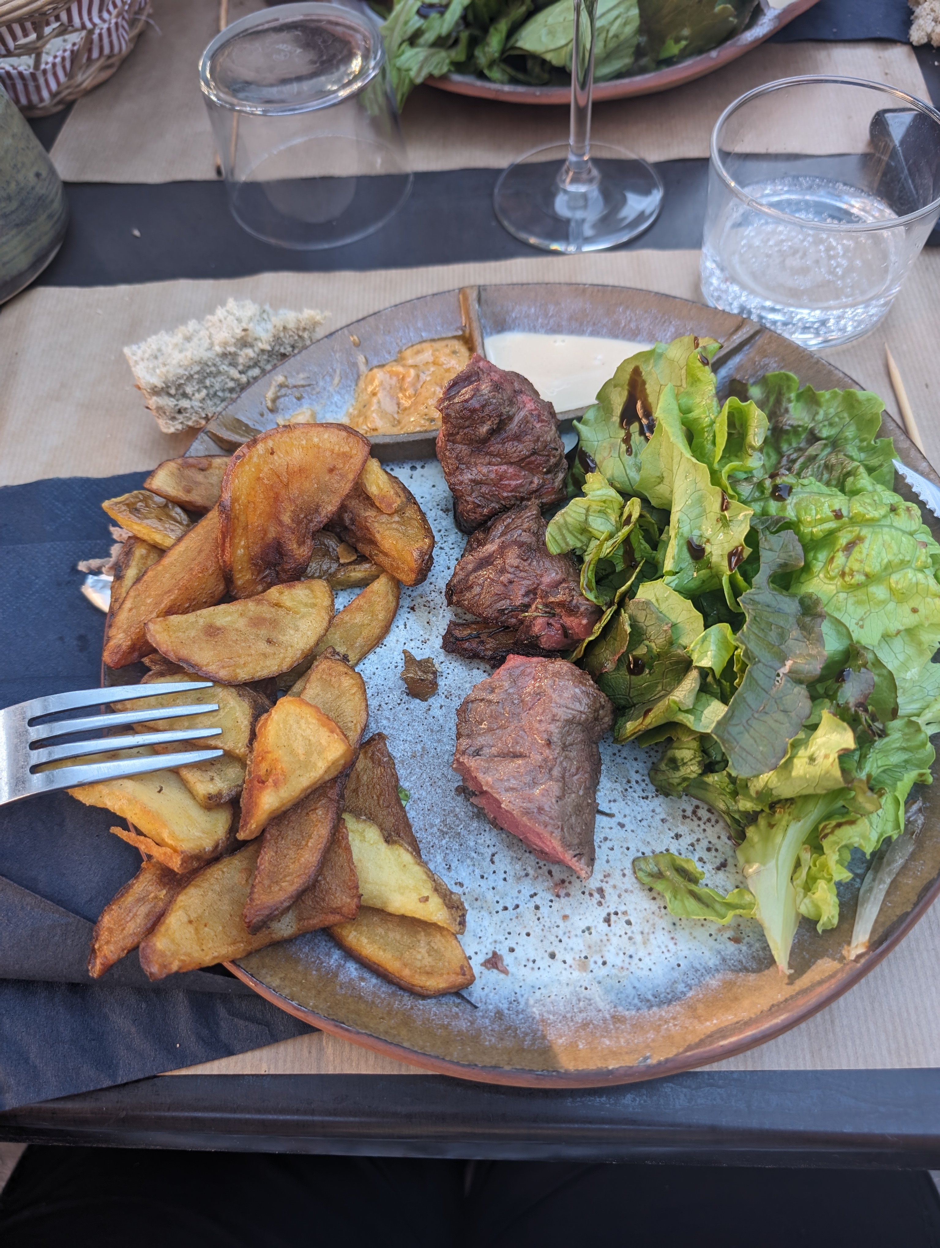 Un recoin tranquille et agréable au calme et au frais. Le restaurant est très familial avec une cuisine complètement ouverte sur la salle. Le chef est un vrai passionné de bons produits, ultra locaux et sa superbe cave à viande le prouve. Son pain maison est à tomber !! Nous avions pris le tartare (j'en salive encore). Nougat glace maison en dessert obligatoire. Bonne continuation au chef et on recommande sans aucune hésitation.