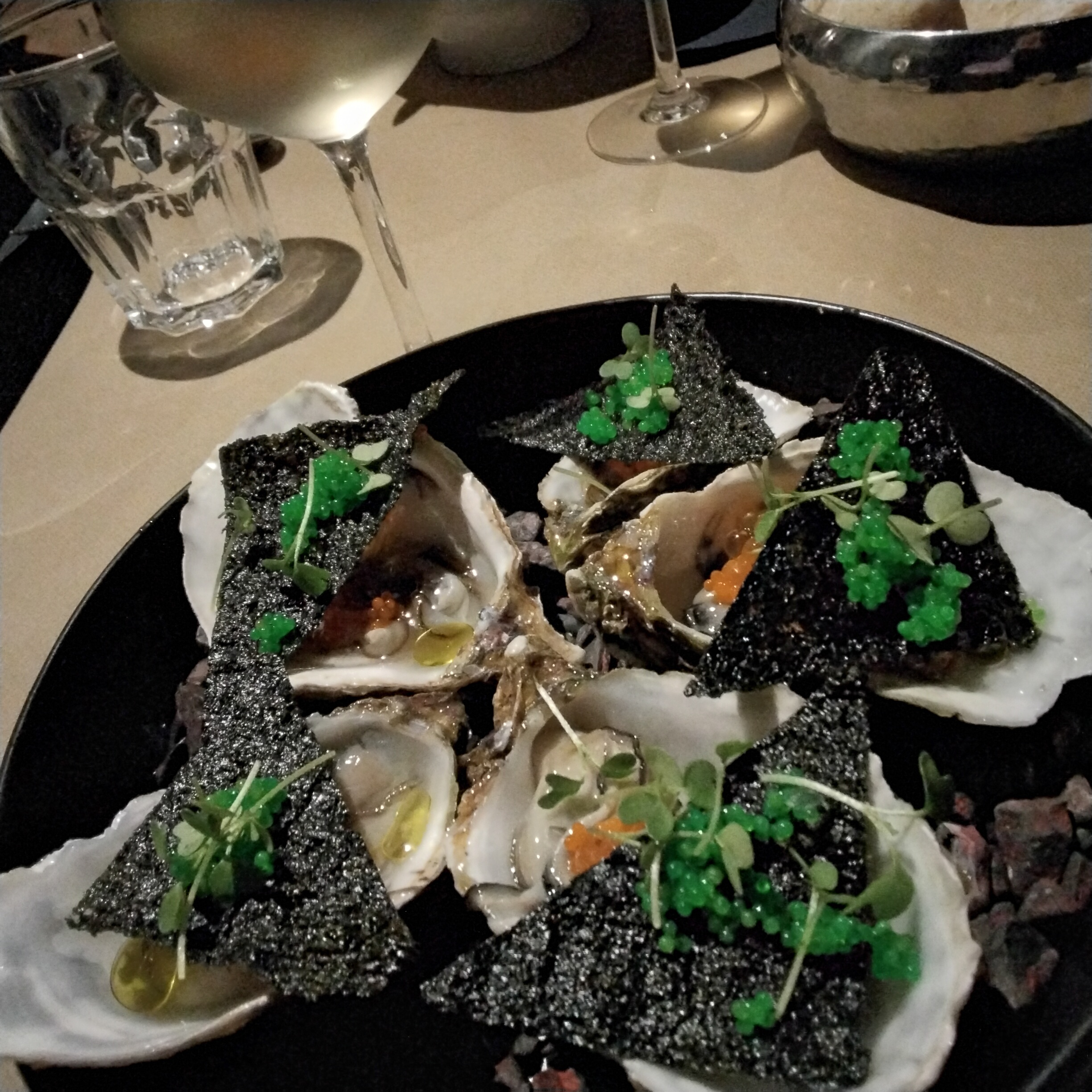 Joli cadre. Nourriture fine et bien présentée. Le concept de plats partagés est innovant, très original mais très mal mis en oeuvre : 3 coquilles saint Jacques pour 2 personnes, 3 petits pavés de boeuf pour 2 personnes . Idem pour les mignardises du dessert. La taille des rations aurait supporté qu'il y en eût 4 et non 3. Absence de legumes d'accompagnement . Rapport qualité prix moyen.