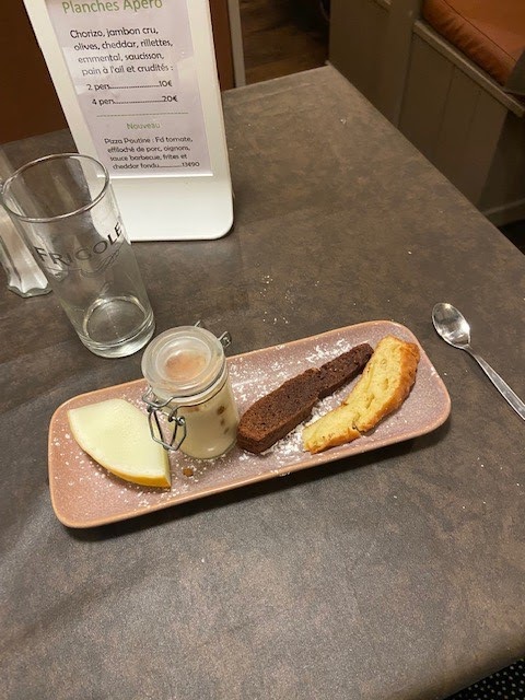 Avons très bien mangé plat boisson dessert pour 14€90..sans oublier les biscuits apéritifs et la petite verrine de potage bien chaud