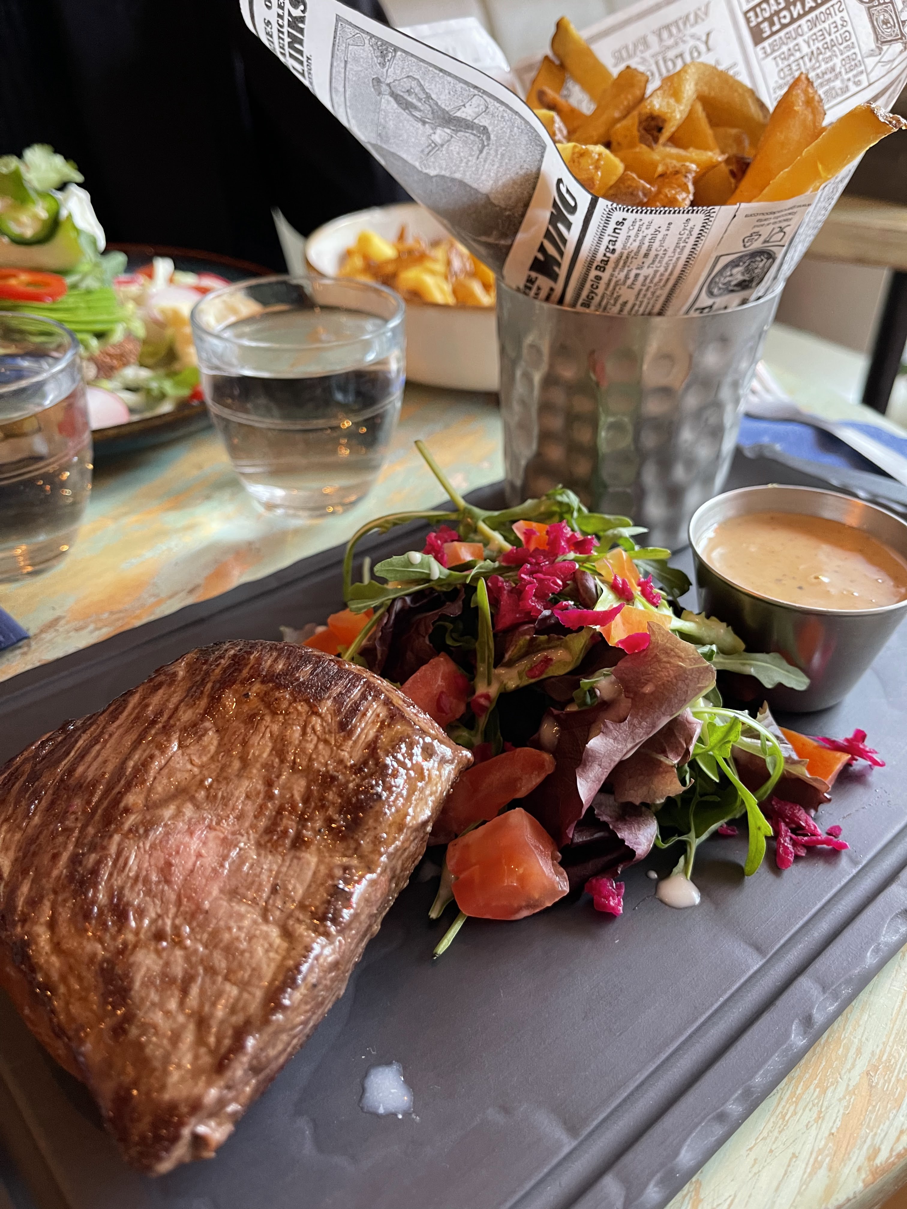 Un très bon accueil, un personnel adorable mais également un service rapide et des plats de qualité. Des snacks à partager pas forcément frais (nous avons pris frites cheddar et poulet croustillant, un peu sec sans sauce) mais les plats eux l’étaient. La pièce du boucher était très bonne et la salade avocat saumon très copieuse et crémeuse. Les cocktails sont tout simplement délicieux, bien fruités et alcoolisés. Je ne peux que recommander !