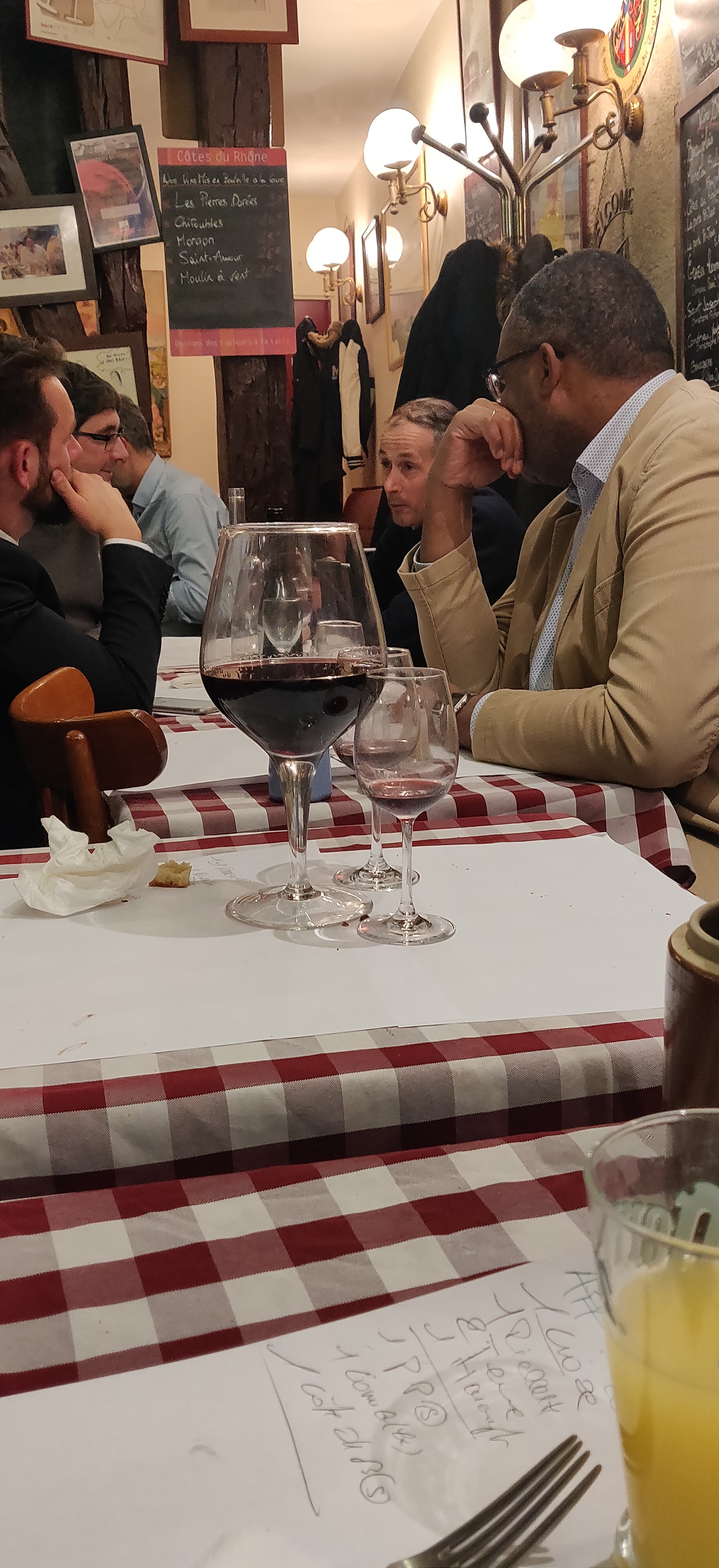 L'authentique bistrot parisien intemporel, rempli très tôt par une clientèle locale d'habitués où le chef d'entreprise partage le pot de moutarde avec le financier ou l'artisan du quartier avec de bons produits du terroir français; les crus du beaujolais sont à l'honneur mais pas que; on y trouve la quintessence de produits locaux: notre planche de charcuterie était aérienne, variée et suffisamment équilibrée pour accueillir sereinement le plat principal (andouillette et pièce du boucher sauce aux poivres) et finir heureux et repus! Forte promiscuité et c'est tant mieux, les râleurs passez votre chemin! Et enfin un bon café ;-)