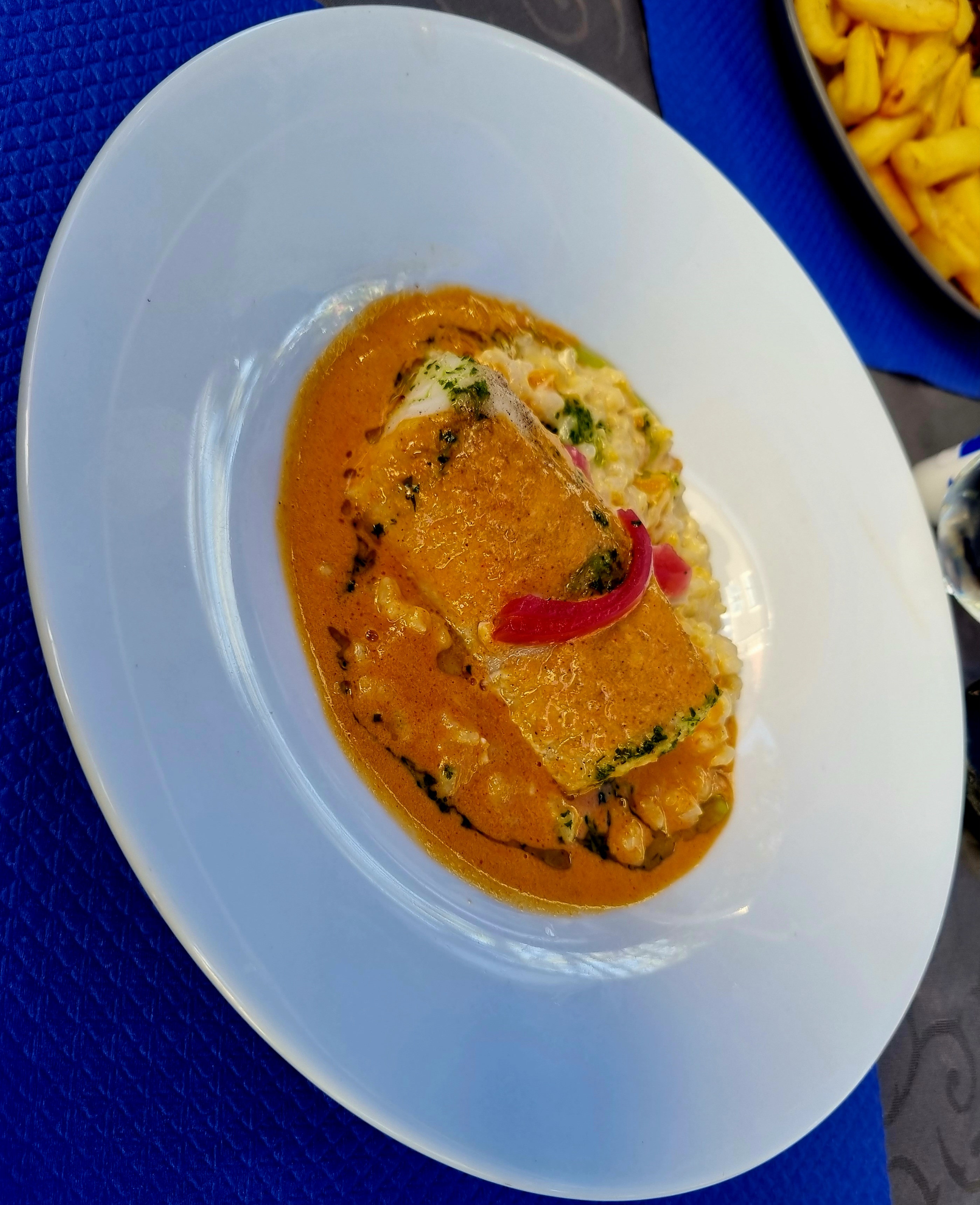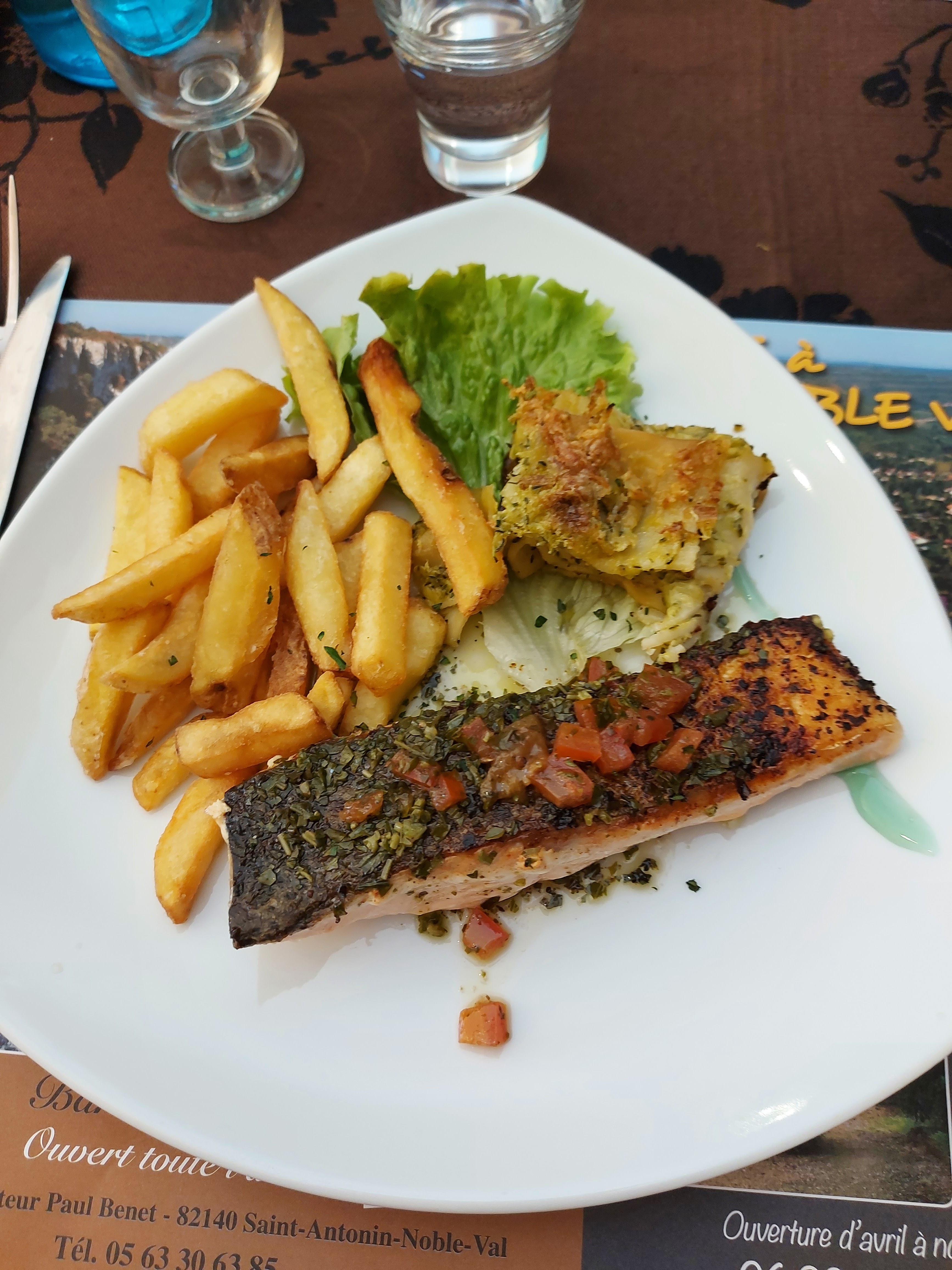 J y ai mangé hier soir, la cuisine est bonne mais pas très raffinée. A mon grand étonnement on y sert des frites avec du poisson, je n avais encore jamais vu ça. J avais choisis du poisson justement pour ne pas manger de frites.