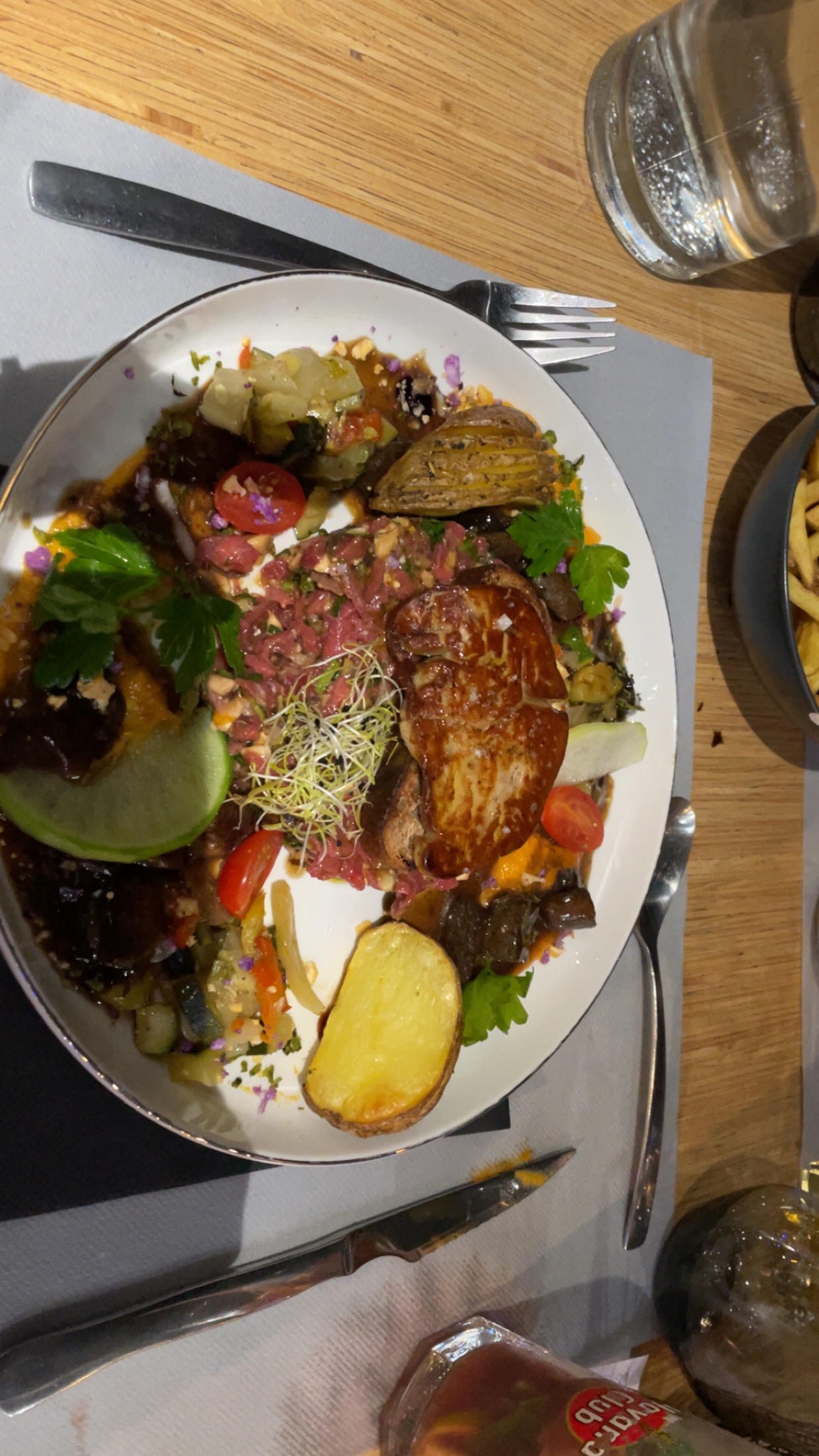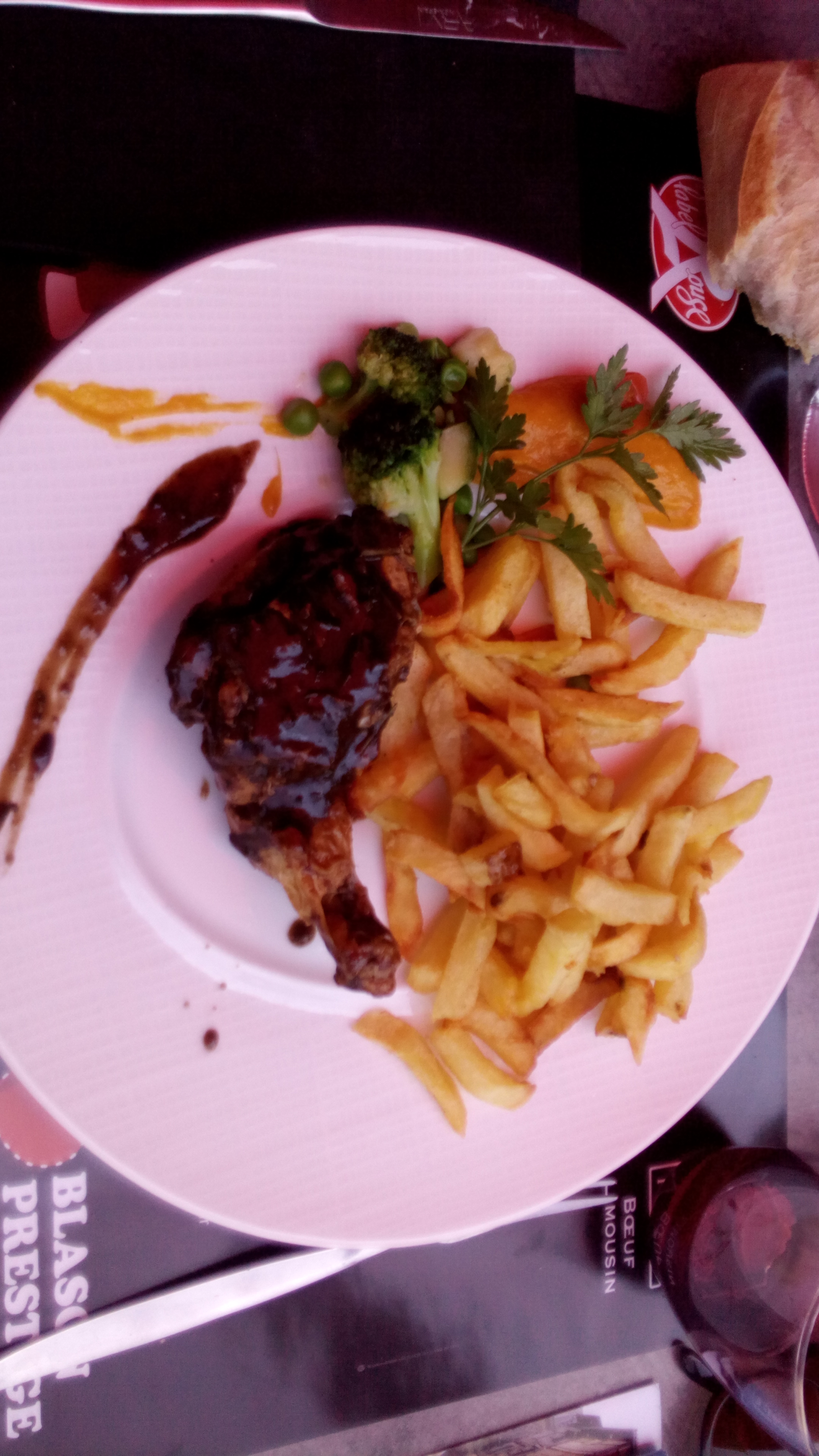 Viande de qualité correcte mais le reste moyen : Sauce, frites etc. Belle présentation du dessert mais un peu fade. Peut être à retester pour un avis plus précis