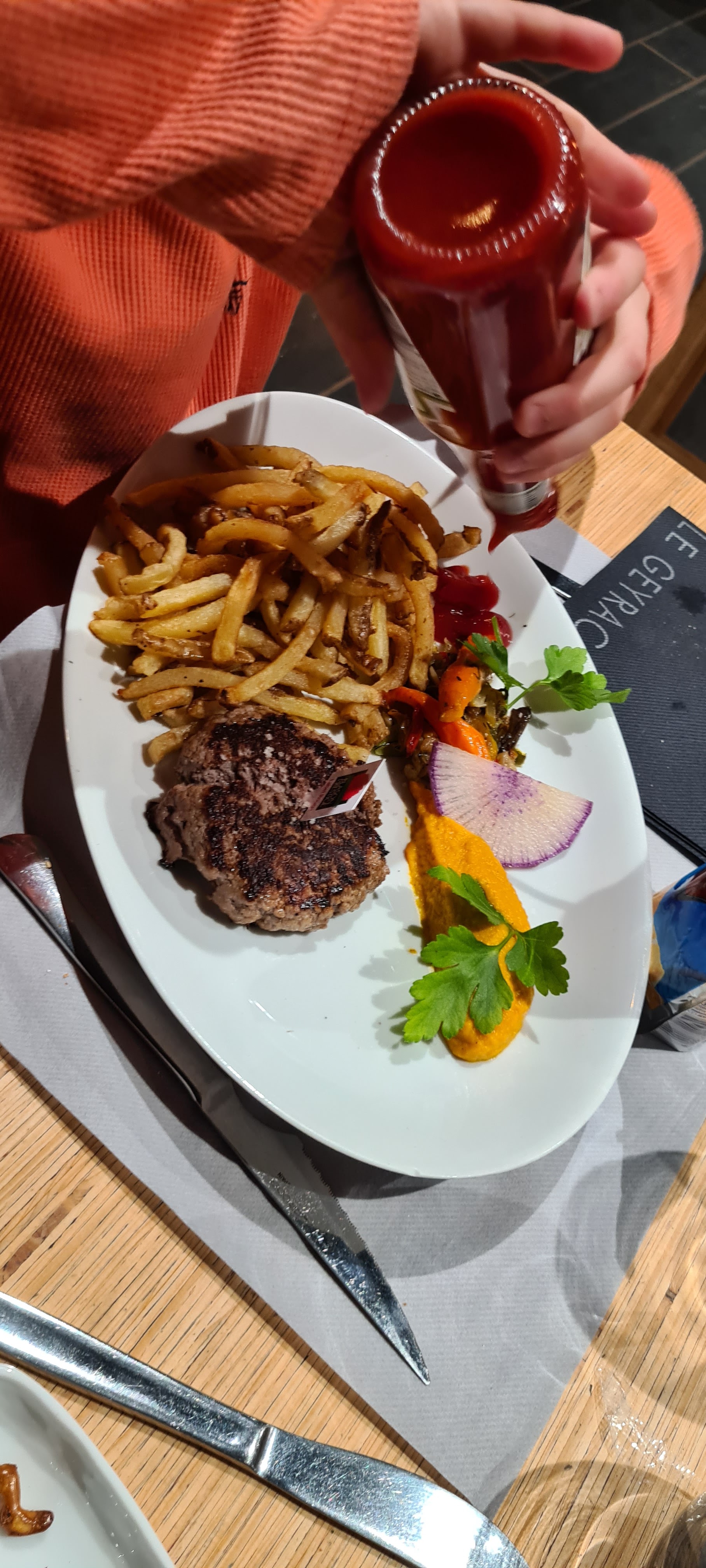 Repas correct, part contre on fait passer une personne apparemment pressé , avant un enfant de 11 ans alors que j’ai précisément demandé que son plat soit servi en même temps que nos entrées… Il a pu enfain manger à 22h! Je ne vous raconte pas l’attente… Quelle honte! Aucun geste commercial
