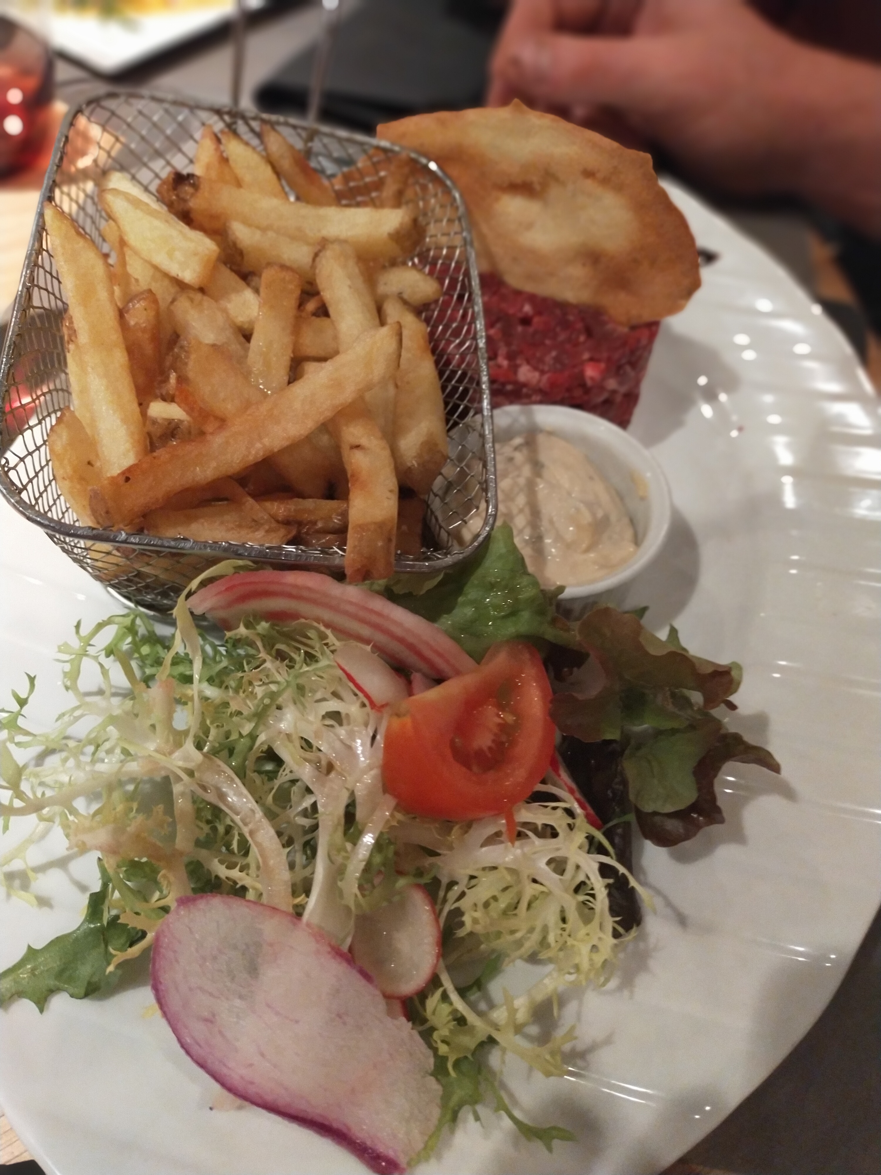 Très chouette soirée... pour ma part j'ai mangé steak tartare minute avec ses frites maison et sa salade : super copieux et un délice et en dessert tiramisu au coulis de fruits rouges pareil très bon et copieux. Mon mari a pris steak tartare noix et bleu frites maison et salade super bon et très copieux et en dessert tarte au citron meringuée un délice. L'accueil et le service nickel. Je recommande vivement.