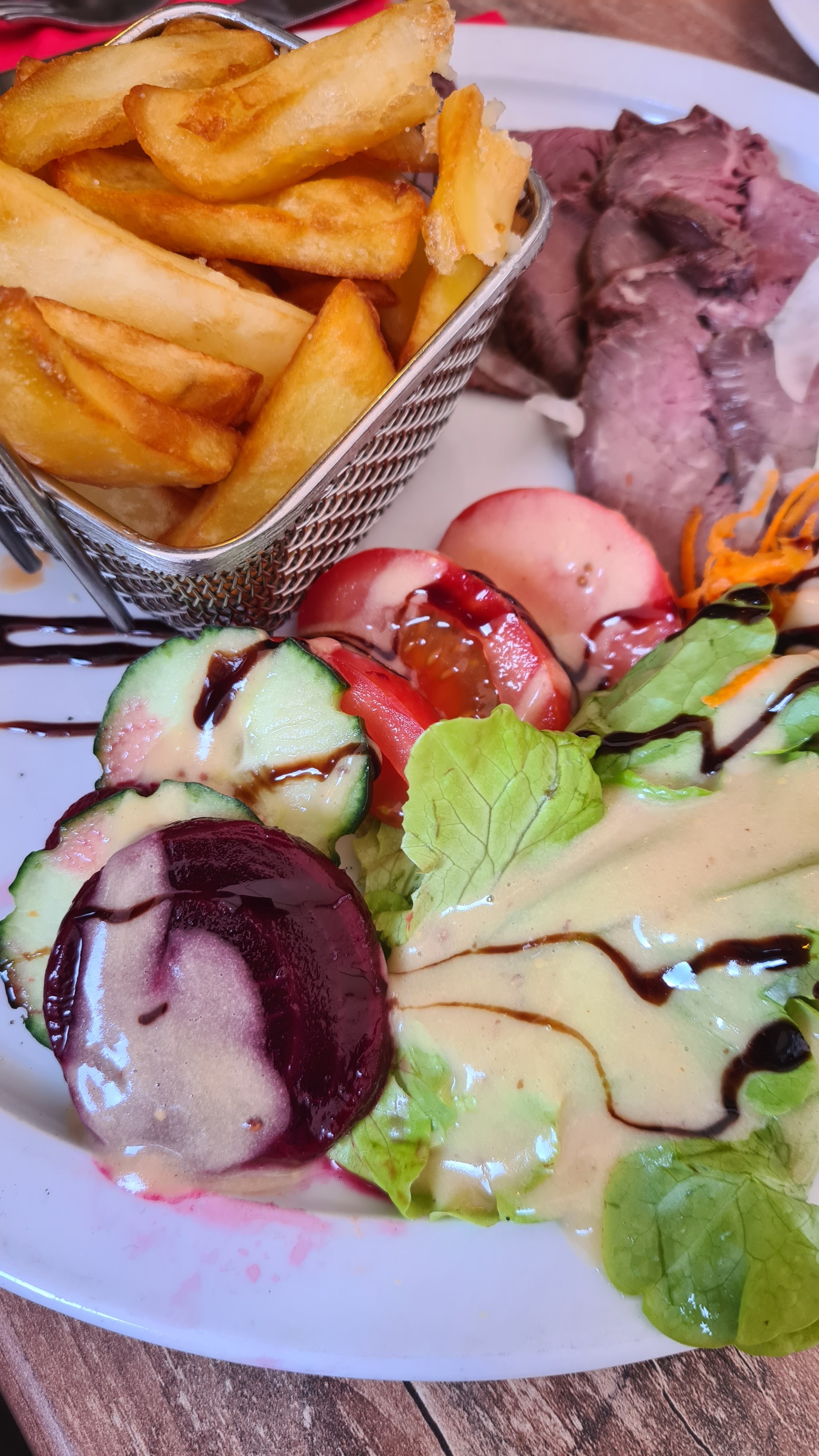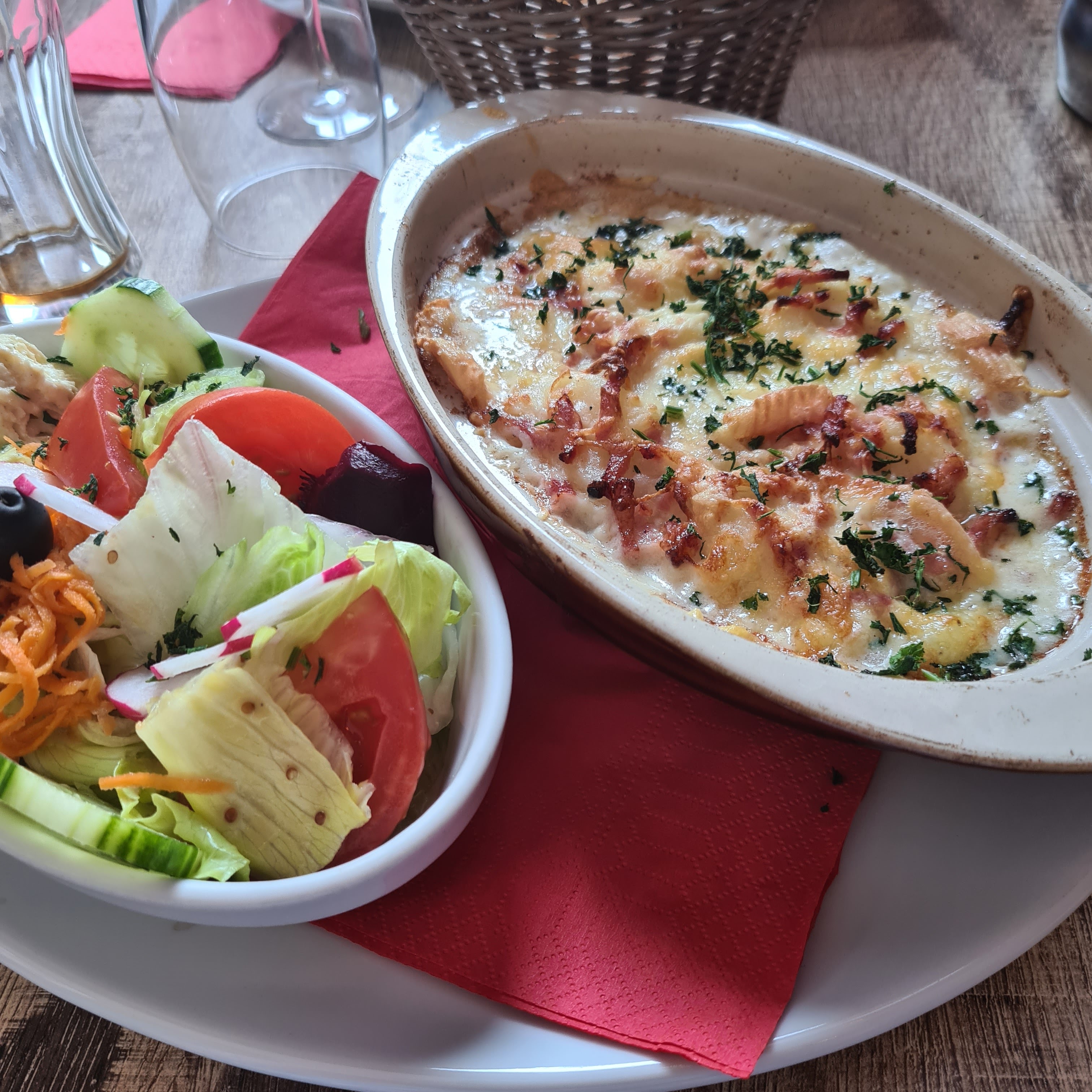 Sympathique mais mauvais rapport qualité prix. Gratin Munster froid. Juste des excuses ! Salade magret peux copieuse. Un petit geste aurait été un plus.