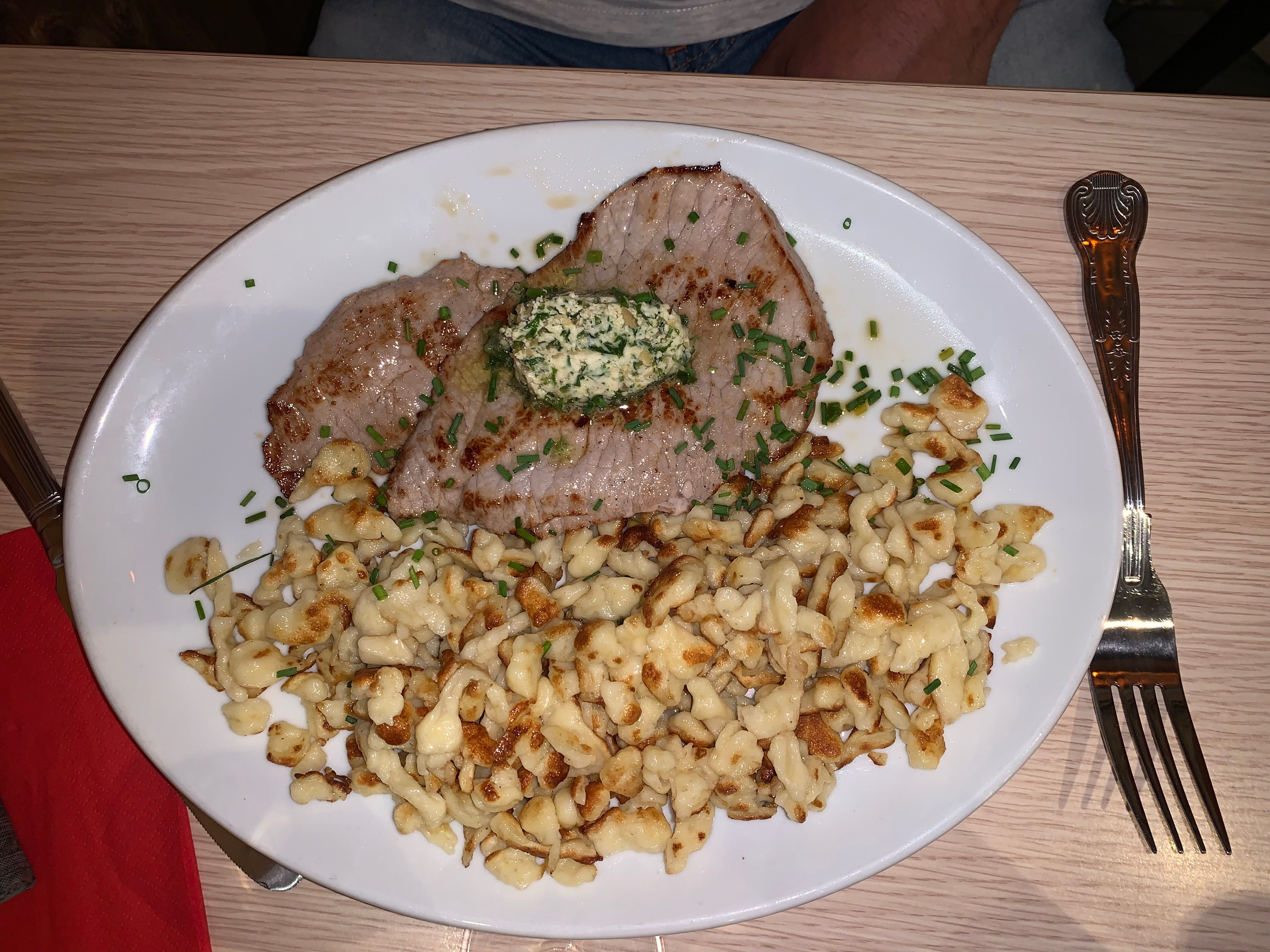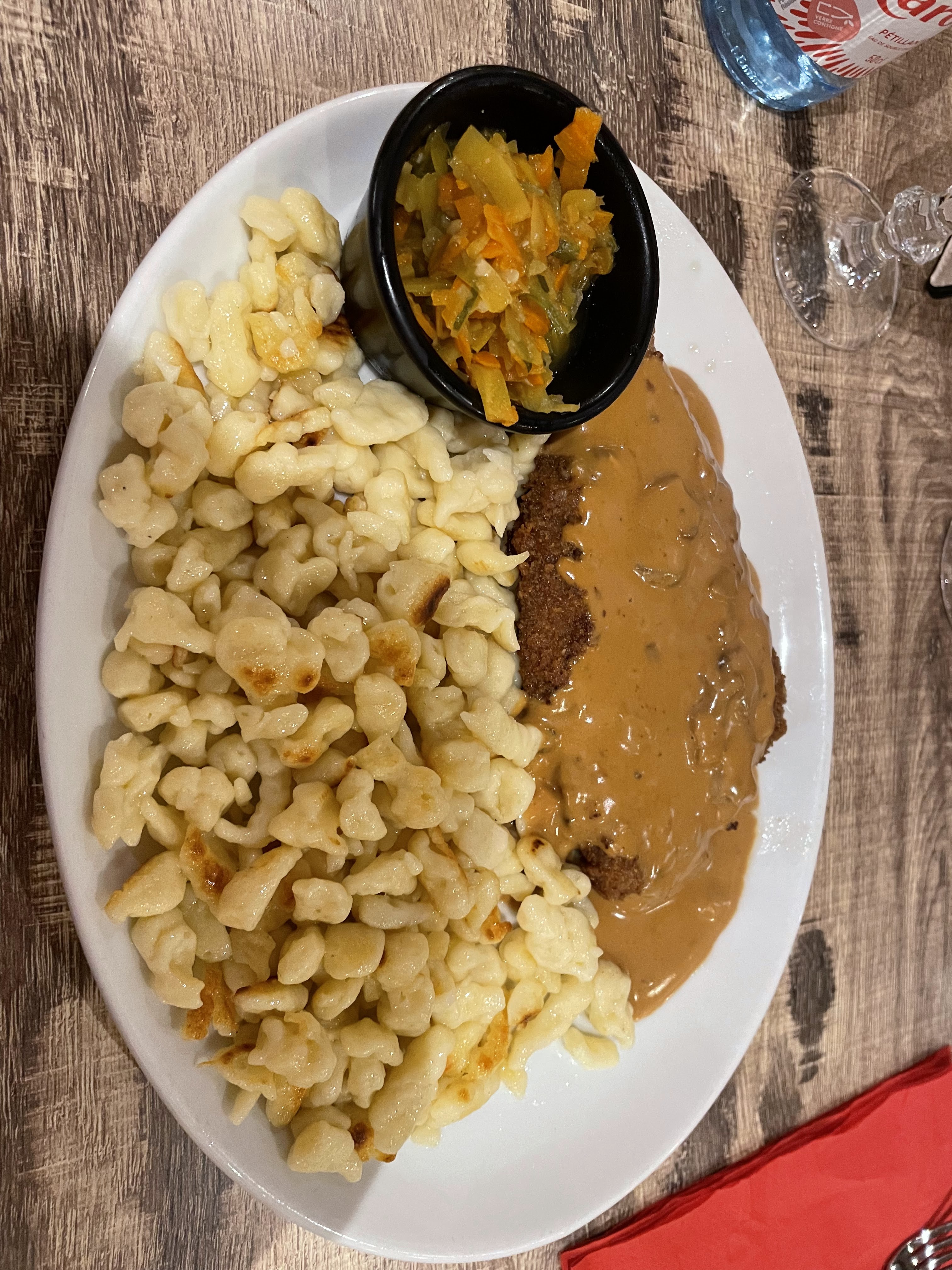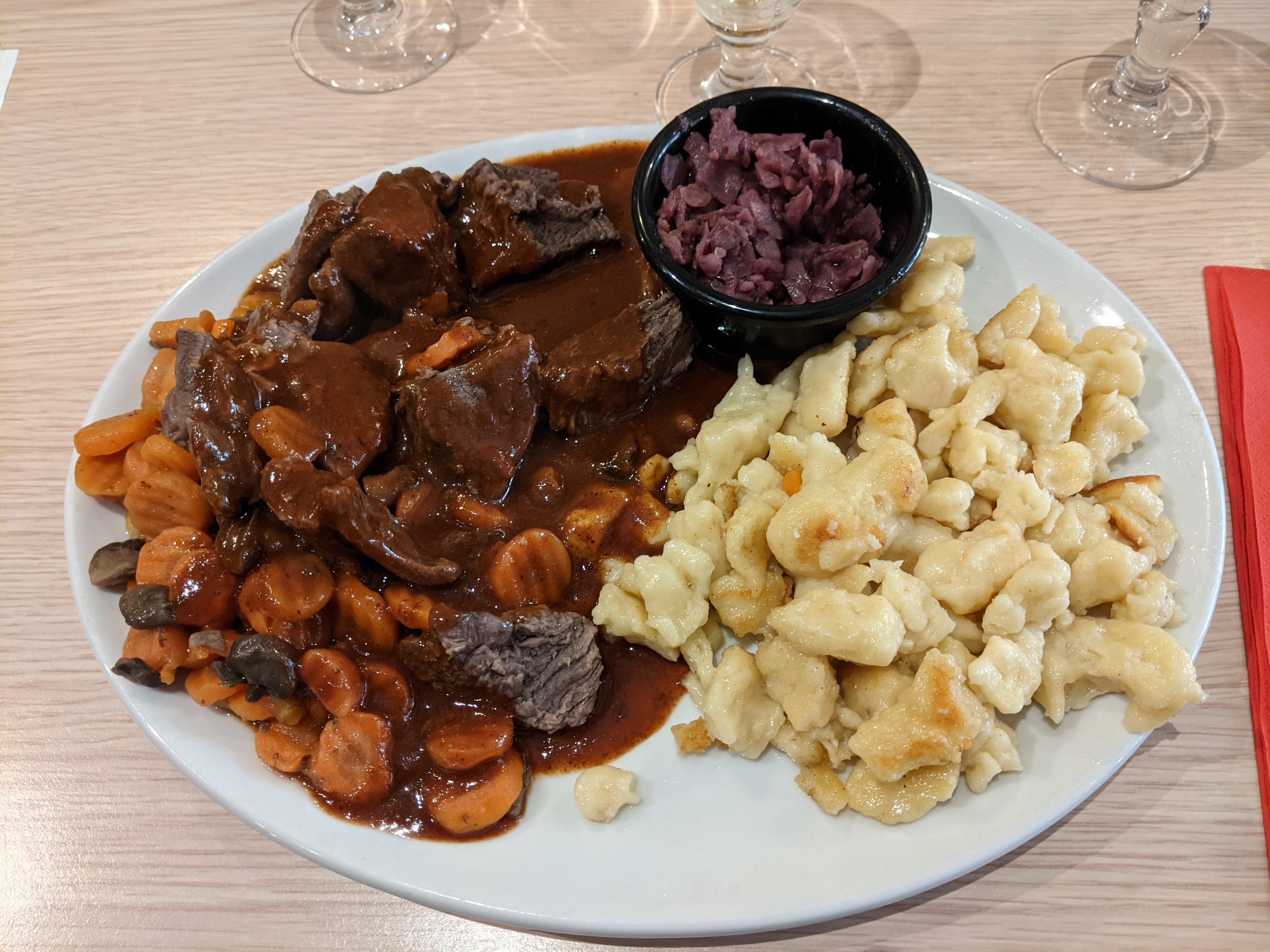 Nous avons été attirés par le gratin de spaetzles à la carte. Nous avons été déçus.. Le plat était fade, les portions n'étaient pas très généreuses. Le serveur qui s'est occupé de nous était agréable mais le personnel rigolait et parlait fort à une table.