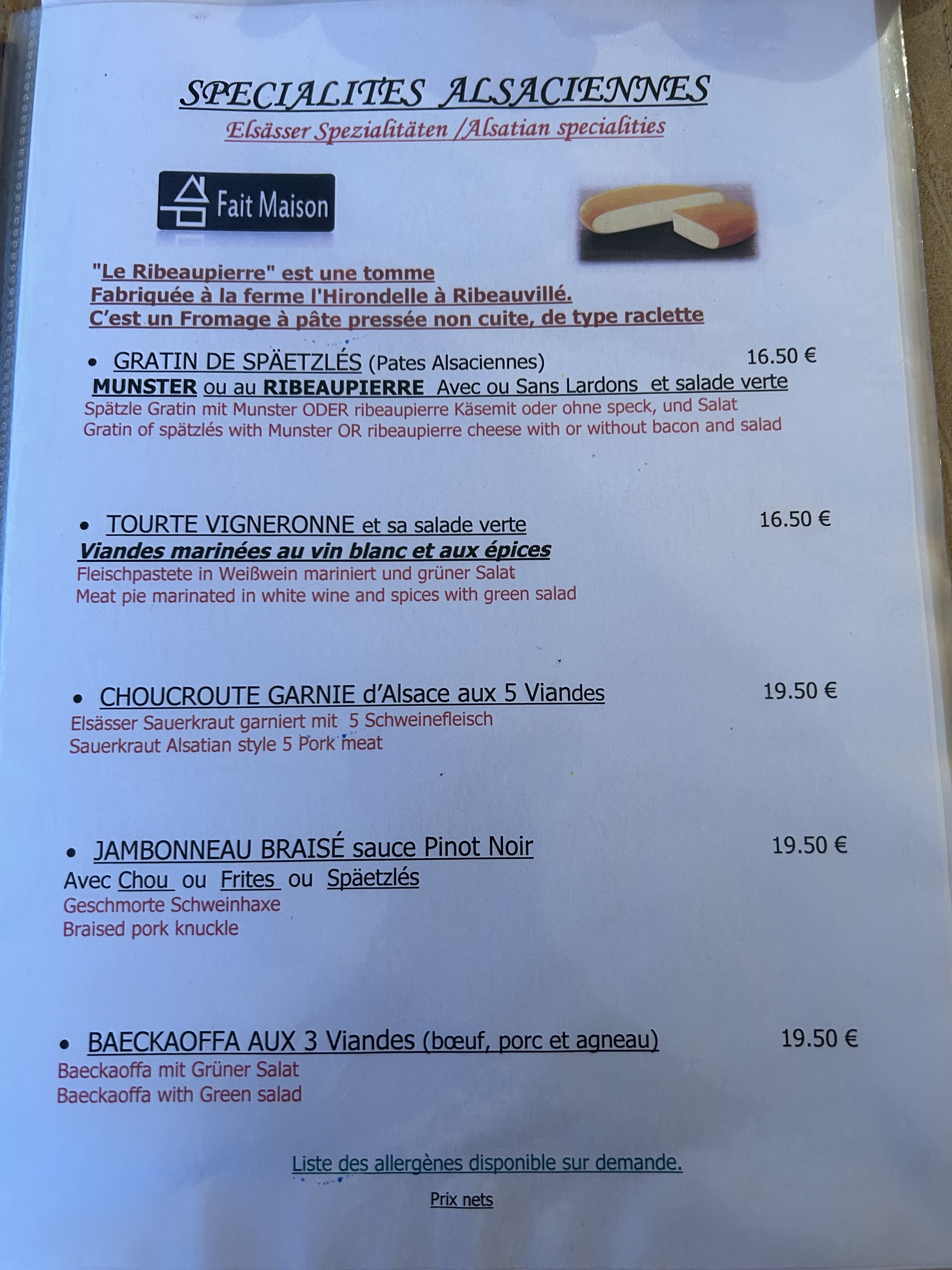 Belle experience. Avec ma compagne nous avons partagé une tarte flambee delicieuse en entrée, et 2 gratins de spaetlese au ribauvillé, nous avions me ventre rempli de bonheur hihi. A bientot hans et sabrina de Namur