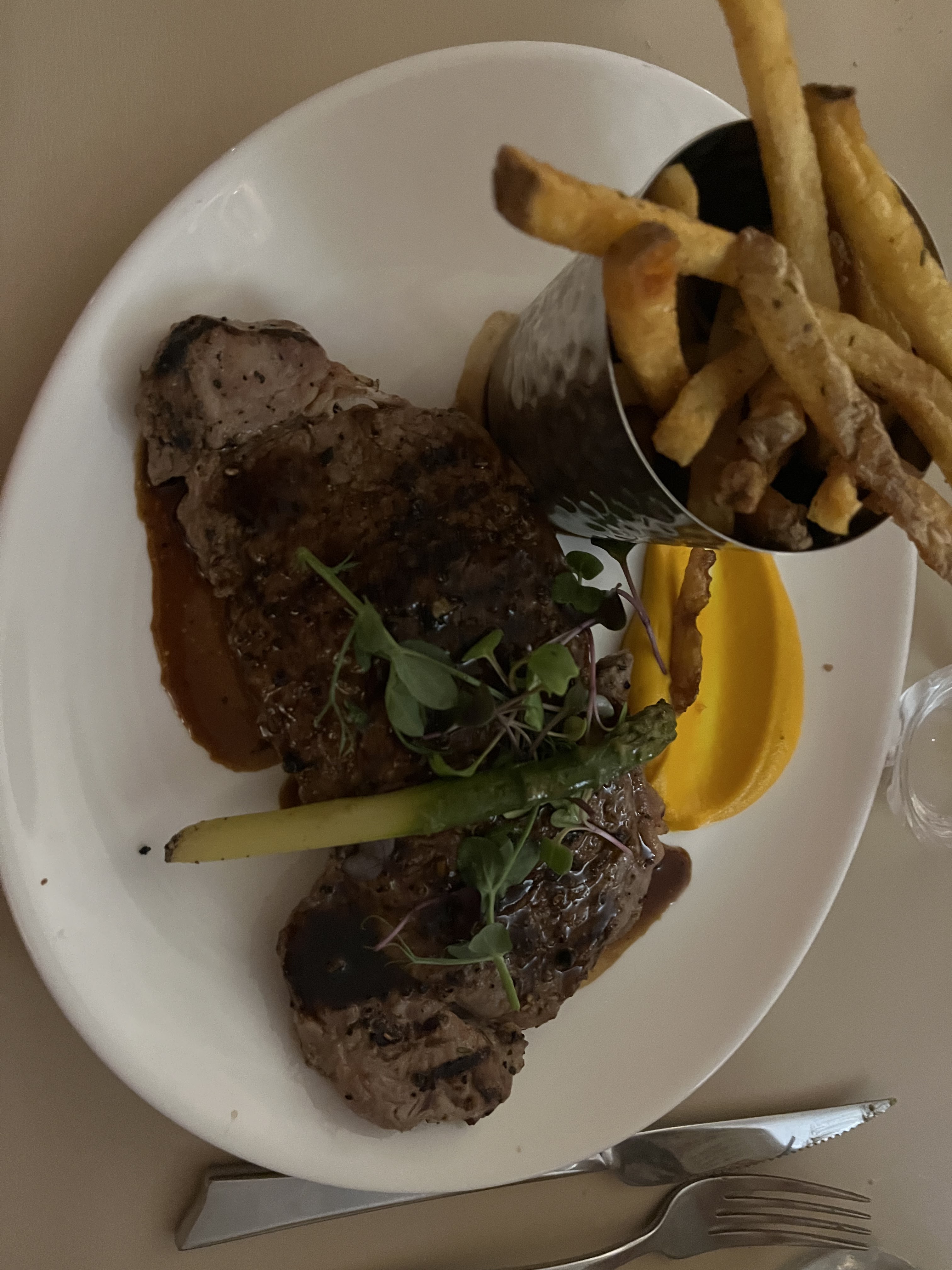Soirée avec le travail au Glasgow nous étions à l’étage. Belle salle la déco est simple et moderne. Les plats très bons bien dressés.