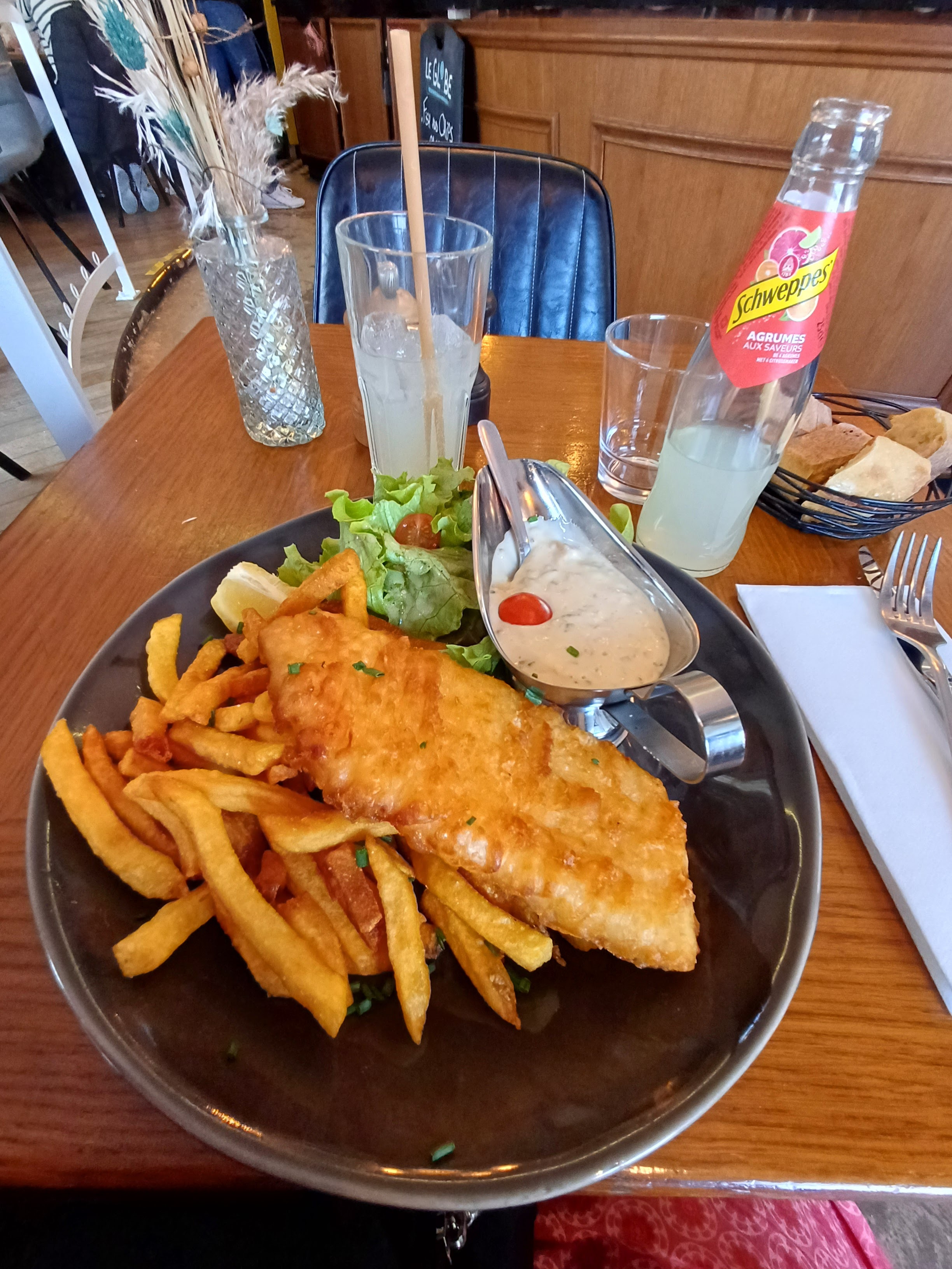 Lieu Sympa les serveurs sont accueillant et souriant j'ai pris le plat du jour fish & chips le fish très bon les Frites non froid et dure je crois j'avais la part qui etait réchauffer pad mal de fois la salade etait bonne et ls sauce une tuerie j'ai mis 3 ⭐️⭐️⭐️ j'étais pas contente des Frites, je n'avais plus de place pour le dessert j'ai pris qu'un café ☕️ Total 22,40€ un prix raisonnable j'ai bien aimé l'endroit je retournerai sans hésitation pour découvrir autres choses. Bravo à toute l'équipe