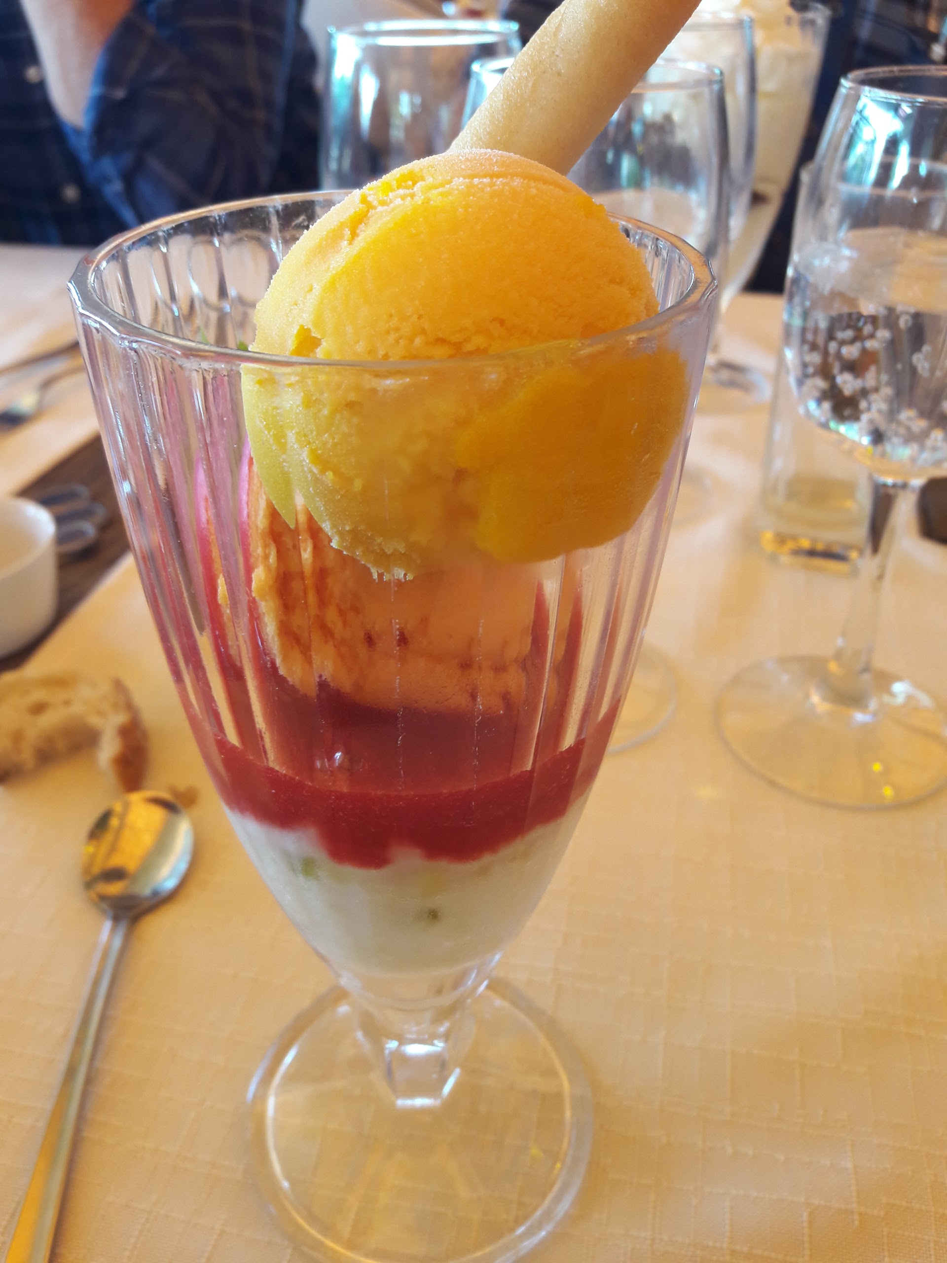 De délicieux filets de perche, accompagnés d'un excellent Crépy (vin blanc de Savoie) suivi d'une excellente coupe framboises - myrtilles et chantilly. Le tout apporté par un serveur à l'accent italien aussi efficace que plein d'humour !
