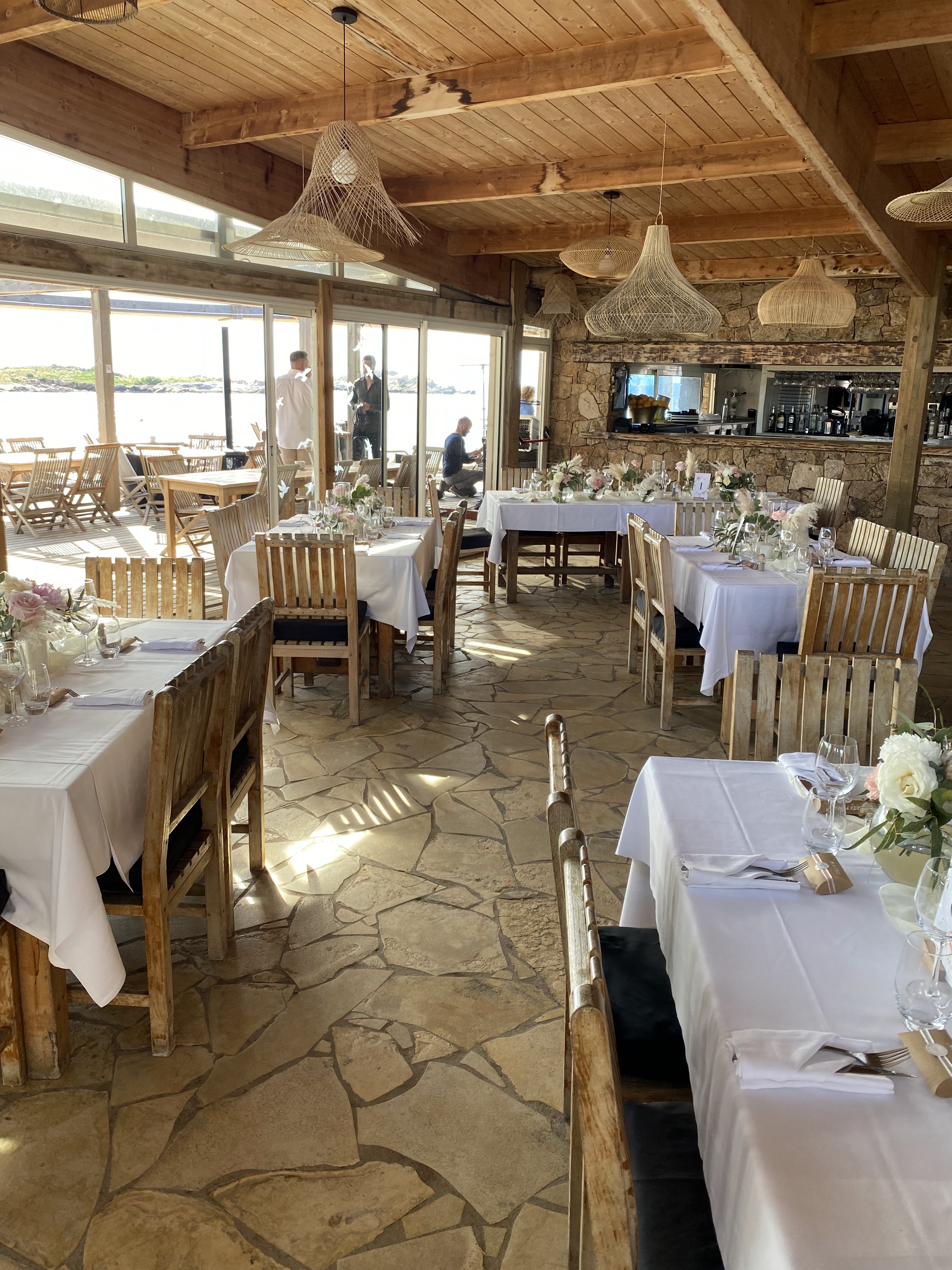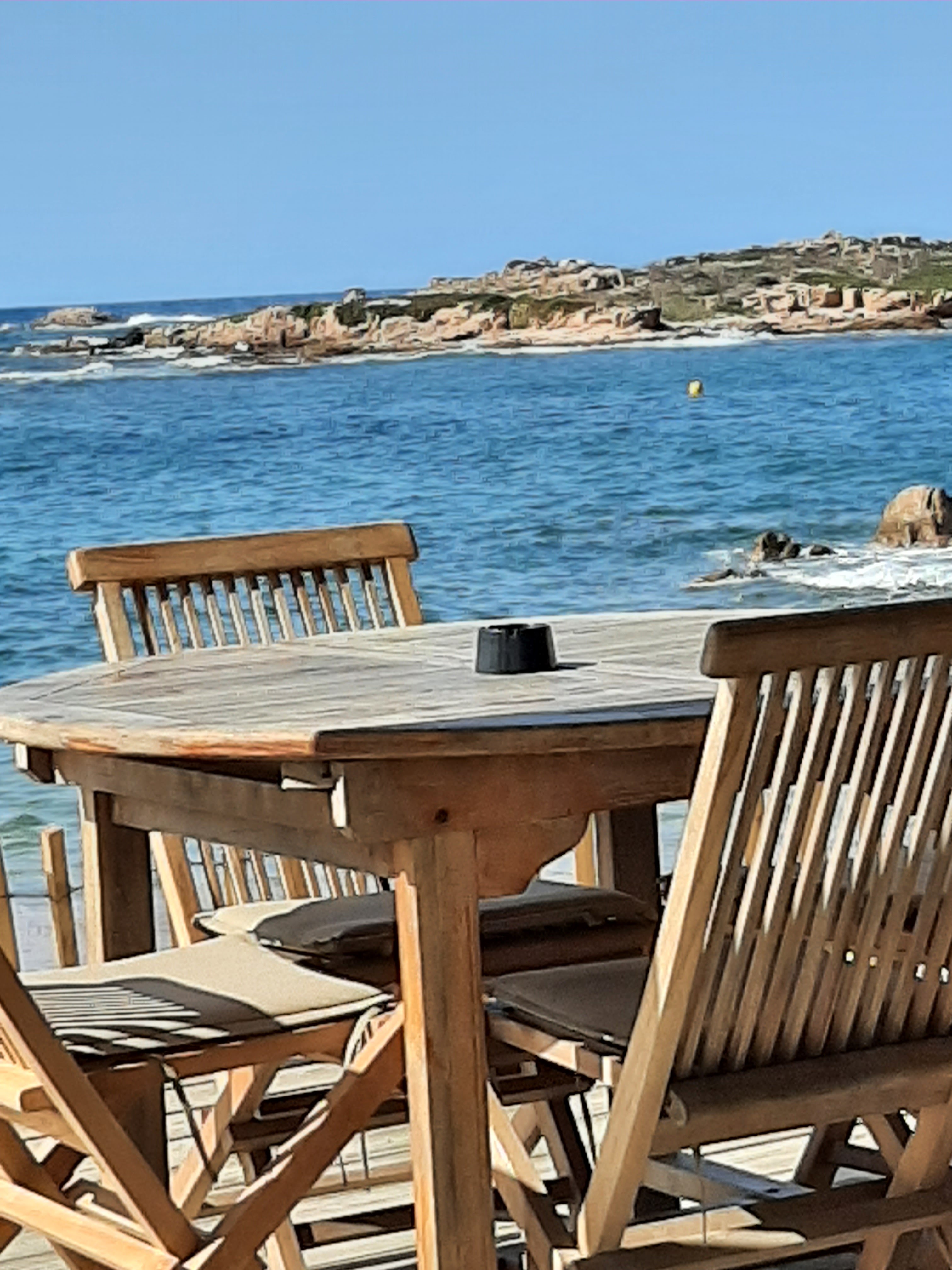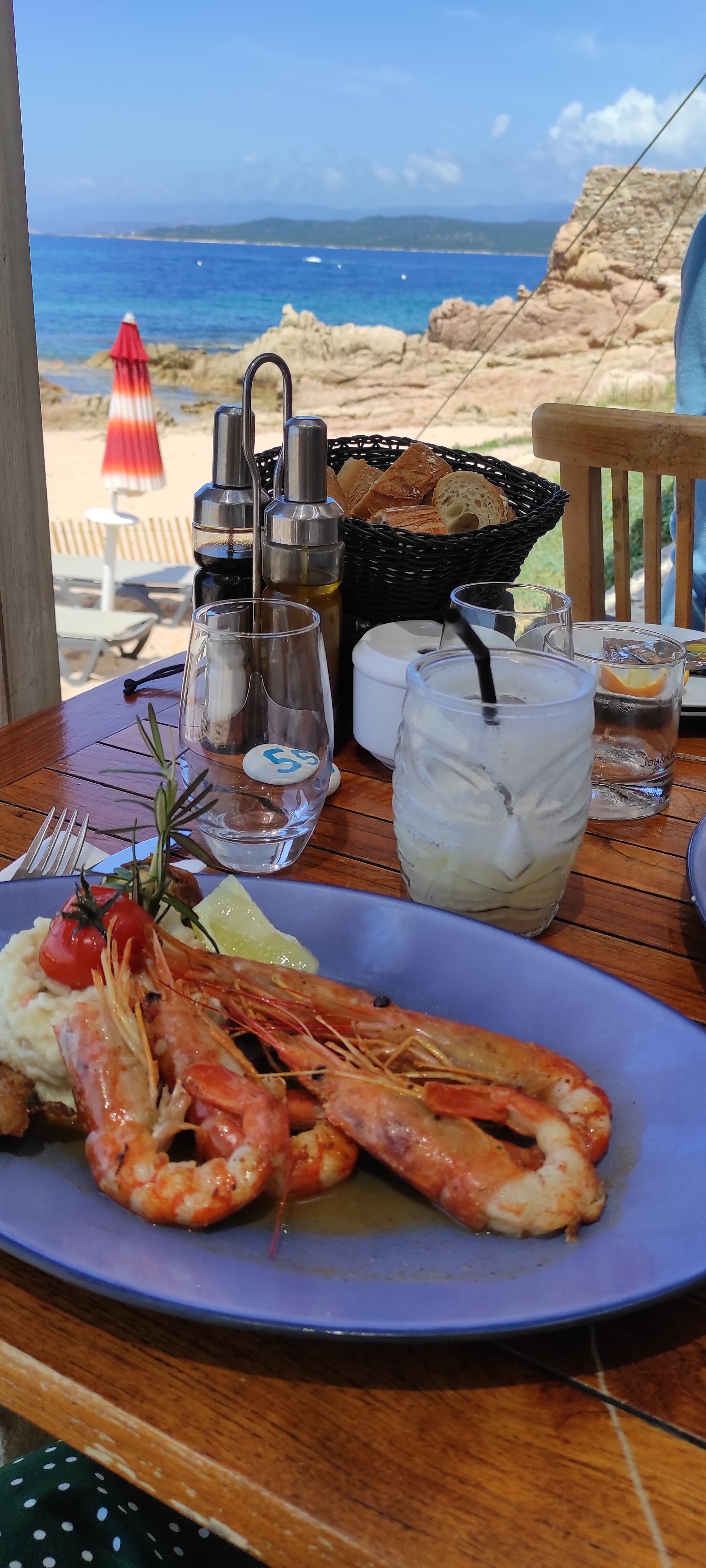 Lieu sublime, nous avons bien mangé aussi ,certes le personnel pas très attentionné, c est la fin de saison ils doivent être fatigués...on commande une bouteille de vin...elle est déposée sur la table,basta côté accueil on a vu mieux ,c est dommage car le restaurant est super beau ,et la petite plage de sable ocre sublime et tranquille