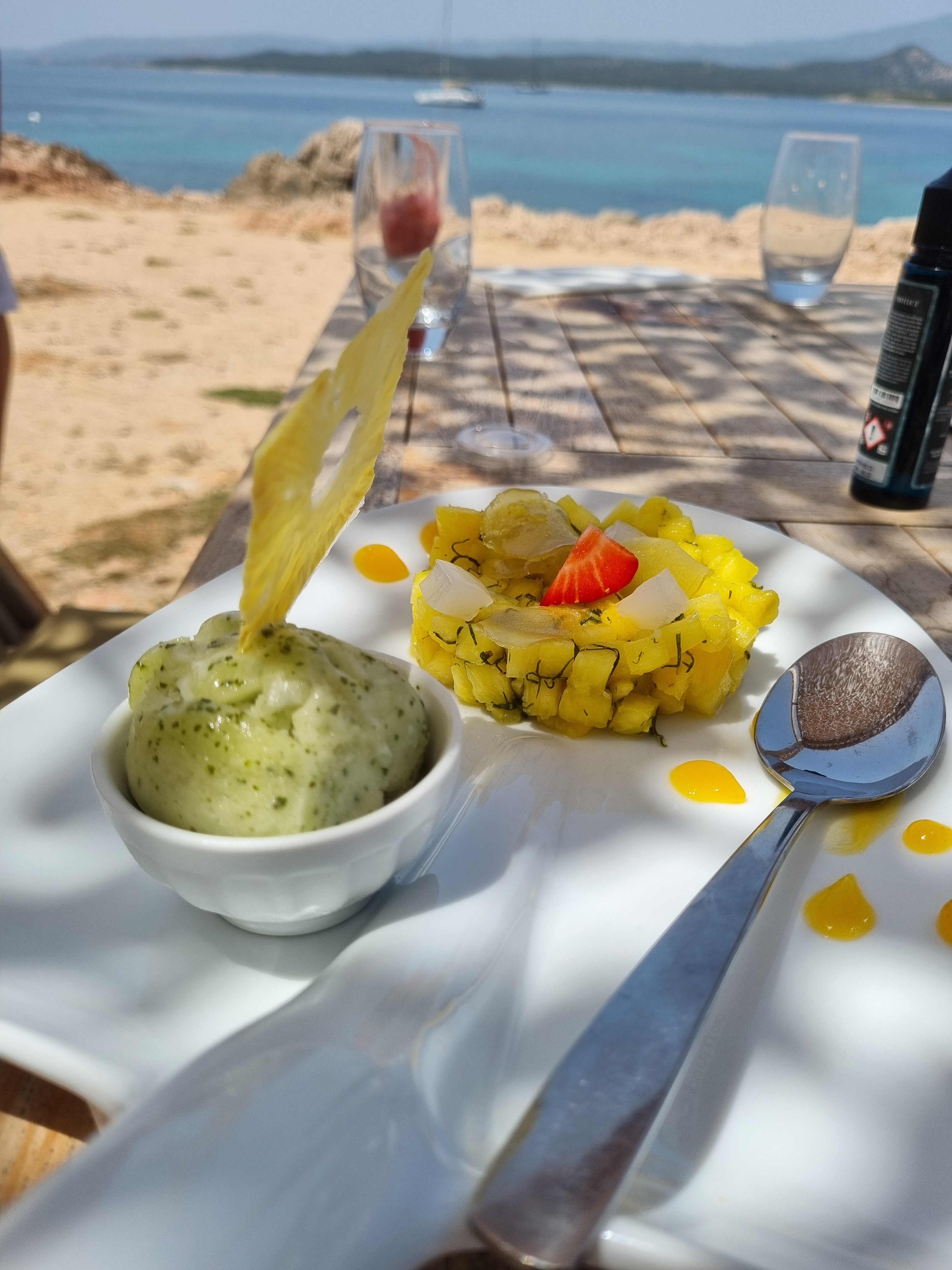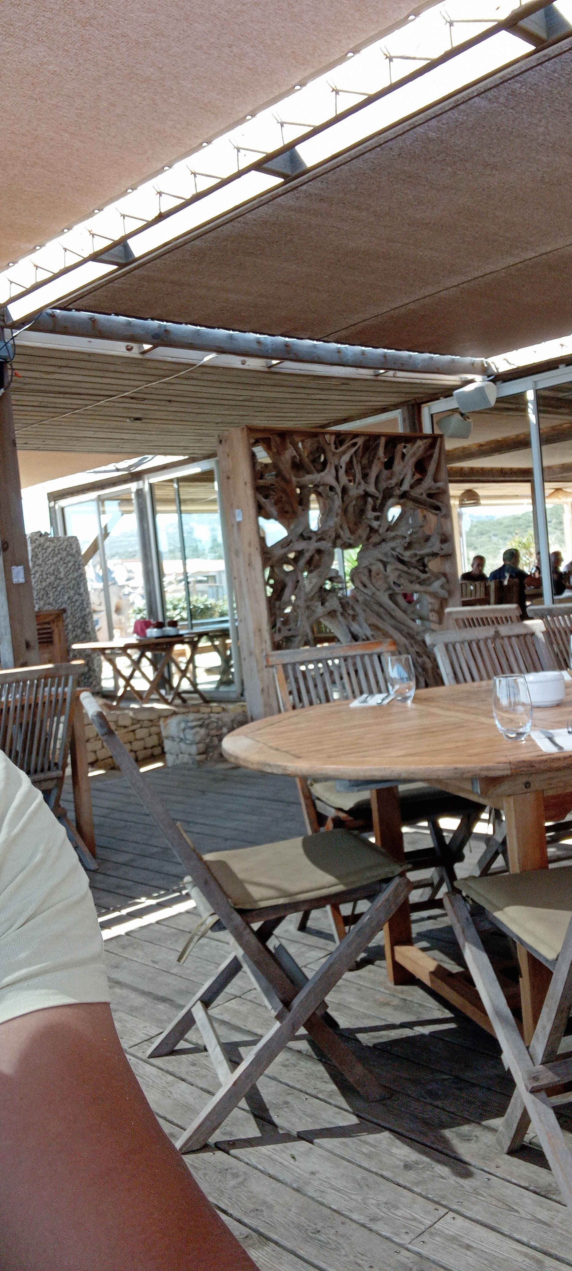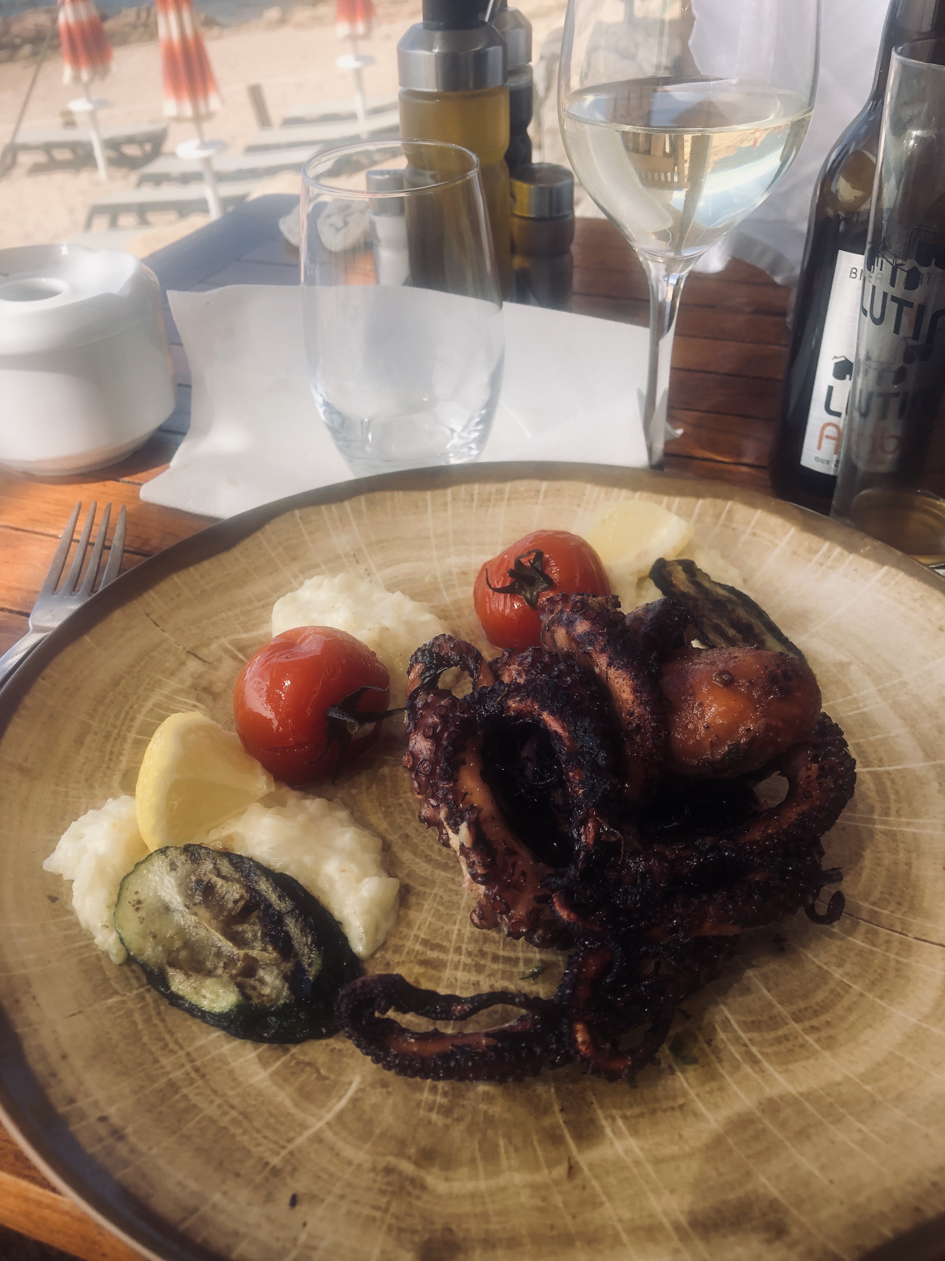 Lieu sublime, nous avons bien mangé aussi ,certes le personnel pas très attentionné, c est la fin de saison ils doivent être fatigués...on commande une bouteille de vin...elle est déposée sur la table,basta côté accueil on a vu mieux ,c est dommage car le restaurant est super beau ,et la petite plage de sable ocre sublime et tranquille