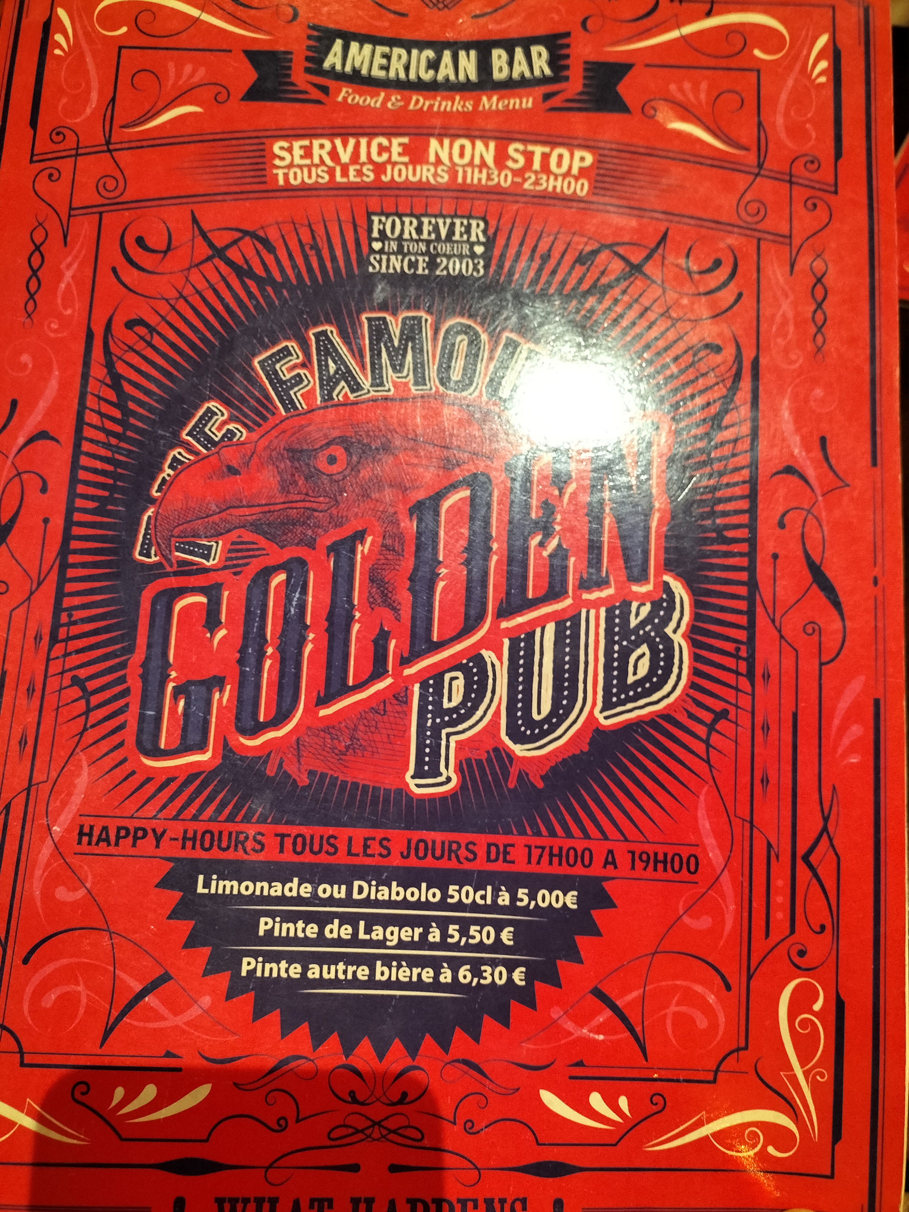 Lieu sympa, bien pour les jeunes (mais aussi pour les vieux 😝). Toujours un plaisir de passer au Golden entre amis malgré le fait que les serveurs ne soient pas toujours très aimable. Prix un peu cher sur l’ensemble de la carte, j’y manges rarement car je ne suis pas fan de leur cuisine mais les cocktails sont top et toujours bien présentés. Mon seul problème : j’ai trouvé cela honteux de commander une crêpe à + de 7€ (avec plusieurs gourmandises) pour avoir une crêpe toute sèche sorti d’un paquet St Michel (après midi, en semaine…), Heureusement la bière à la rose m’a fait passé la crêpe ainsi que son prix… Mais bon; pour toutes les fois où je suis venue au pub, ce n’est qu’une petite mauvaise expérience.. à bientôt !
