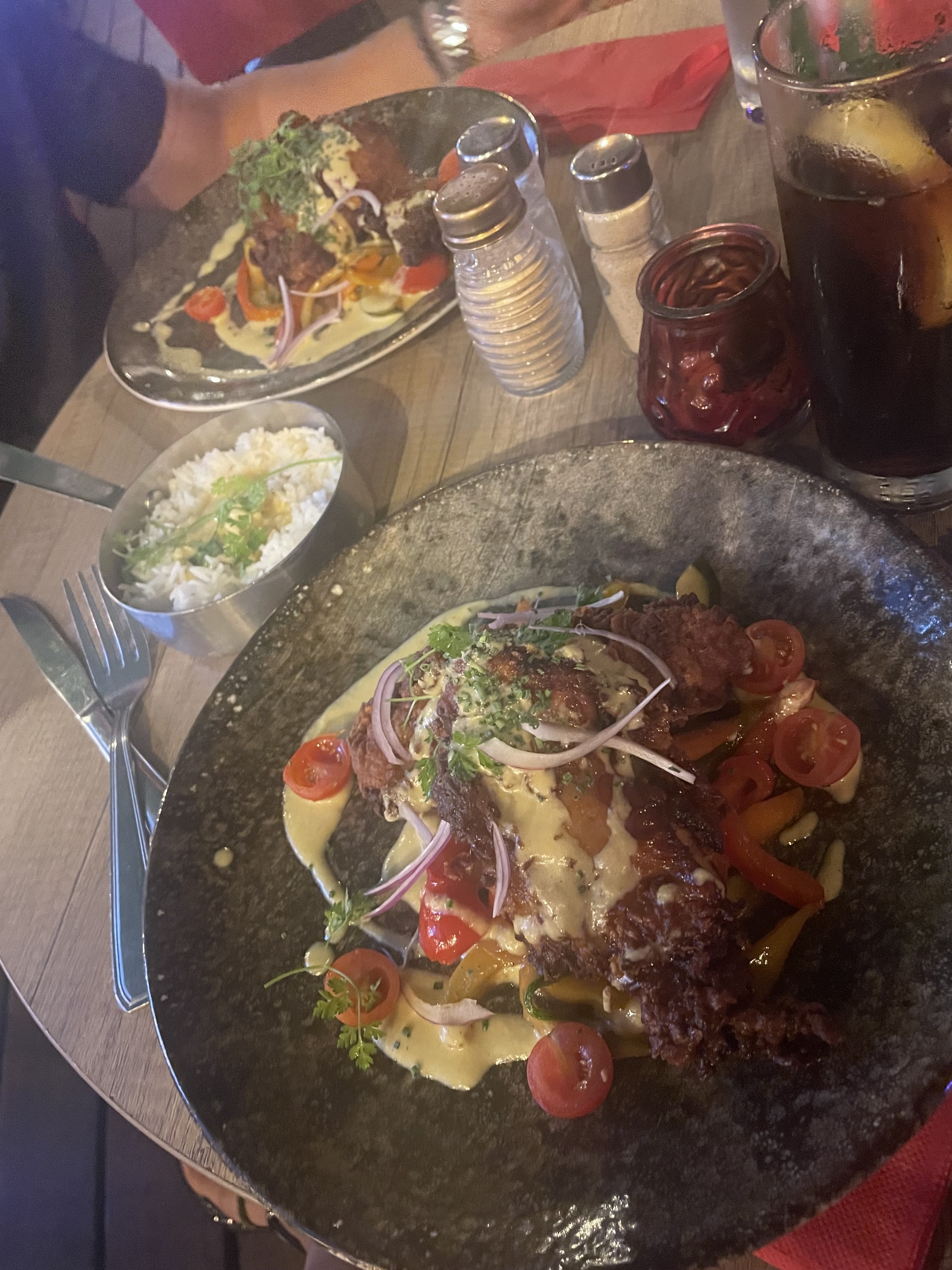 Très beau restaurant. Le mojito fraise était excellent😍. Concernant les pâtes au poulet bof sauce trop basic il manque du goût, le poulet n’était pas mariné et trop dur et sec dommage qu’il n’y ai pas + de recette de pâte. Les serveurs sont super cool d’autres non dont un qui oublie notre demande. Je suis mitigée 😐