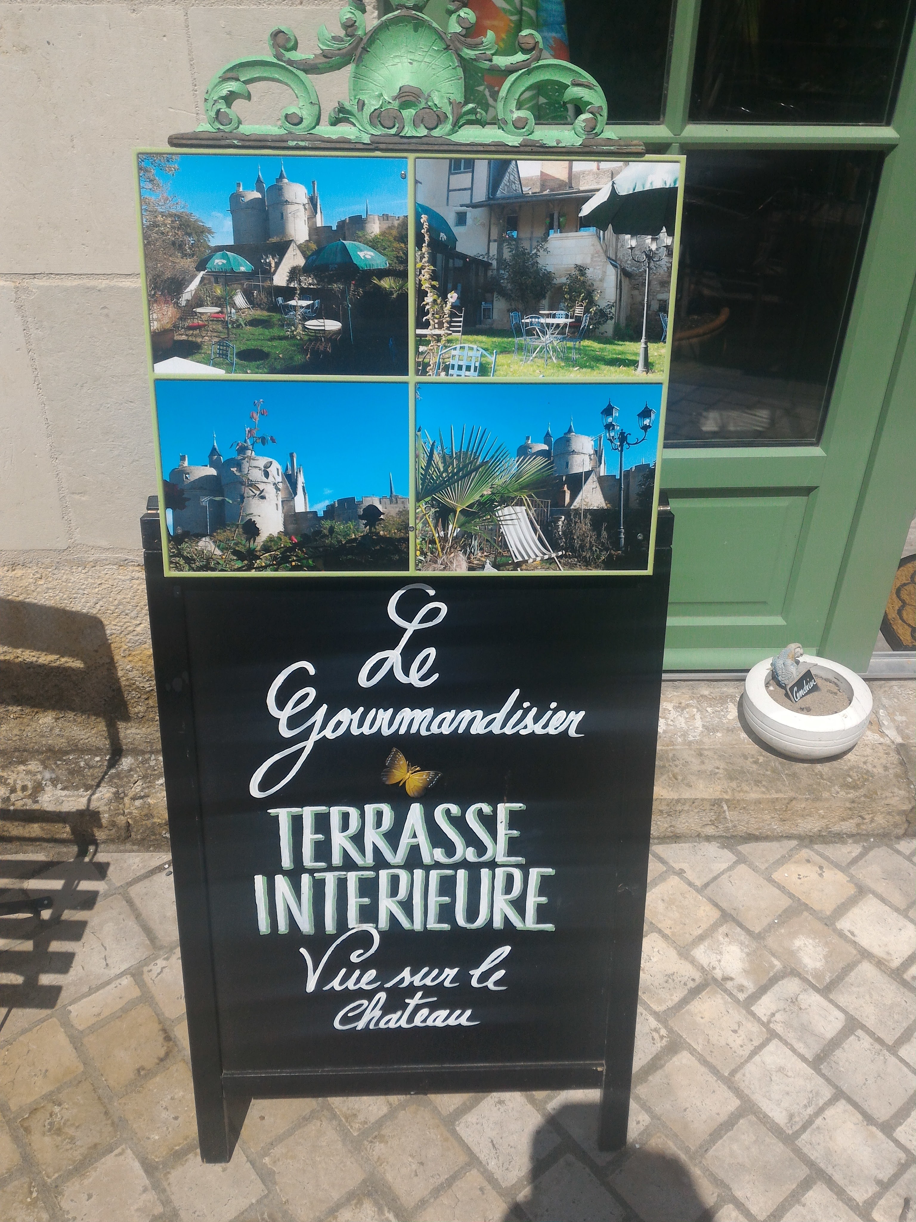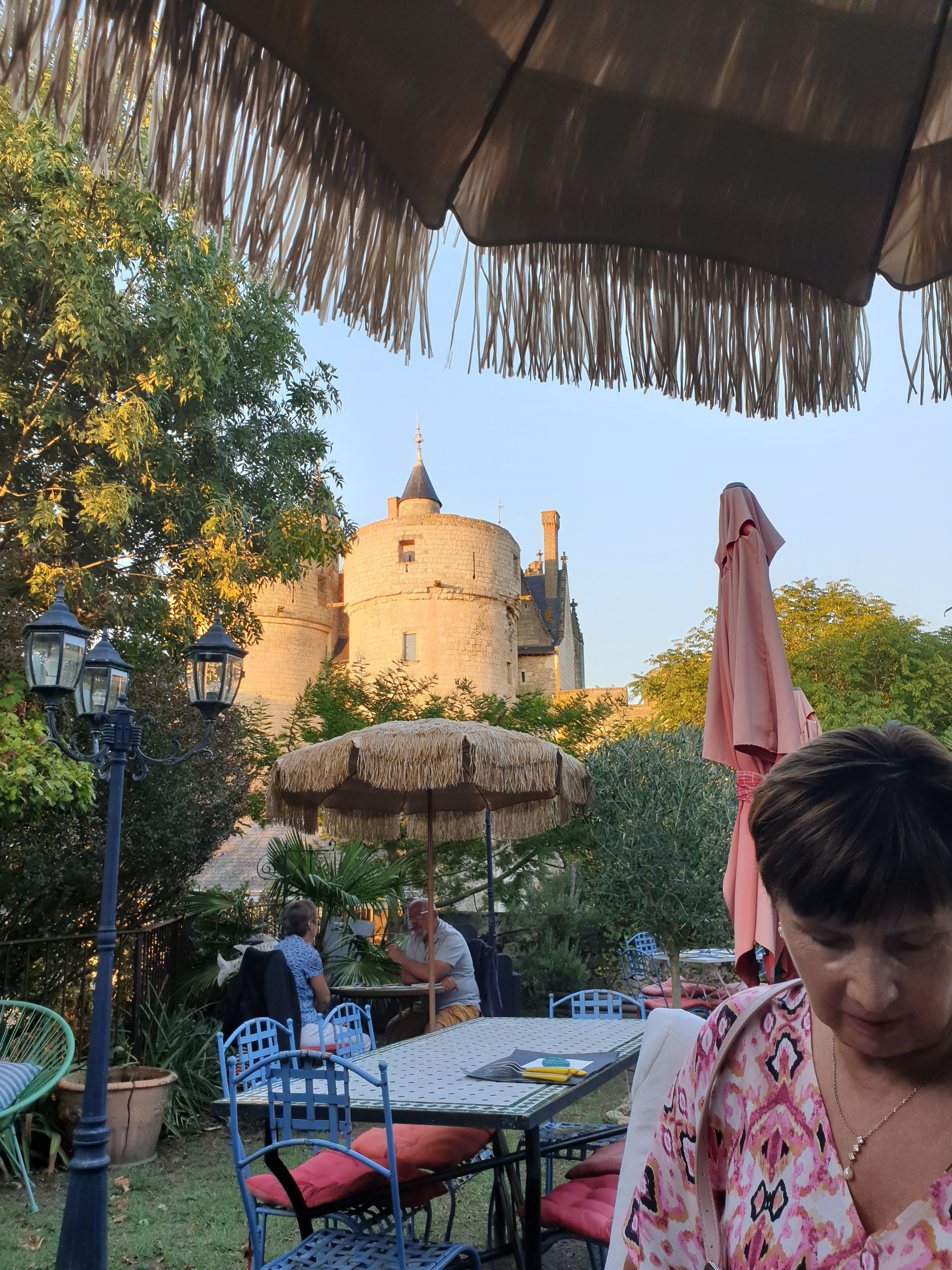 Une cuisine maison dans un cadre très agréable : petit jardin avec vue sur le château de Montreuil s/ Bellay. Un choix parmi 3 entrées / 3 plats / desserts. J’ai opté pour la soupe de courgette froide aromatisée à l’anis suivi du bœuf carottes au cumin. La dame est seule en cuisine et au service, un véritable exploit ! Si vous passez dans ce village, allez y sans hésitation pour déjeuner. Pensez à réserver si vous voulez être sûr d’avoir une place !