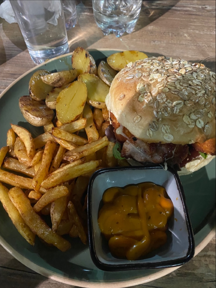 Un restaurant super beau, mur en pierre avec une déco jolie et chaleureuse. Un accueil et service au top, avec beaucoup de gentillesse. Leurs hamburgers et leurs frites maison vraiment délicieux. On recommande sans hésiter.