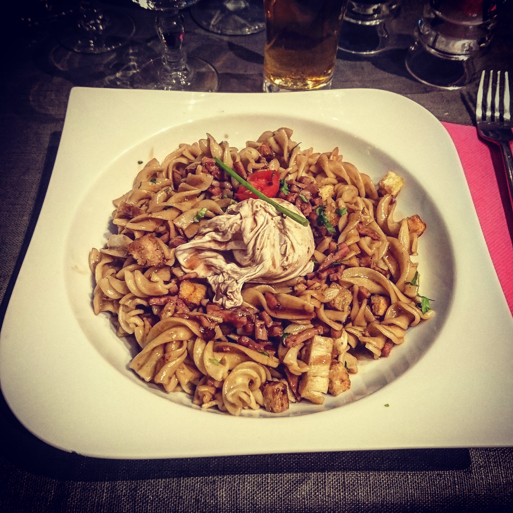 Pâtes fraiches maison sauce meurette délicieuse... et tiramisu pistache revisité une veritable tuerie. Je conseille virement