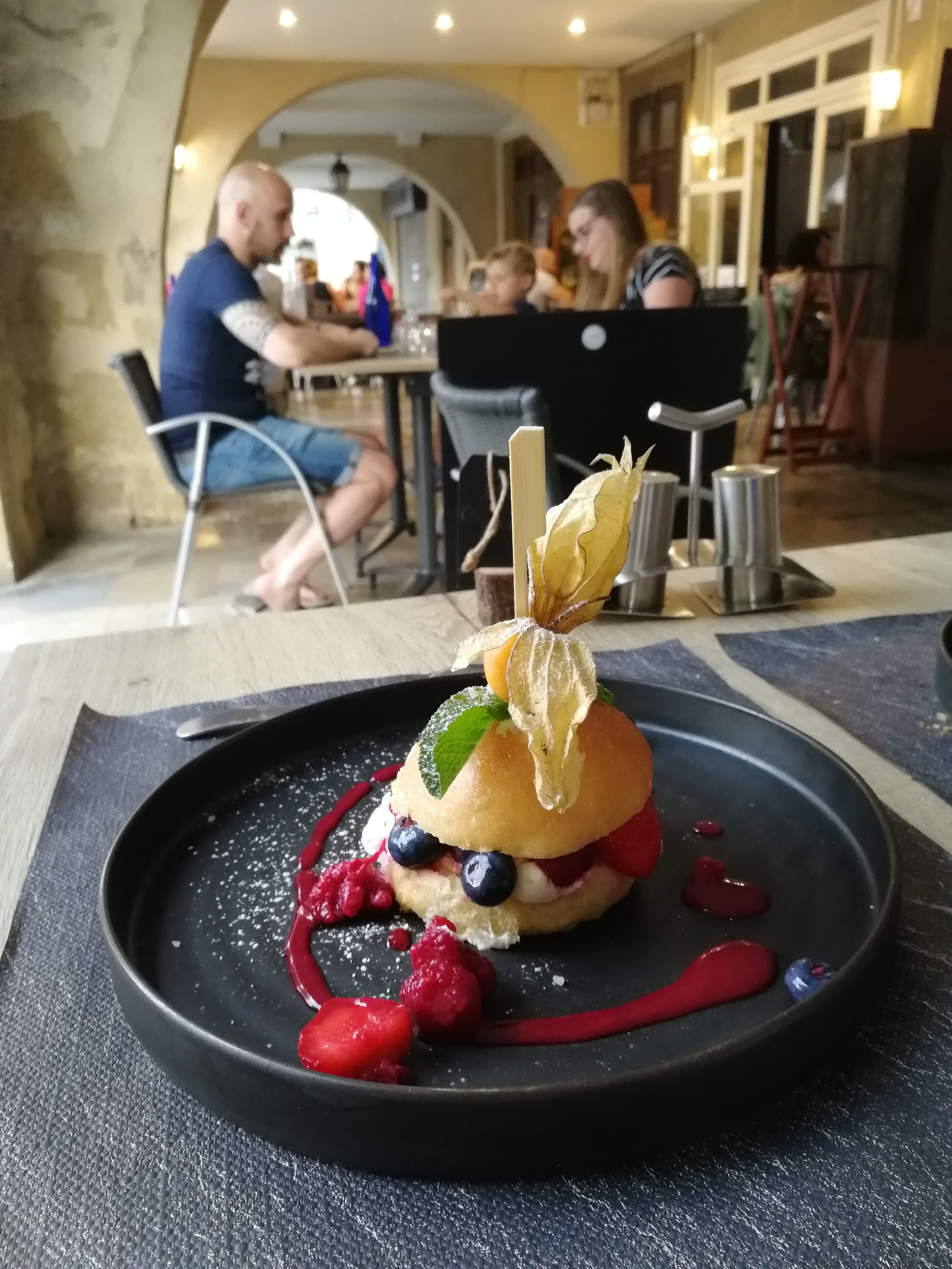 Restaurant avec une terrasse dressée sur la place du village et une autre sous les arceaux...équipe sympathique et dynamique : assiettes joliment décorées et goûteuses avec accompagnement de légumes et produits locaux frais qui tiennent leurs promesses....le tout servi sur assiettes ardoises qui apportent un plus au dressage ... Adresse à partager sans modération..