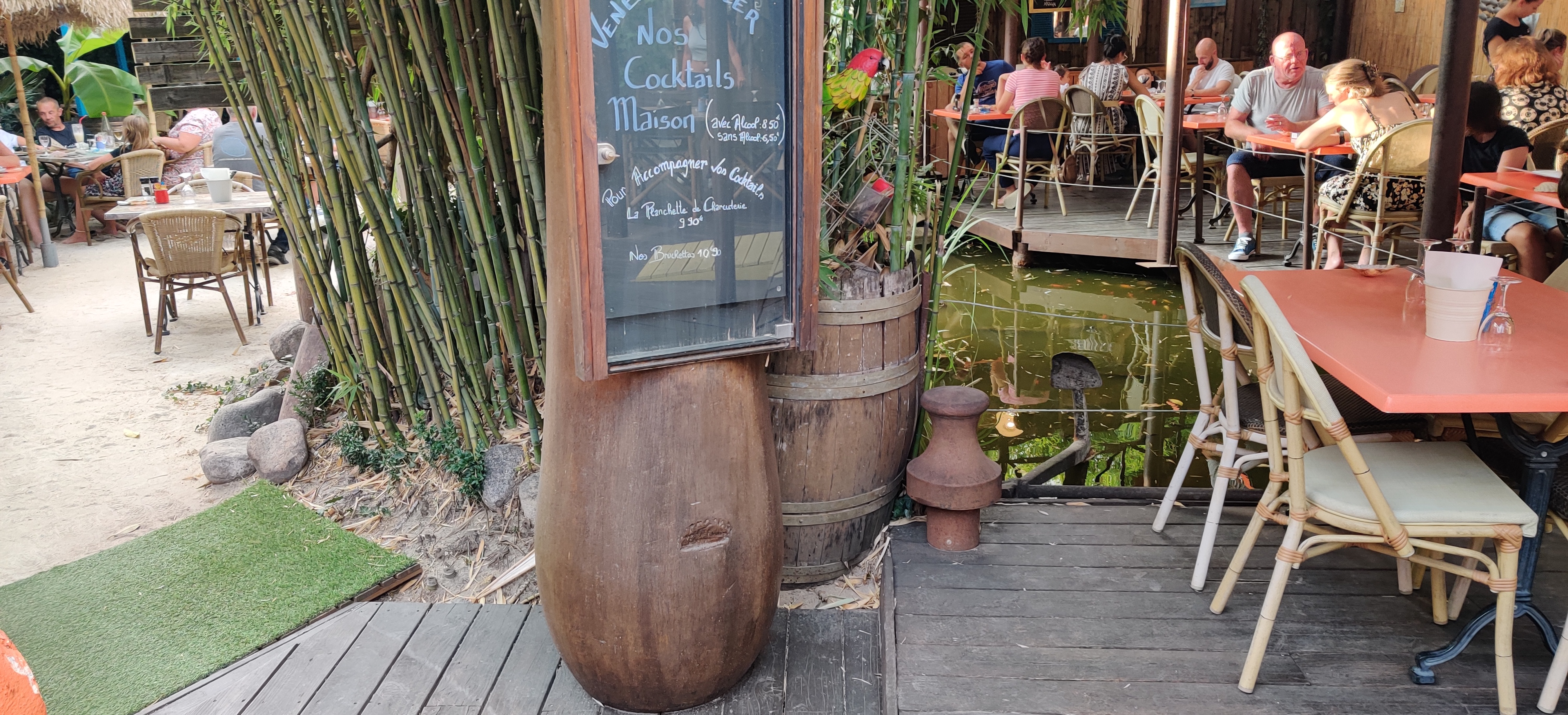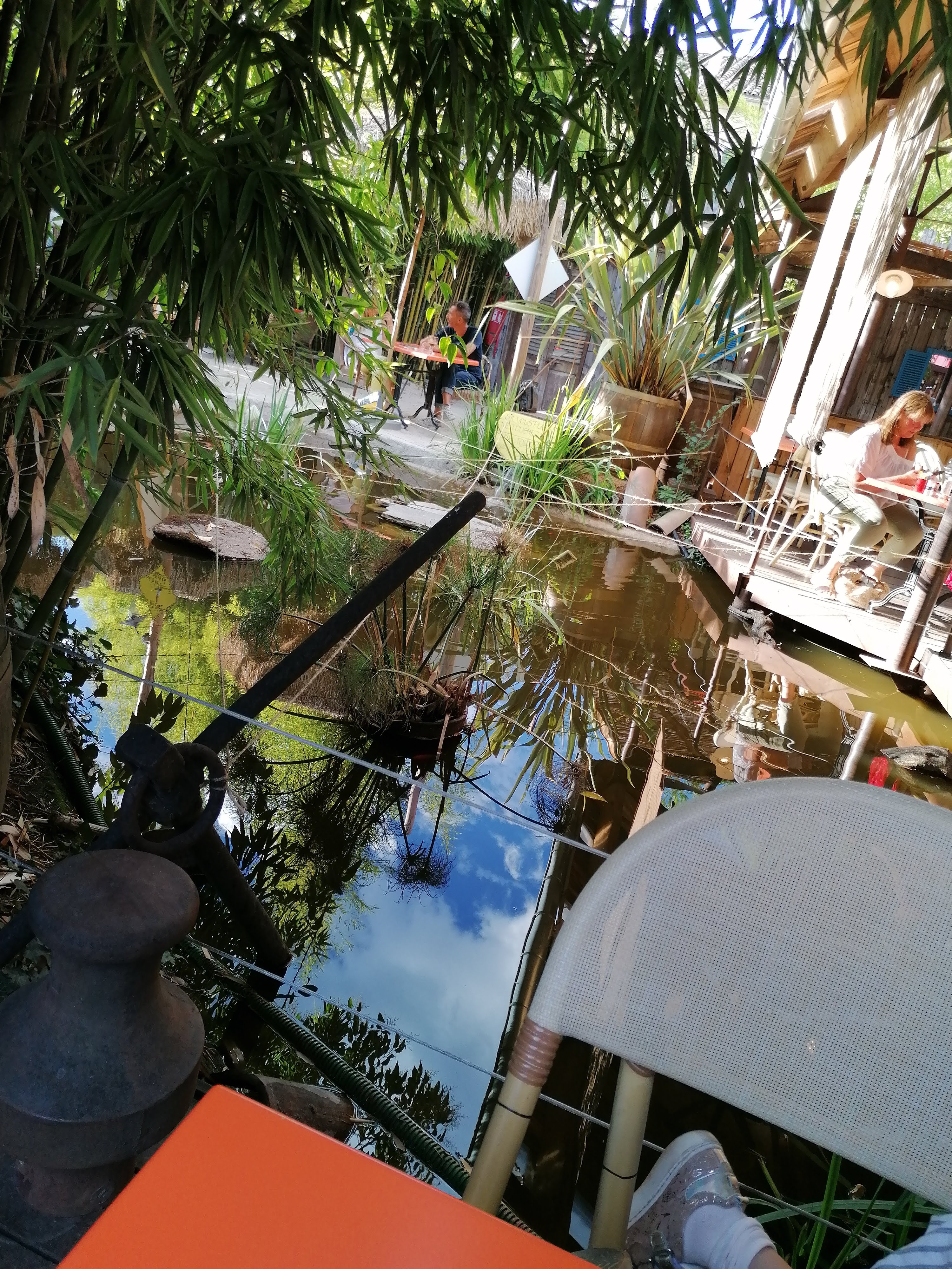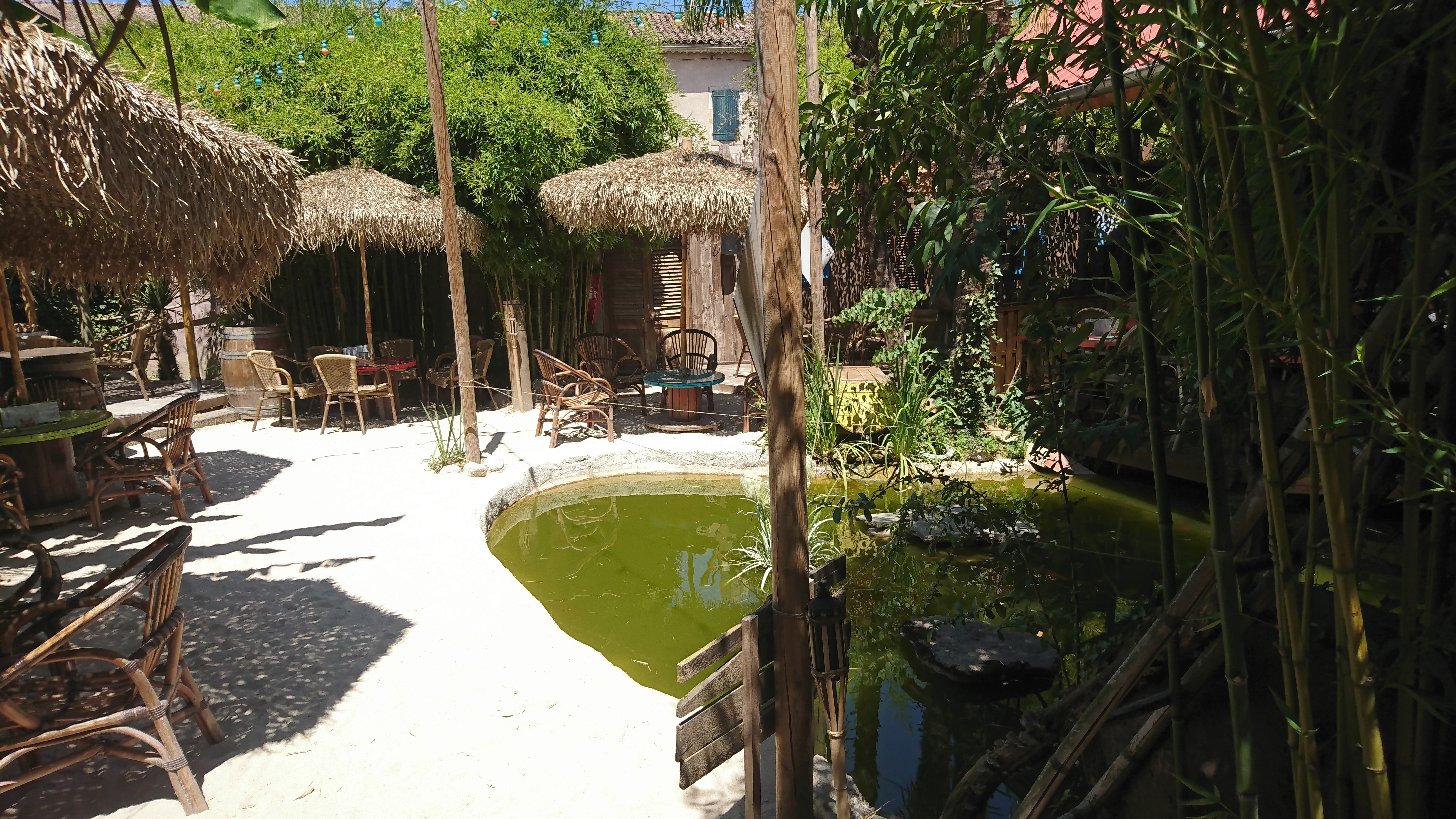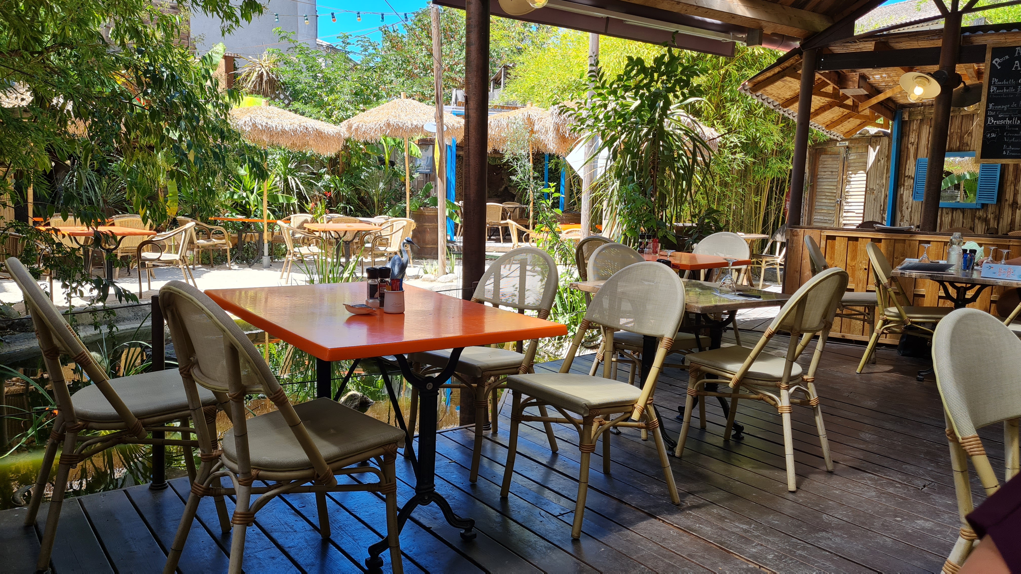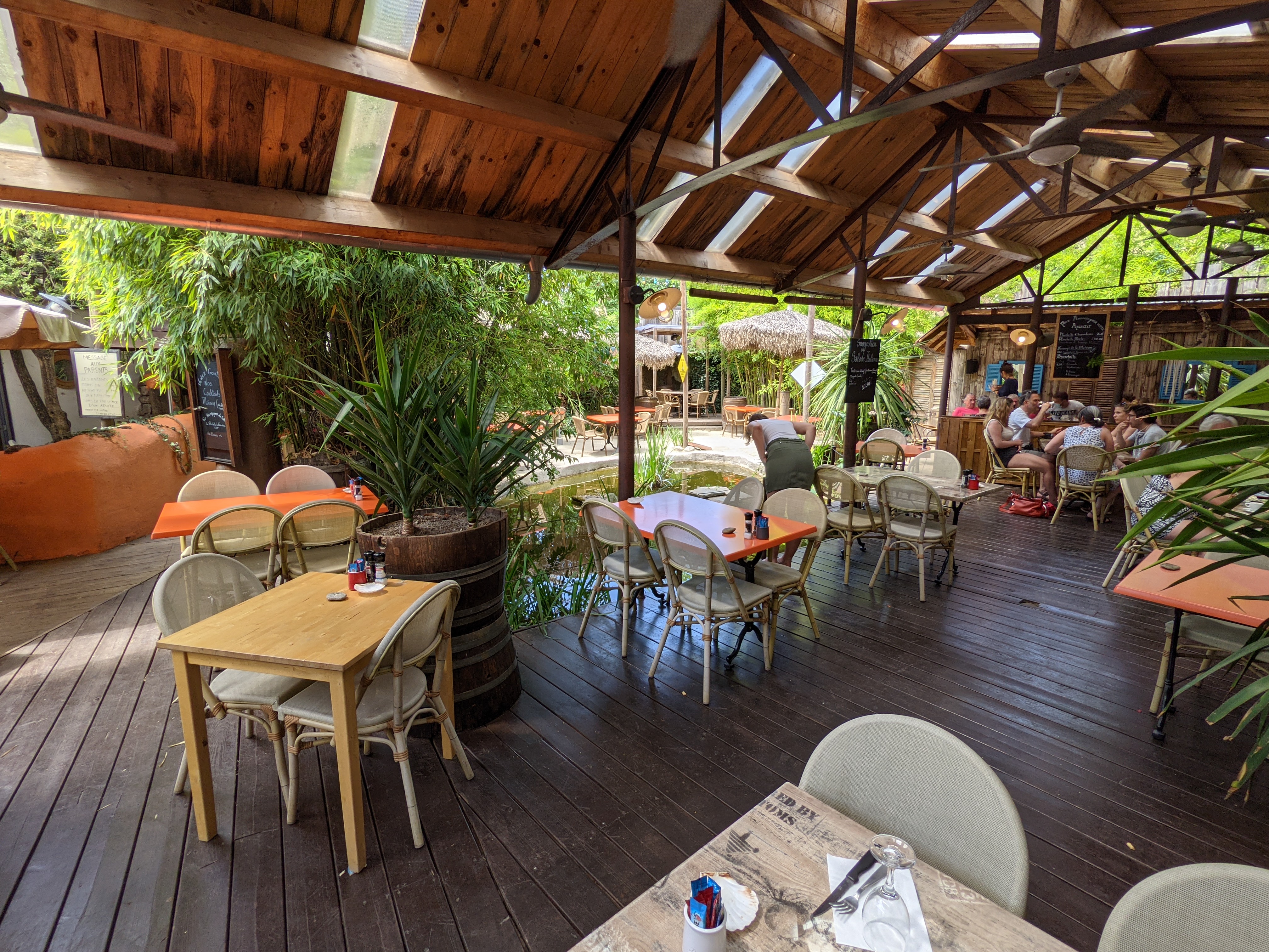 Super découverte. Une cours derriere le restaurant avec des tables, chaises, coins pour boir des cocktails, étang avec poissons et tortue. Service au top, rapide, serveur souriant qui a répondu a toutes nos questions. Magnifique cocktails. Carte variée avec des salades, pates, burger, viande .... Je recommande !