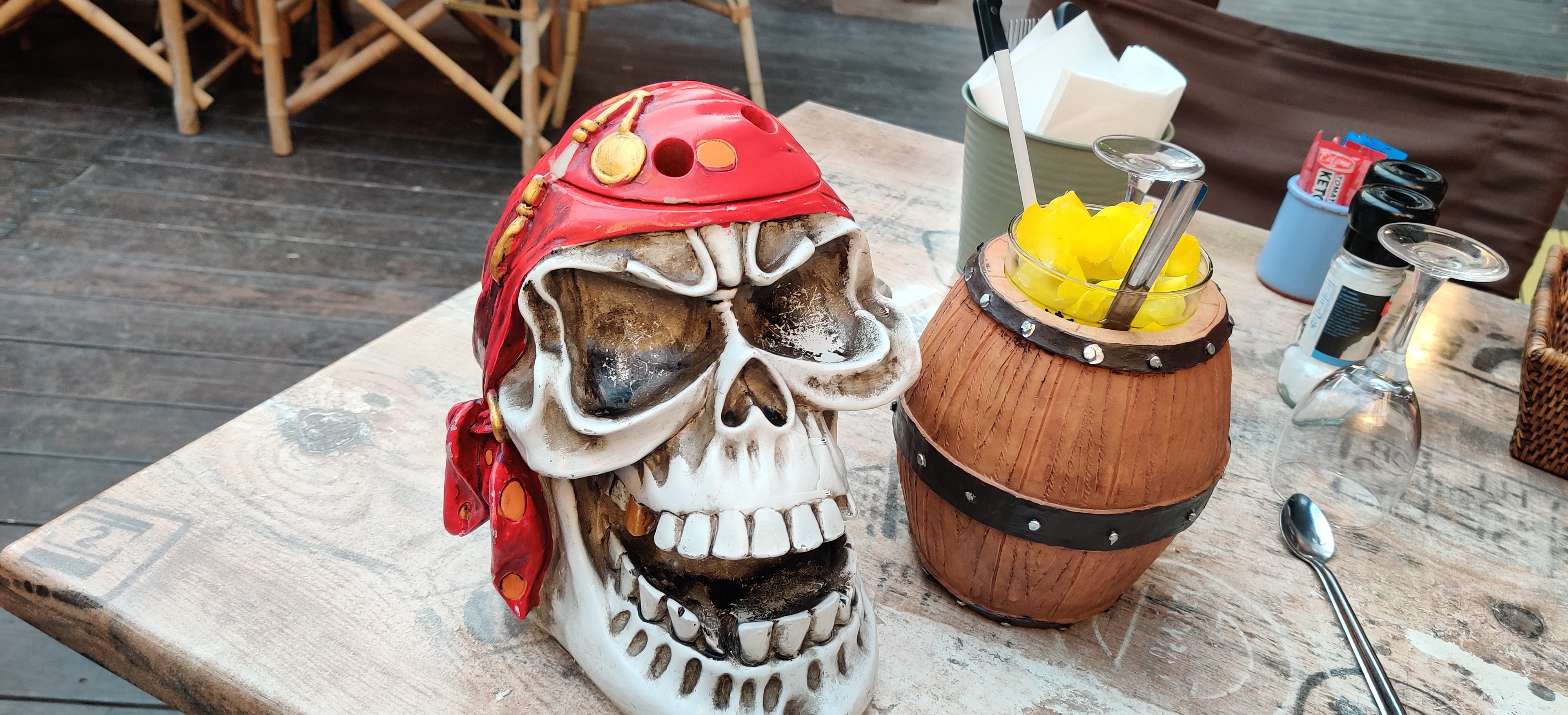 Un lieu qui sort de l'ordinaire sur un thème de piraterie avec une terasse sur sable fin et bananiers, un étang qui apporte un cachet. Un repas très qualitatif et une qualité de service irréprochable. Je recommande sans soucis ce lieu, surtout son extérieur.