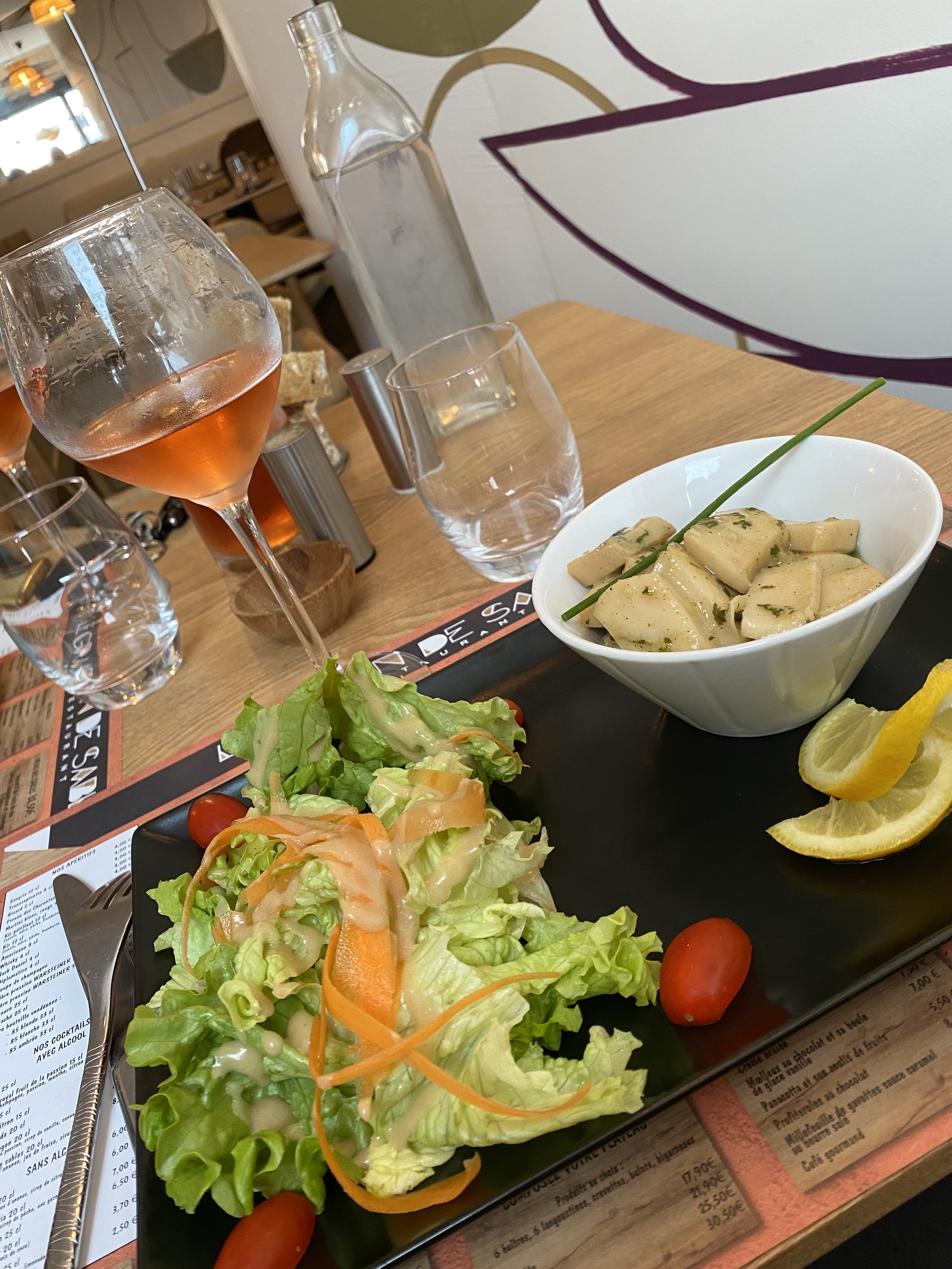Nous avons commandé 2 menus, pour lesquels nous avons été satisfaits. Néanmoins, nous avons été déçus du service et des sodas surtout, 2 cocas à 3.60€ l’unité (apportés déjà servis dans un verre (même pas 33cl), et non servis devant nous. À noter que nous avons découvert le prix grâce à l’addition, car les prix des sodas ne figurent pas dans le menu. Coca sans aucune bulle, un coca plat de chez plat…. Après l’avoir signalé, nous avons tout de même eu un geste du restaurant pour les sodas. Mais si vous voulez de l’eau aromatisée, c’est le meilleur restaurant, on vous sert une carafe d’eau avec un restant de ciboulette dedans… bref, les plats que nous avons choisis étaient quand même bons.