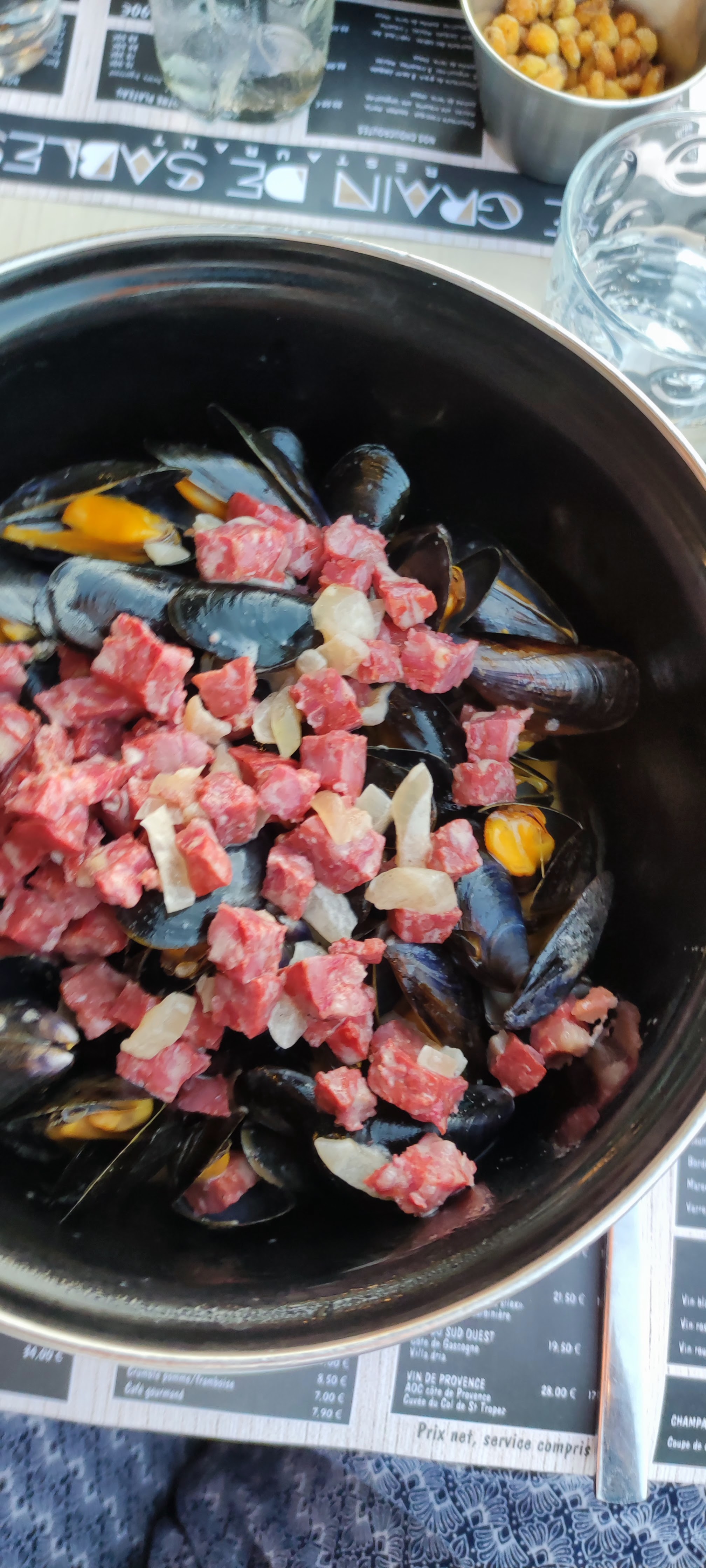 Frites qui n ont pas de goût et quantité insuffisante mais elles sont pas bonnes, c'est pas très grave. .. moules marinière cuites sans assaisonnement, juste 2 ou morceaux d oignons. Heureusement la moule elle même était très bonne La quantité du verre de vin très limitée et la part de dessert minuscule. Bref, pas Satisfait du tout