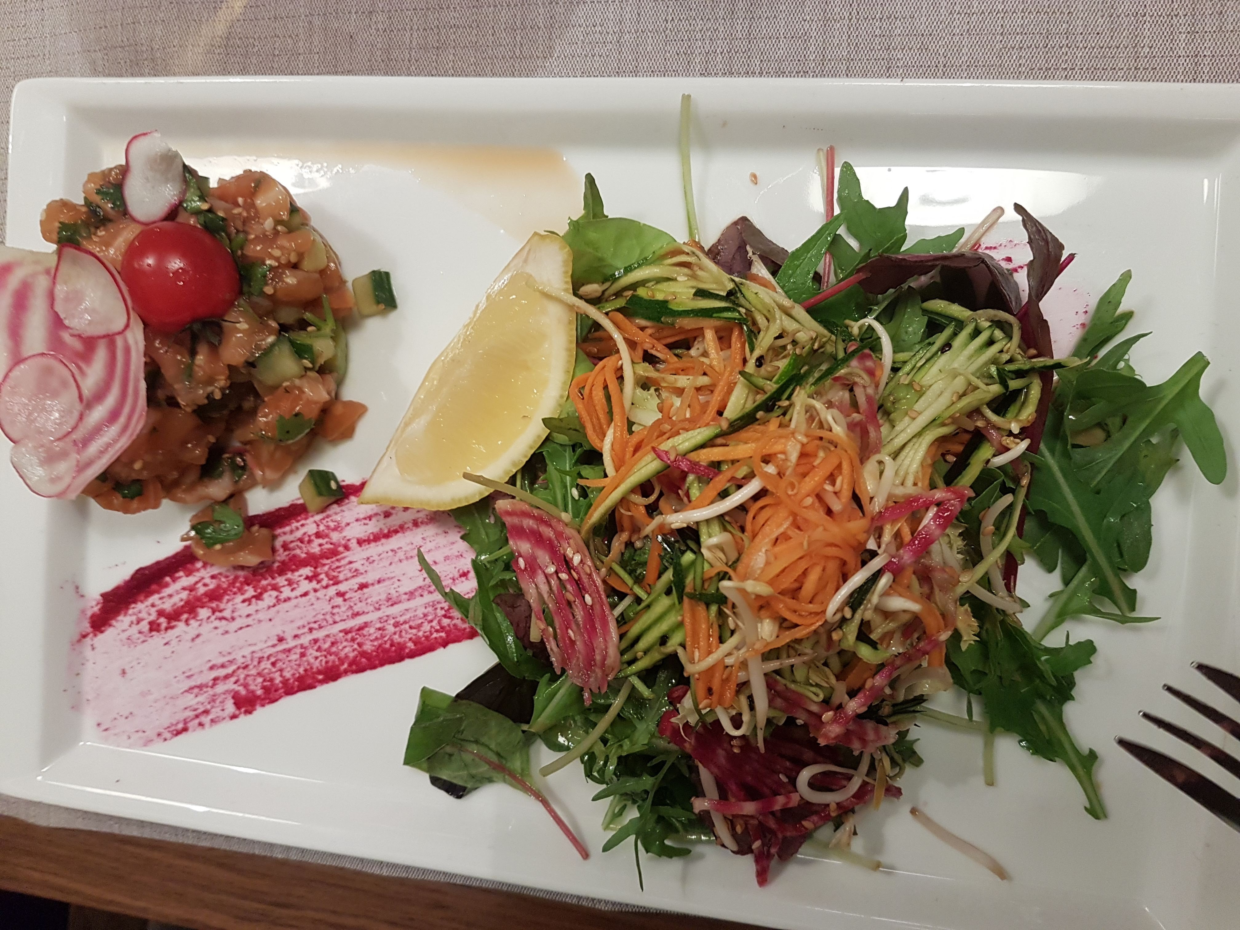 Tres jolie assiette et copieuse. La decoration est originale. Seul bemol, le temps de service mais nous sommes en pleine saison donc cela peut se comprendre. Javais pris le tartare de saumon facon thai, je me suis regalee.
