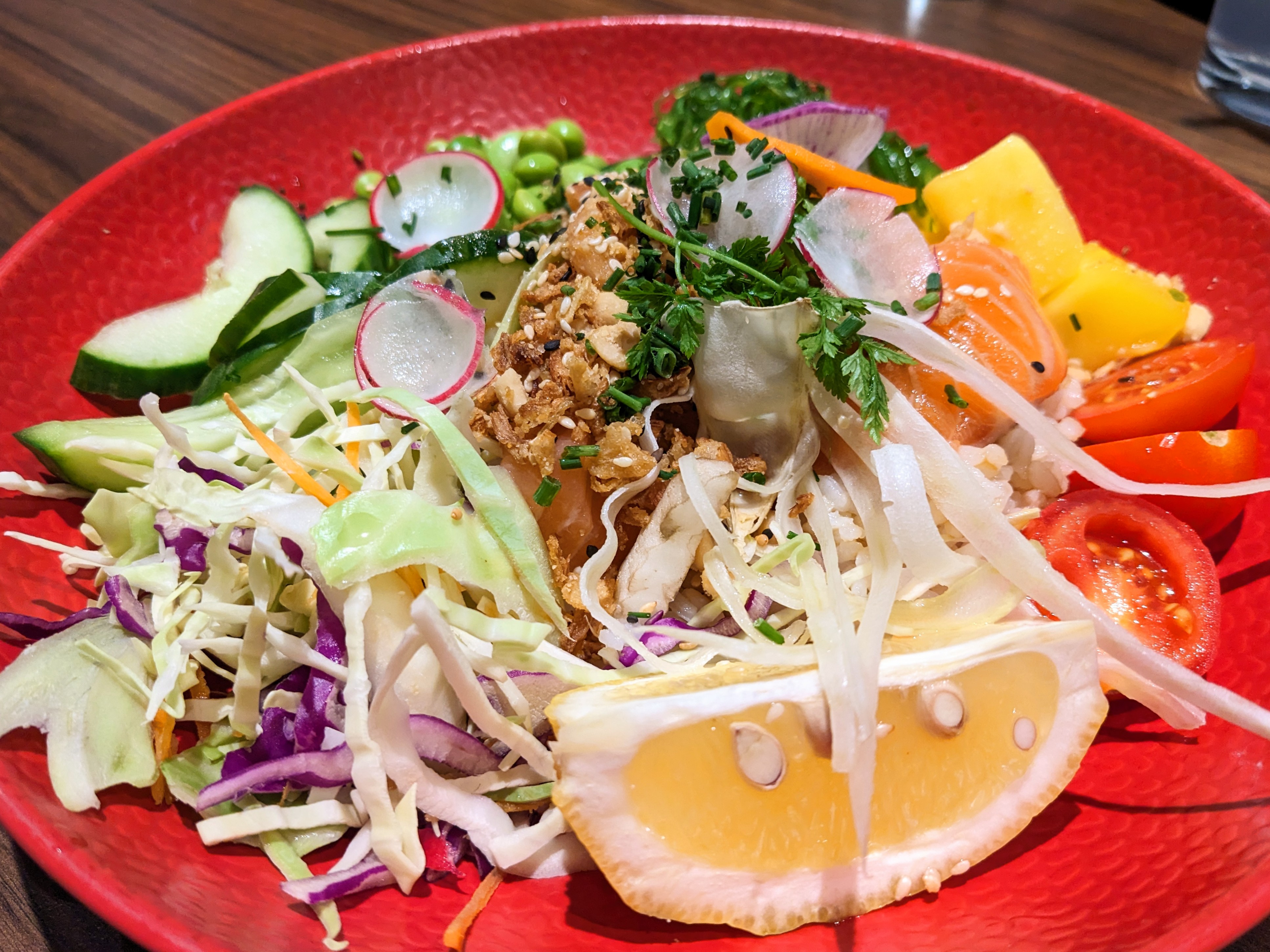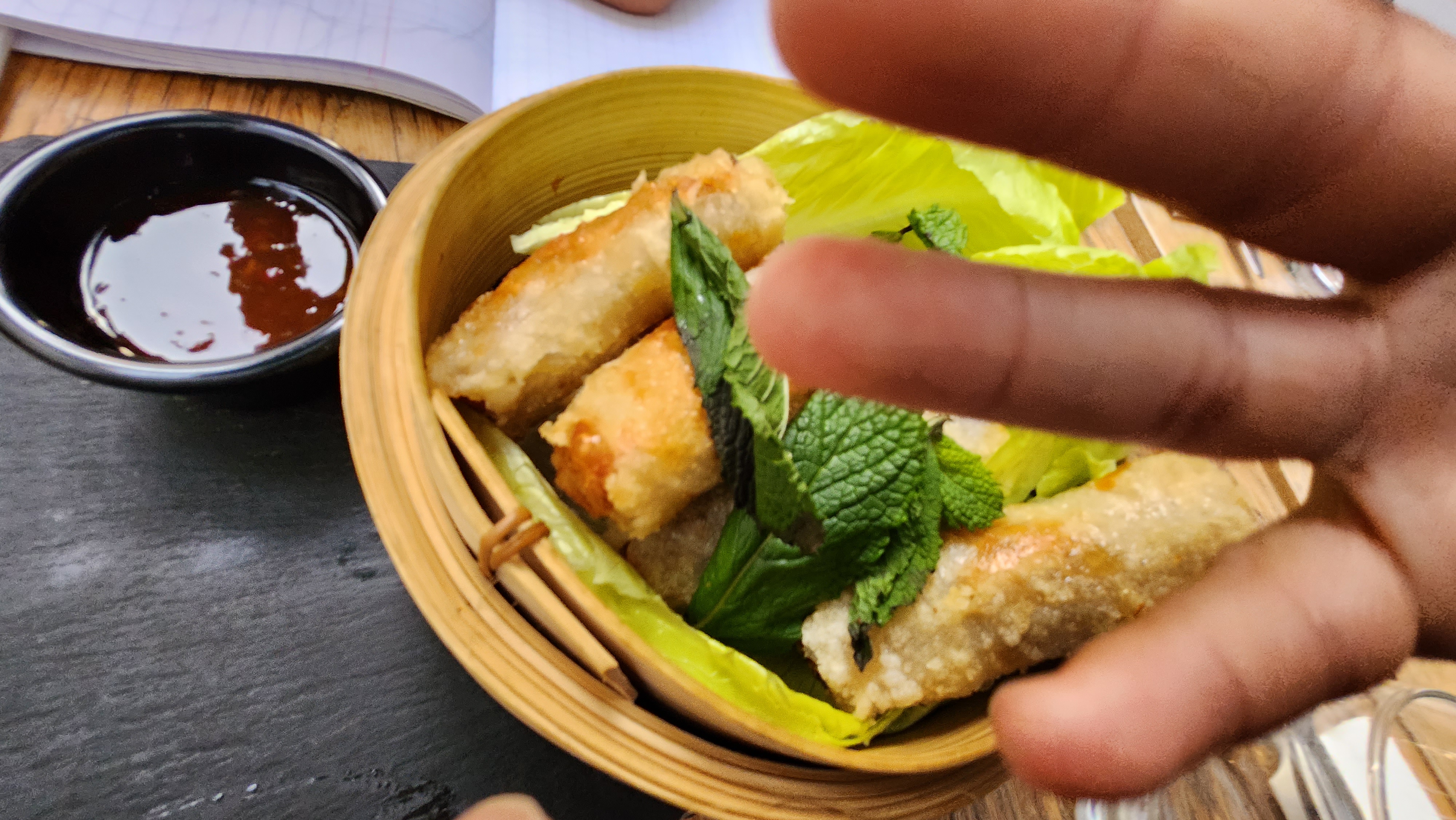 Nourriture décente. Le directeur principal et le serveur extérieur étaient super et nous ont incités à essayer. Malheureusement, nous étions à l'intérieur et avions un autre gars comme serveur qui était bourru, hostile et qui a ensuite disparu. Nous nous sommes retrouvés avec un serveur totalement différent qui allait bien, mais nous avons été longtemps ignorés. Les plats fusion asiatique étaient trop sucrés. Les petits eggrolls (Kem) étaient frits.