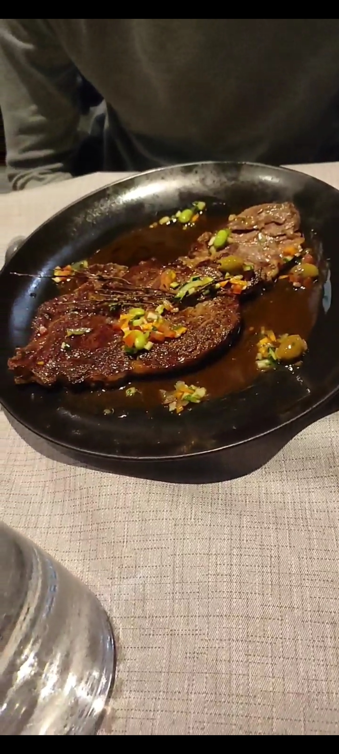 La nourriture était bonne. Nous avons pris un steak grillé. L'entrée était fantastique mais les crevettes étaient servies sans nettoyer le dos. Je ne sais pas si c'est la seule façon de le servir ainsi. Le steak est très bon ainsi que les desserts. L'endroit est très lumineux, ils ont mis 10 chaises sur une toute petite table. Vous ne vous sentez pas à l'aise en étant assis là. L'ambiance est très bonne et c'est un style un peu familial.