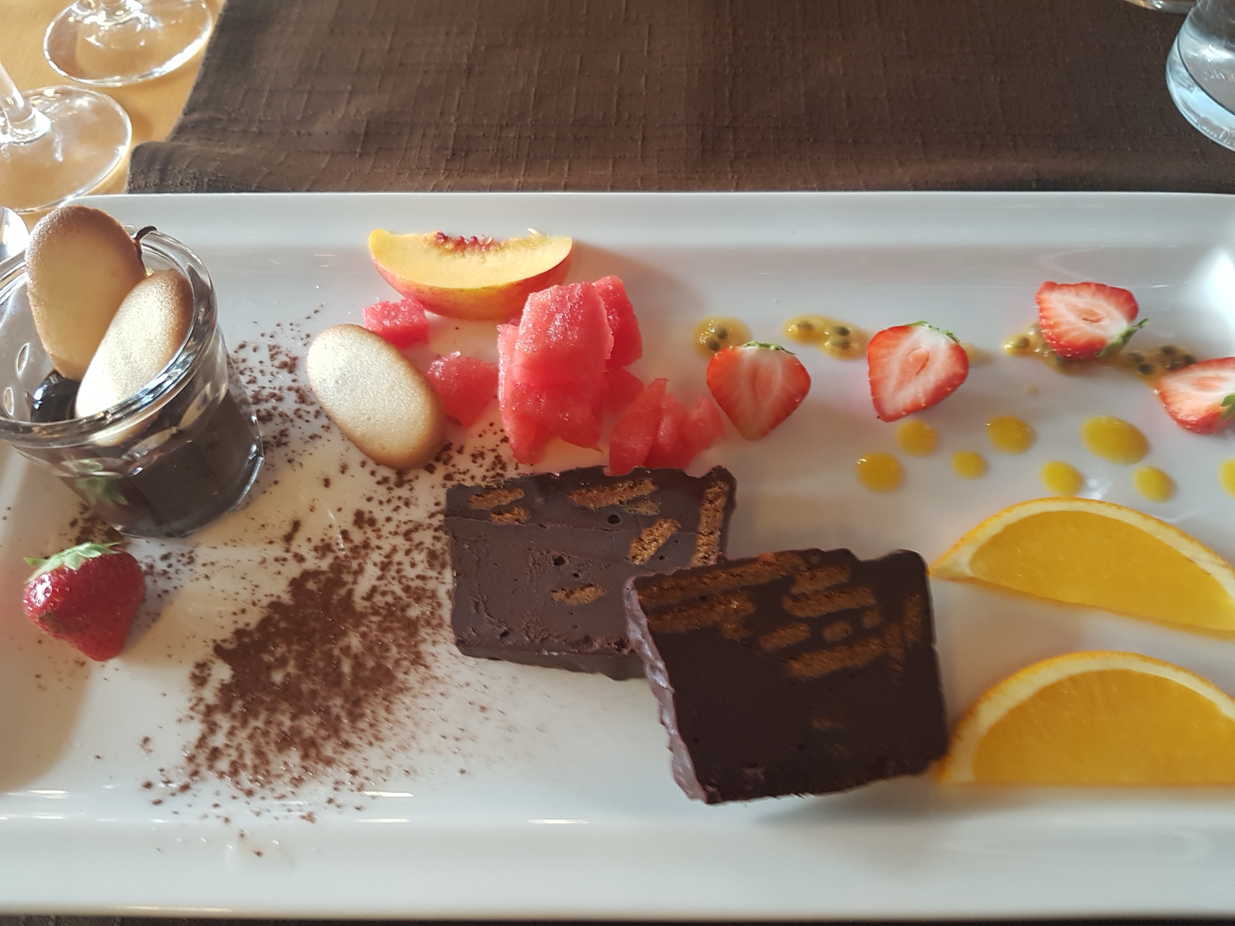 Très belles assiettes où les fruits s'accordent très bien avec les plats seul petit bémol le temps d'attente entre les plats. Il ne faut pas avoir un RDV après vous êtes sûr de le louper. À essayer quand même vous ne serez pas déçu. Bonne rapport qualité prix