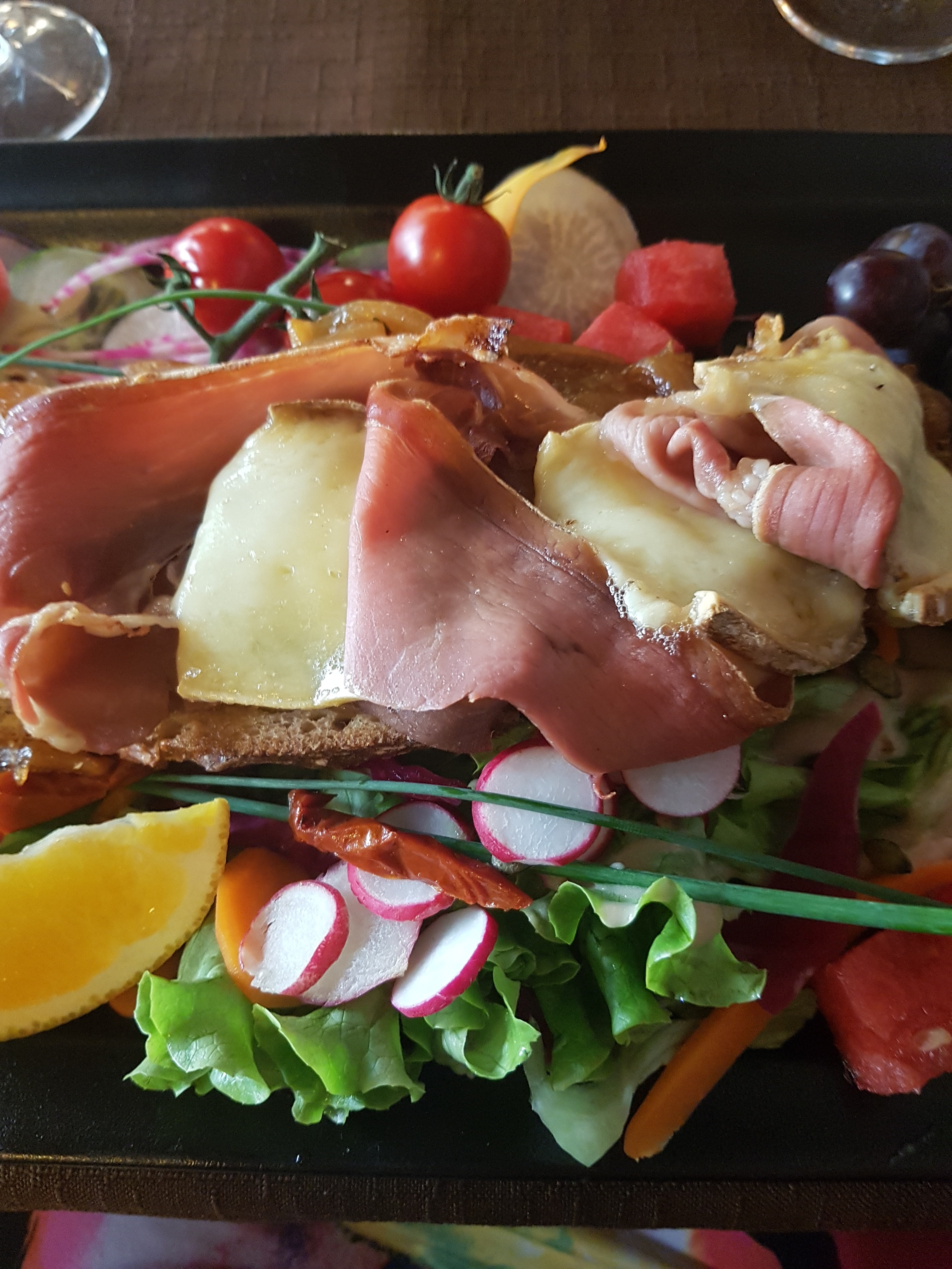 Très bon repas, une tartine savoyarde savoureuse et copieuse accompagnée d'une salade composée variée.