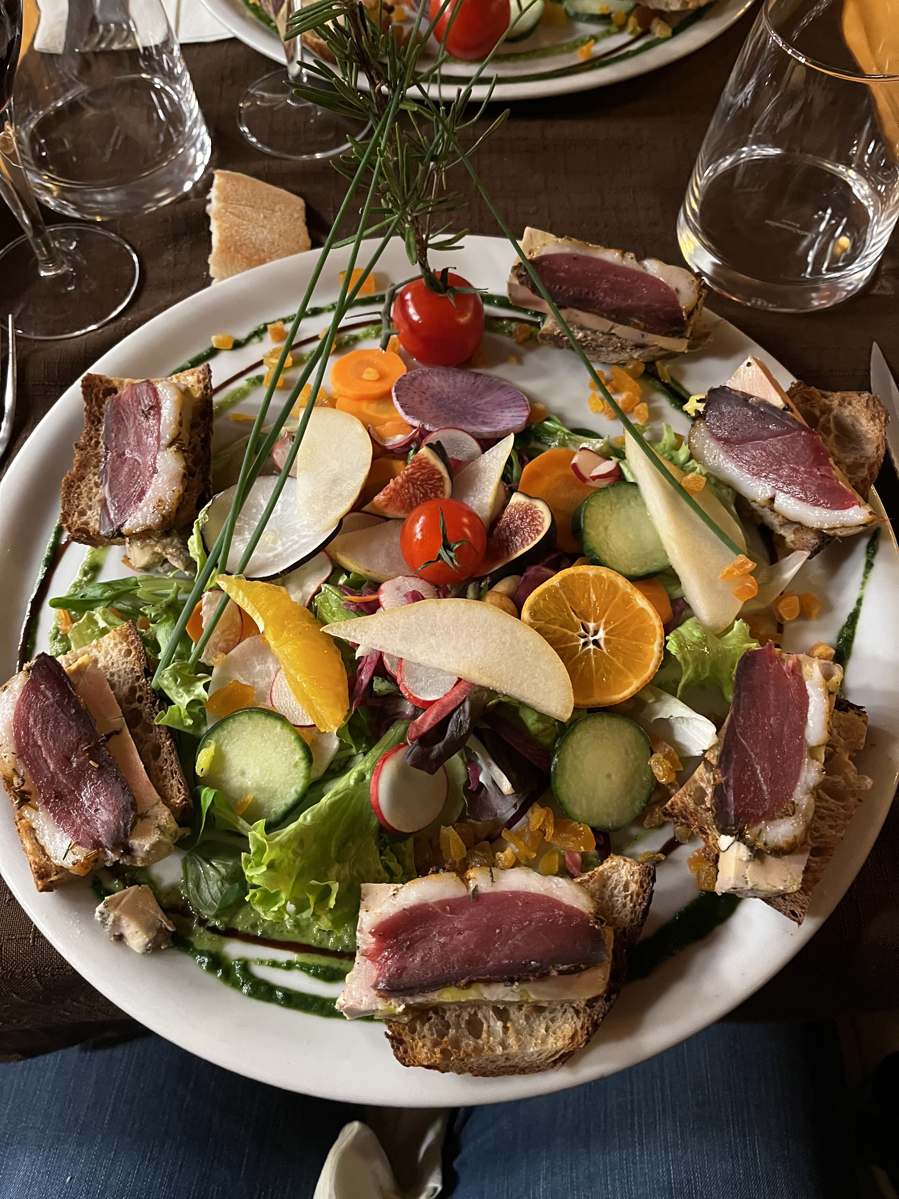 Venu en famille à 8 personnes, le service en sourire, la cuisine en quantité et en qualité font le repas excellent. J'ai pris une tartine Gasconne avec foie gras, magret, etc.., et, avec une terrine de chocolat en dessert. La variété est dans l'assiette, cela change du classique salade et pas de mauvaise lourdeur. Vraiment un bon moment. Gardez cet esprit, c'est un gage de longévité et c'est apprécié du gourmet que je suis. Merci et bonne dégustation à ceux qui arrivent.