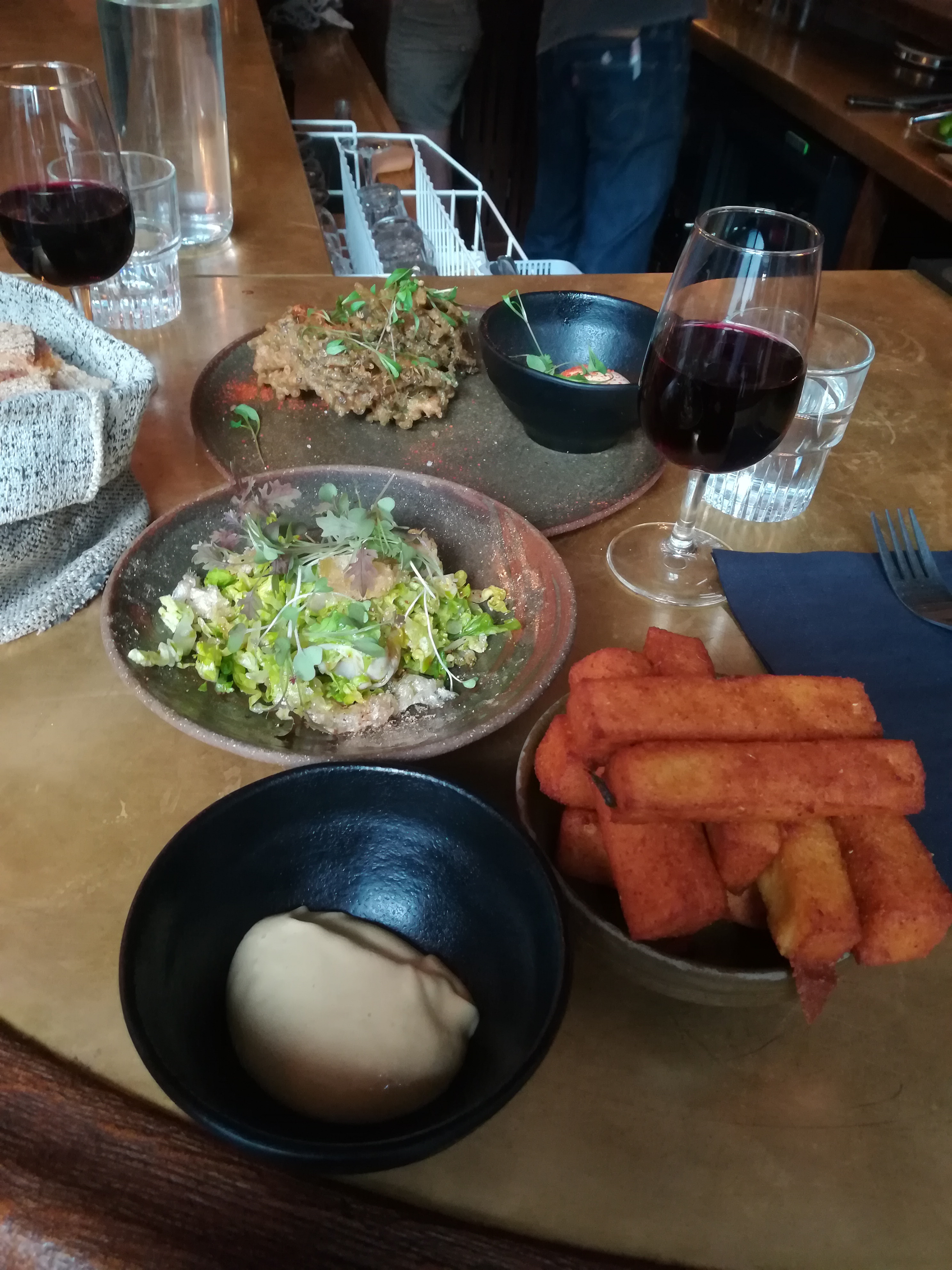 Restaurant de tapas créatifs . Bons produits , associations inventives . Gros coup de foudre pour les panisses ( en plus ça cale, ce qui est jamais anodin dans un restau qui vous sert des petites portions....) Vins naturels bio dynamiques ou les deux ( je sais plus ) à prix doux . Gros bémol : le bruit . Mais pourquoi mettre la musique aussi fort ? Ajoute à l écho de toutes les voix dans ce petit endroit , on sort épuisé . Entre temps on a renoncé à avoir une conversation un peu suivie avec son ami et on est impatient de sortir , totalement vidé... Messieurs les propriétaires , on peut créer un endroit cool dans mettre la musique à fond .... pensez y ...