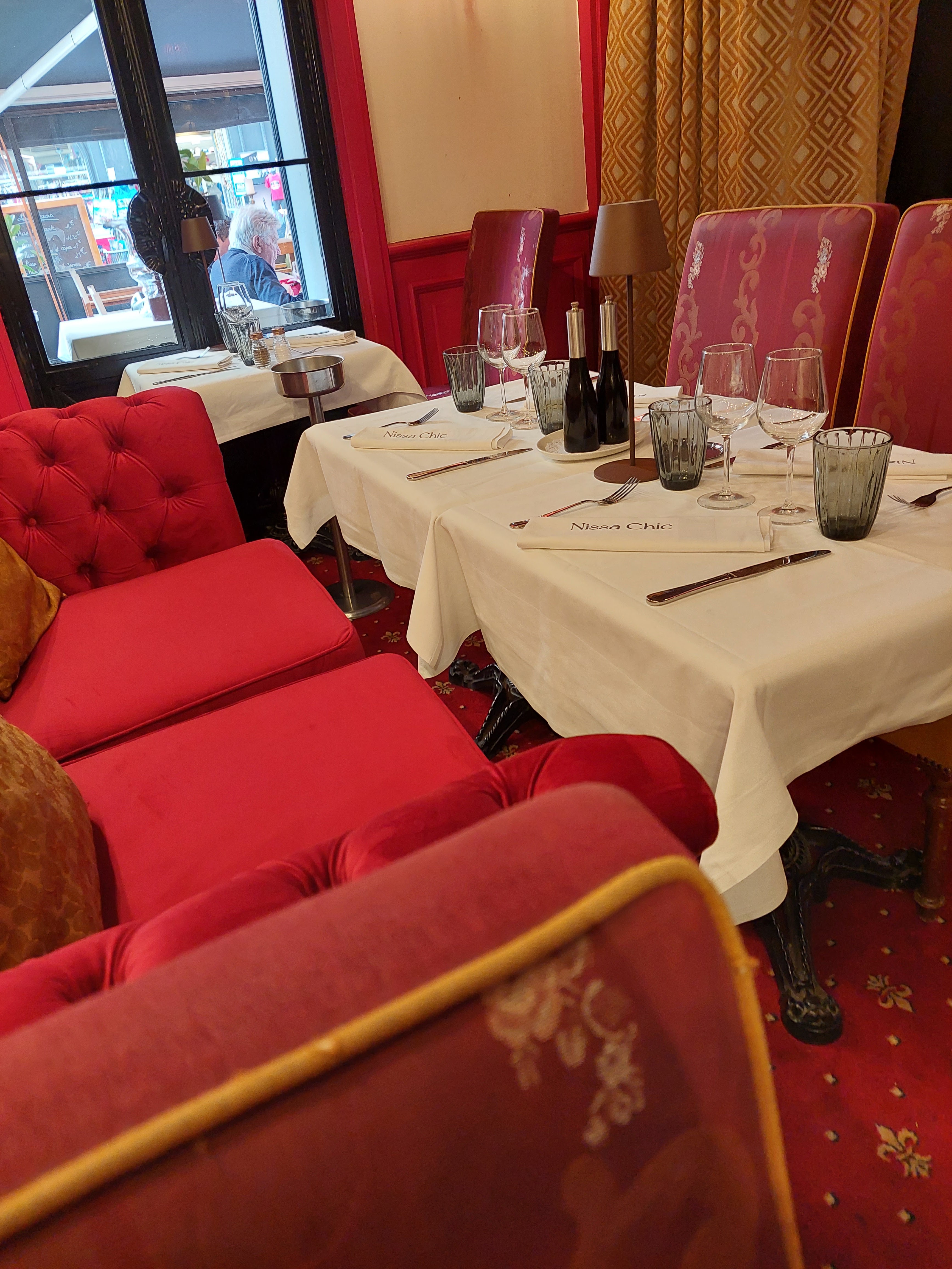 Restaurant juste avant d'entrer dans le cours Saleya , à droite .Terrasse agréable et soignée. Salle chaleureuse avec des sièges confortables, des tables bien mises , de la moquette au sol , des tentures , des tableaux de maître aux murs , (Rembrandt, reproductions ), de la musique d'ambiance . Une seconde salle au fond à droite , et les toilettes à gauche. Les plats sont bien cuisinés, les vins sont bons.Le café est soit un Espresso soit un Américano, il n'y a pas de café allongé . Le service est sérieux et attentif, mais il ne faut pas faire la moindre observation. Les prix sont en concordance avec le niveau du restaurant.