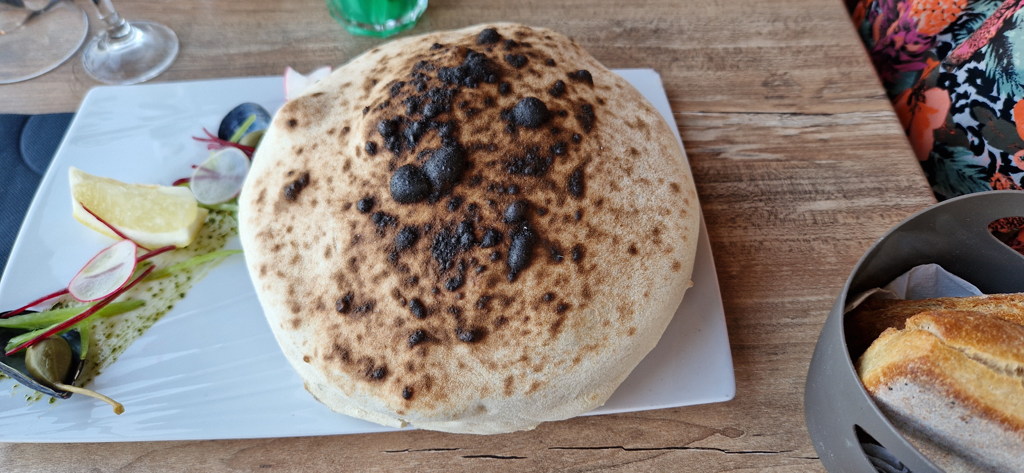 En dehors du cadre qui fait penser à mi-chemin aux plages des Caraïbes ou aux allures de Bretagne (oui oui! En gros un lieu magique) la carte est simple et raffinée : produits frais, pizzas délicieuses (patte napolitaine) et l’accueil parfait - merci à vous !