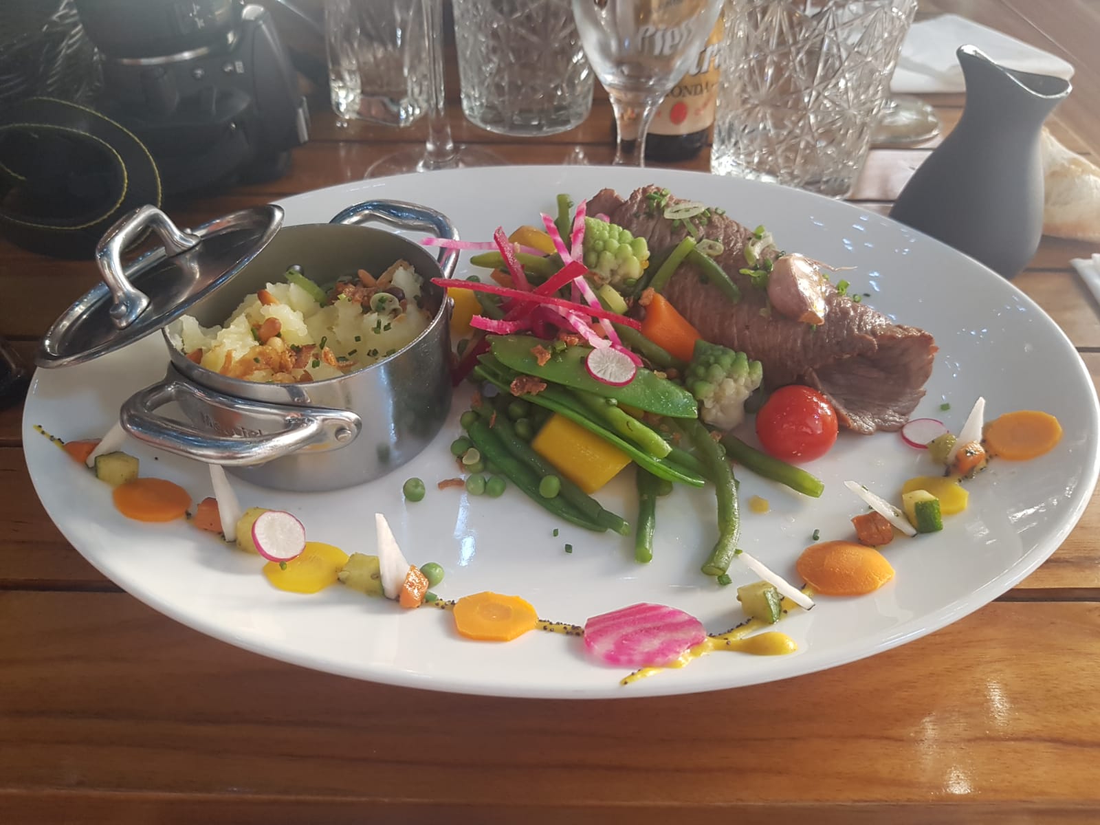 Cadre magnifique seulement ! On a eu l impression de déranger : 25 min ! Service express ! Les tables au soleil sont disponibles que pour les connaissances. Saute de veau tiède et sec. Dommage !