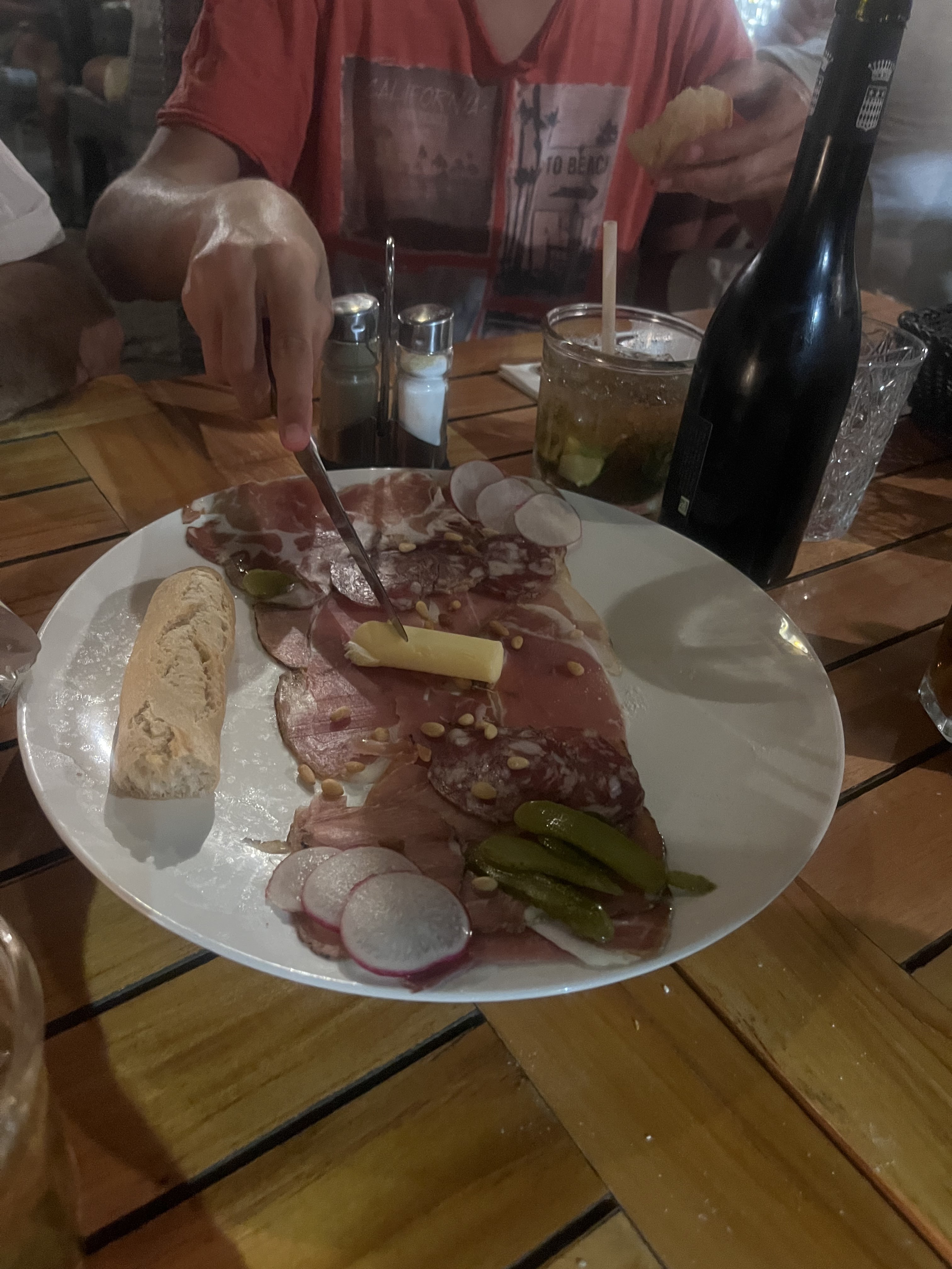 Déçus tout les 2 globalement. En 10 minutes, on est venu nous demander 4 fois si nous avions fait notre choix, entrée qui arrive alors que nous venions de débuter l'apéro. Menu à 26 € déconseillé. Je n'ai préféré pas prendre de photos des entrées tellement elles étaient minuscules. L'assiette de charcuterie : deux (ou une? car découpée dans l'assiette en plusieurs bouts) très fines tranches de jambon cru et carpaccio de poulpe idem. Le plat, ça allait. Arrangeant pour le remplacement du riz par des légumes qui étaient bons. Raison des deux étoiles. Je souhaitais emporter le gâteau à la châtaigne pour mon père, pas car j'avais trop mangé, mais parce que les deux desserts proposés au menu n'était pas à mon goût. On m'a dit que c'était impossible car il faisait trop chaud...