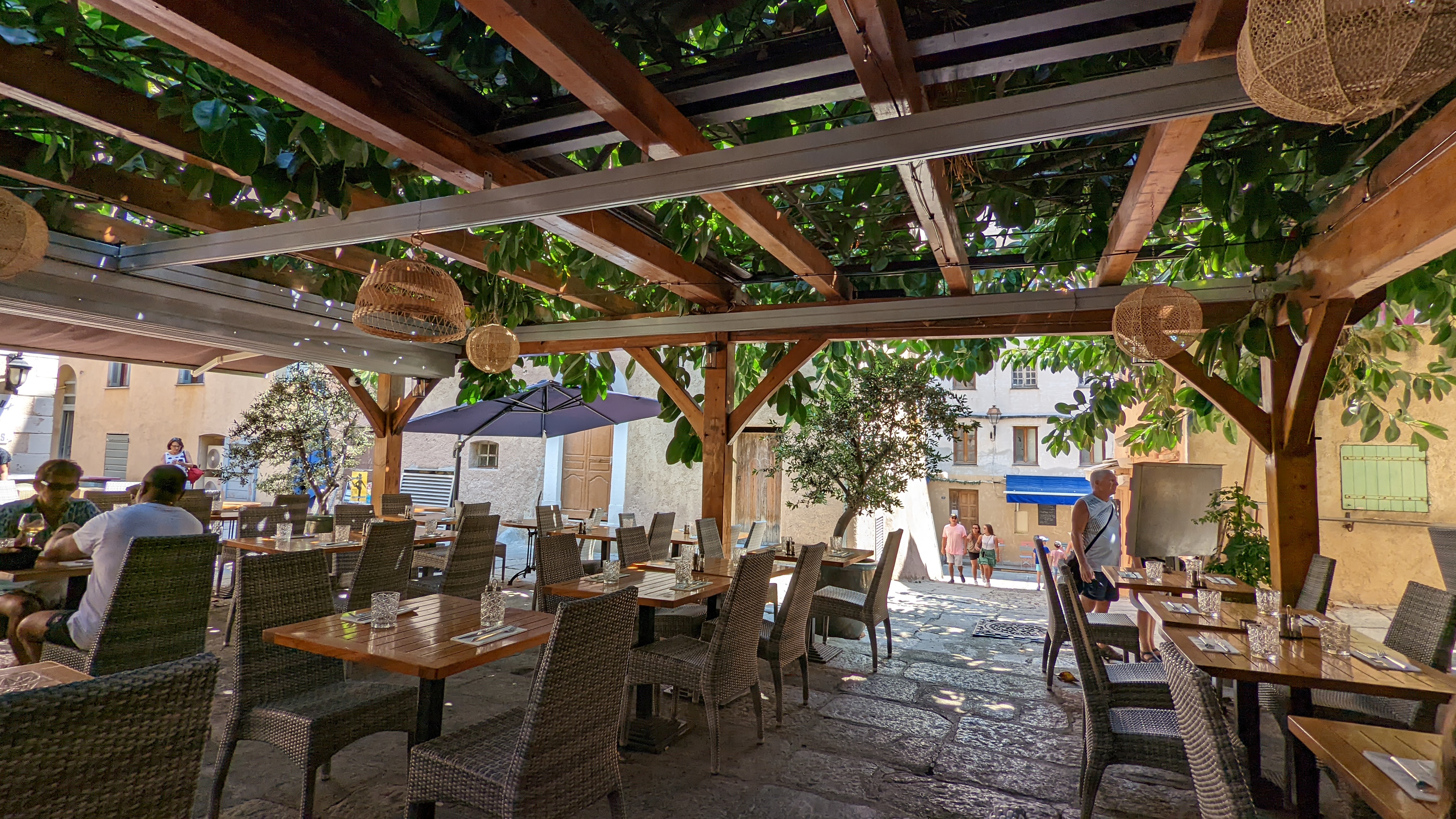 Abritée sous un bel arbre caoutchouc, la terrasse est agréable pour déguster des plats de qualité au milieu d’une petite rue piétonne de L’île Rousse. Les ravioles du chef étaient délicieuses et les frites maisons sont un vrai plus. Une raviole supplémentaire et un Mojito un peu plus grand aurait été apprécié. La qualité est à la hauteur du prix.